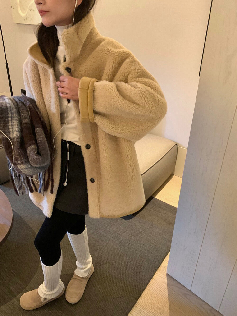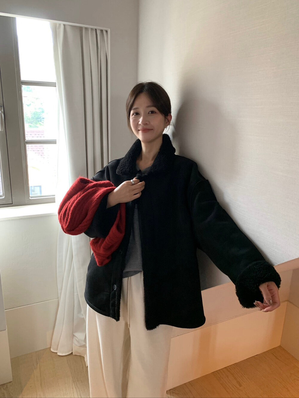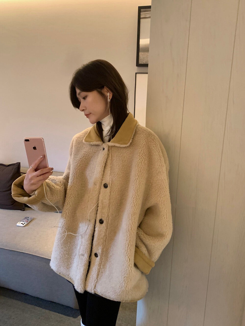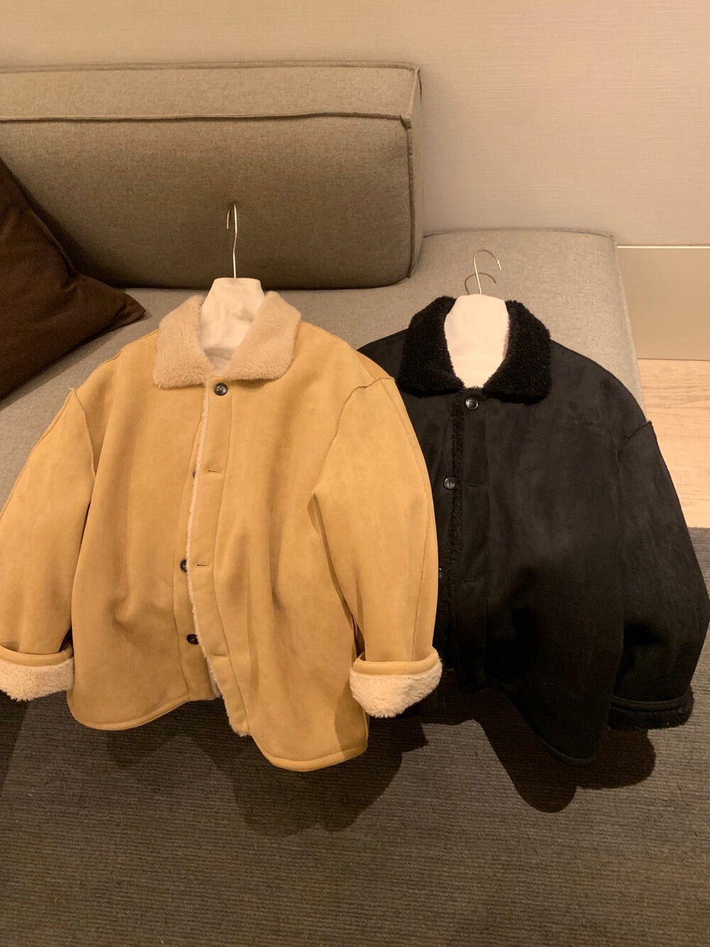 // 可雙面穿皮毛一體翻領中長外套