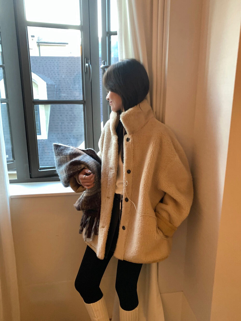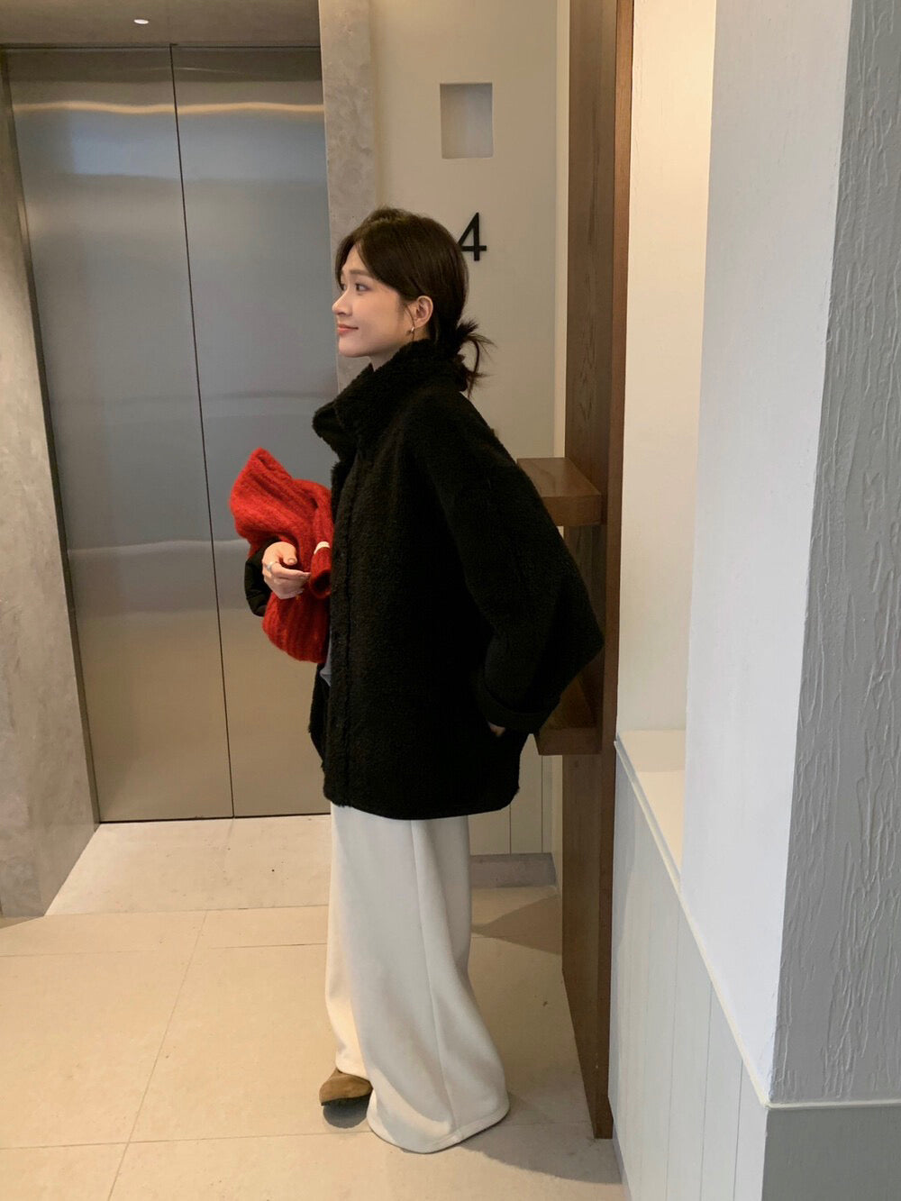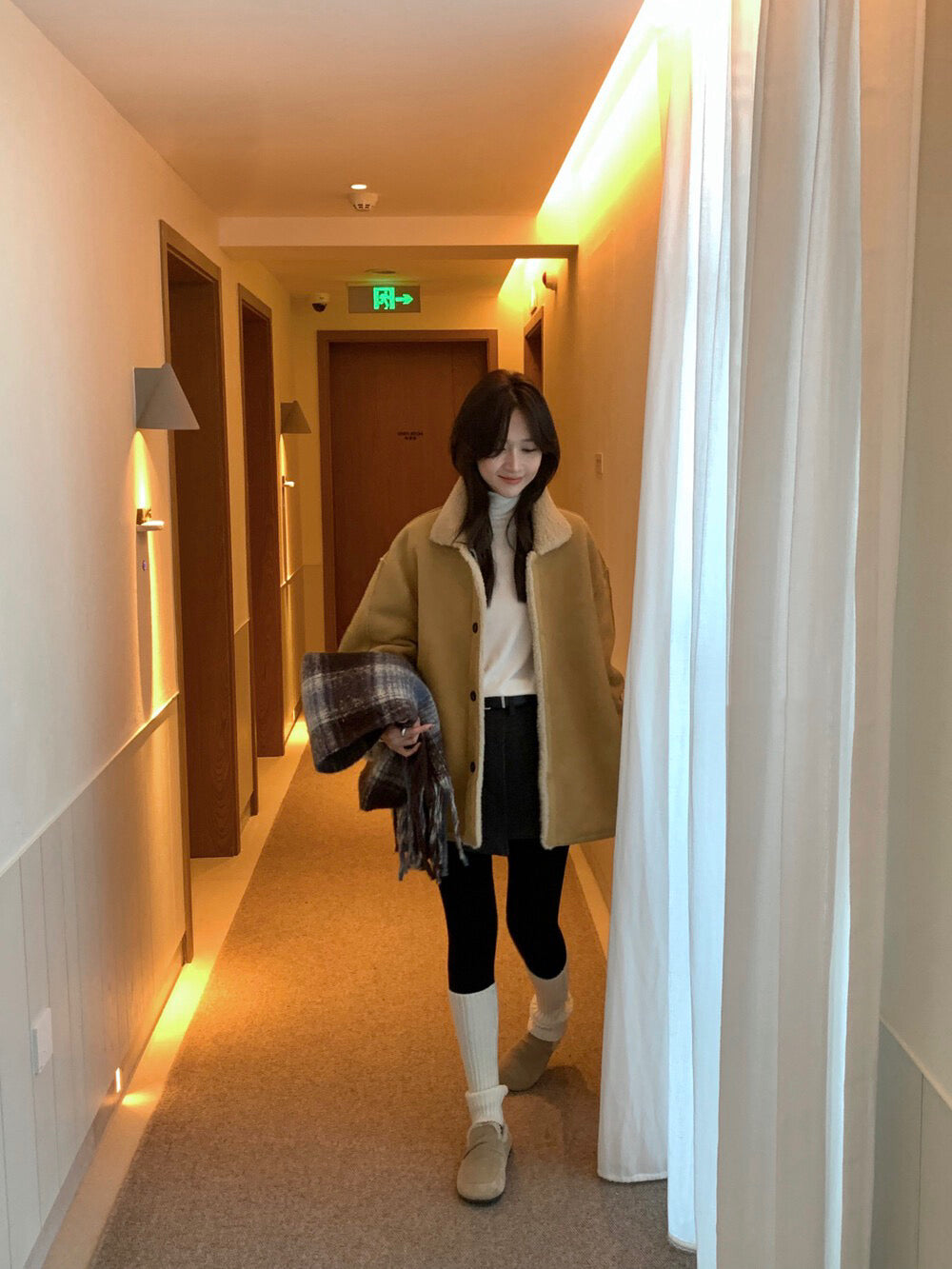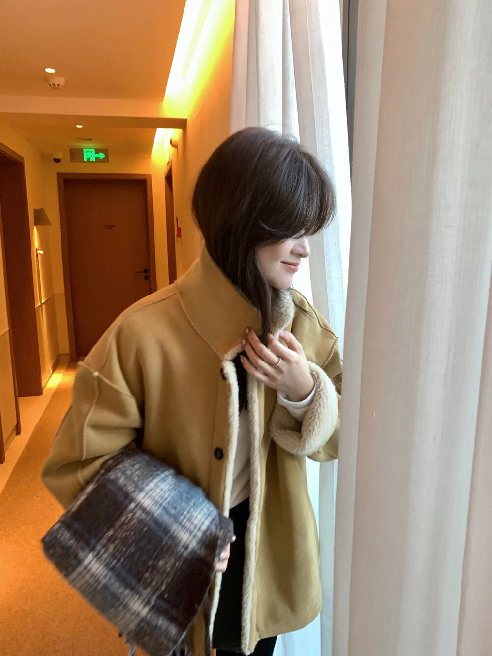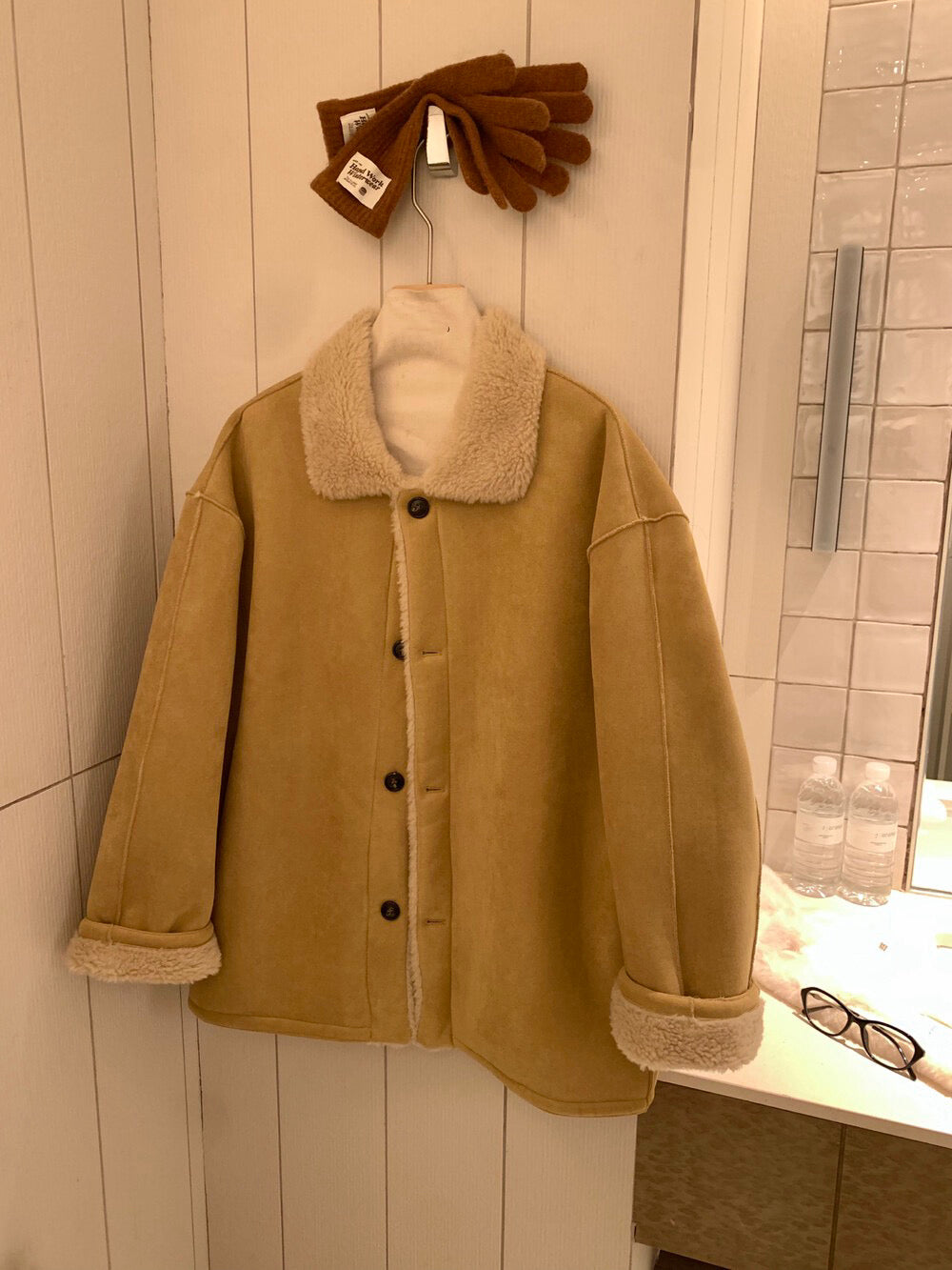 // 可雙面穿皮毛一體翻領中長外套