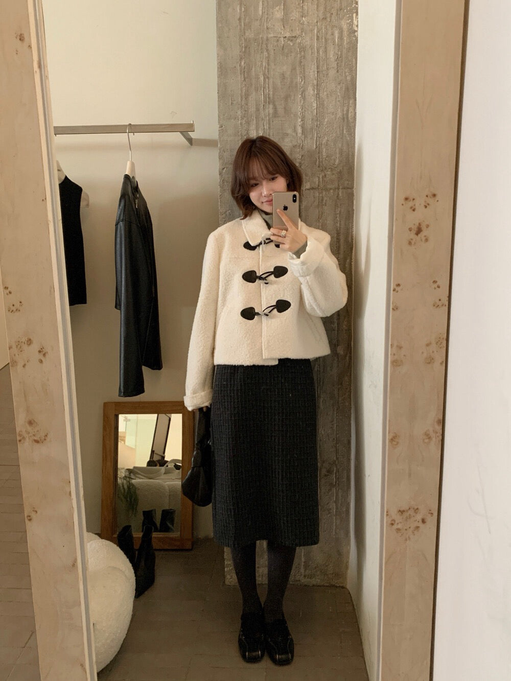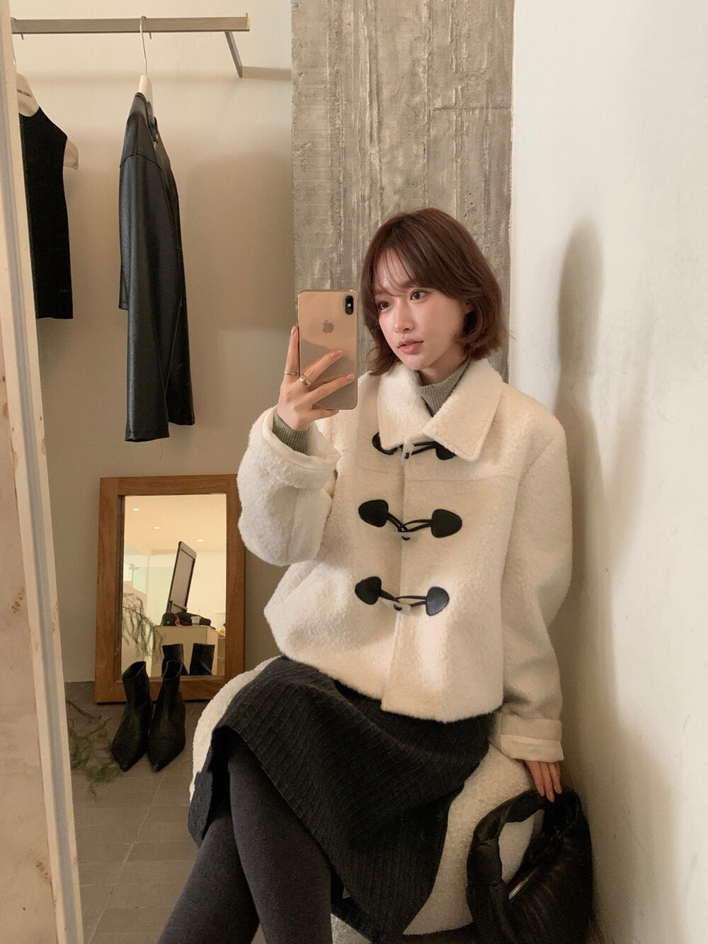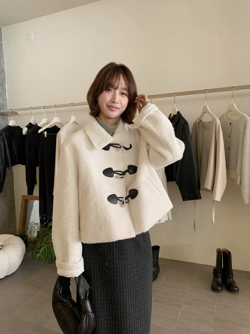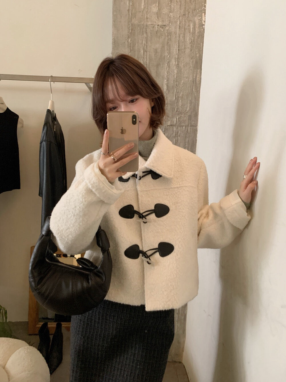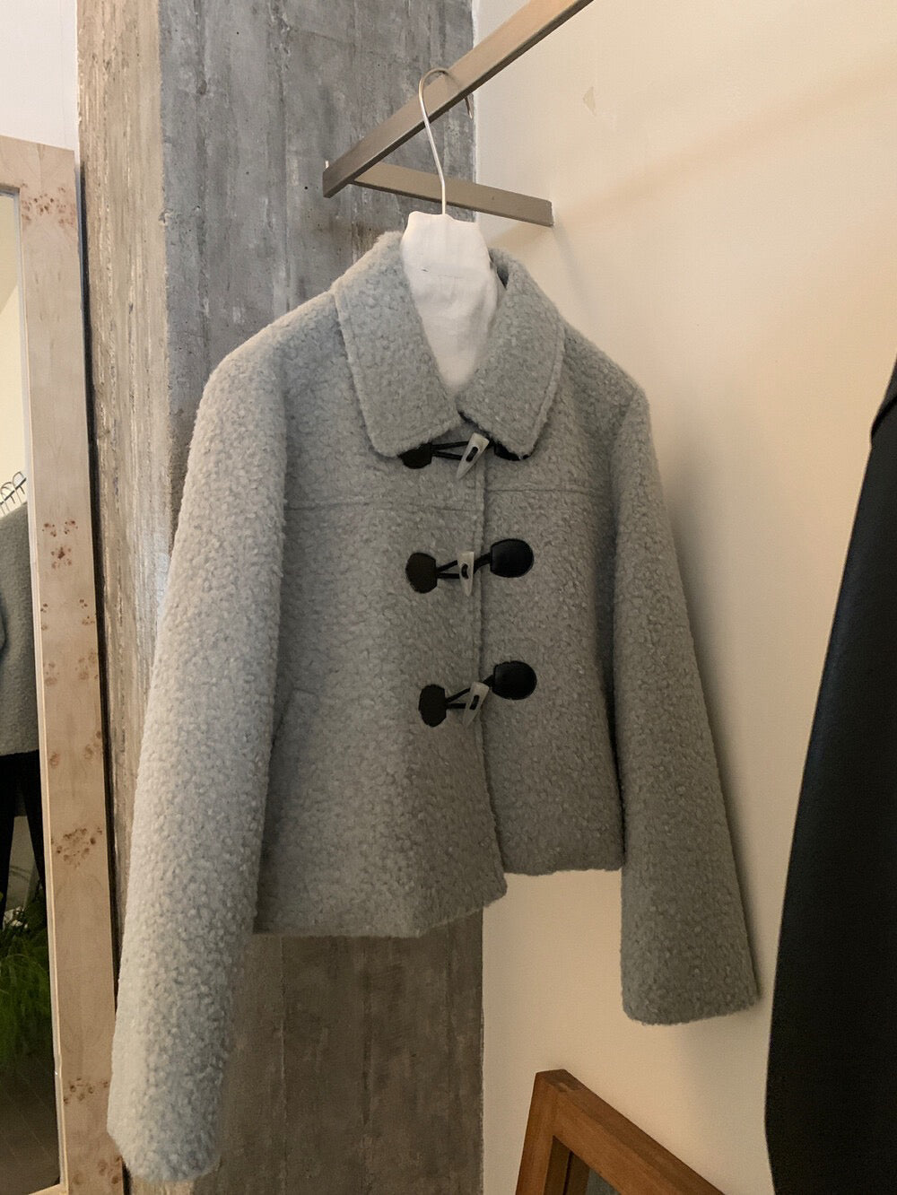 // 圈圈絨翻領正肩牛角鈕夾棉外套