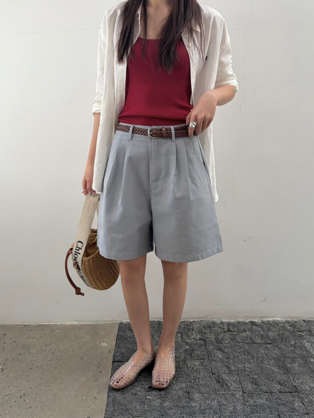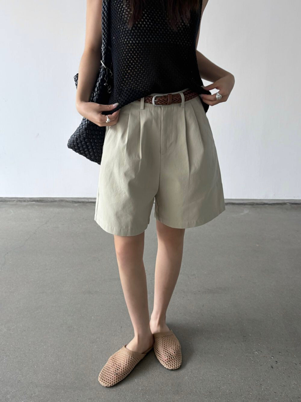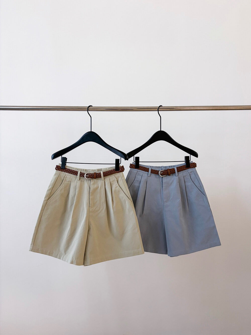 // 壓褶廓型遮肉五分短褲(連編織腰帶)