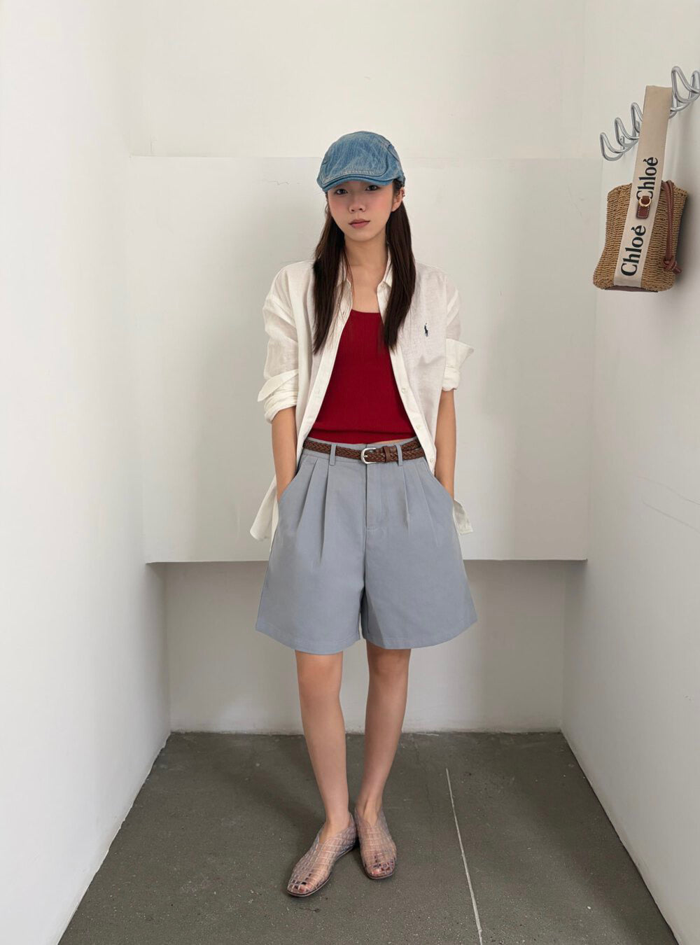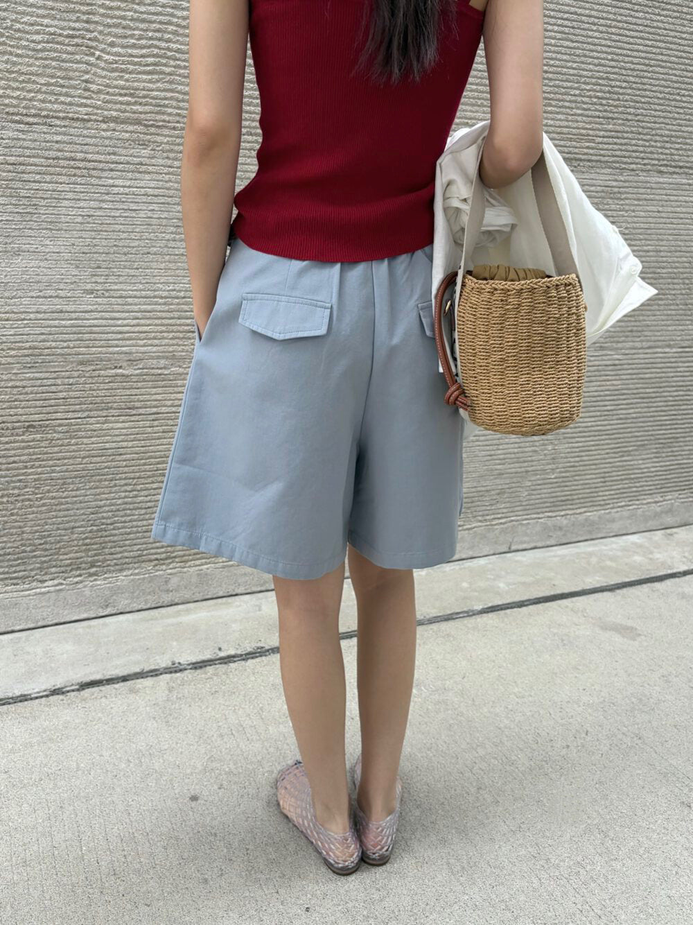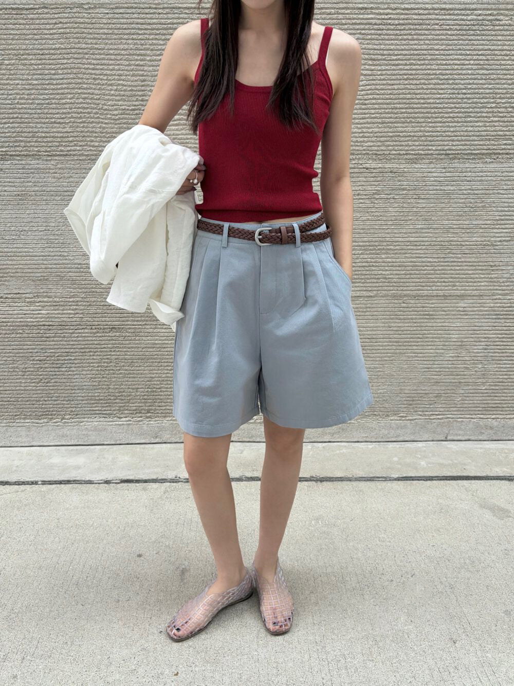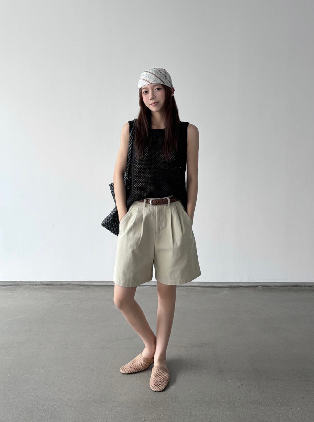 // 壓褶廓型遮肉五分短褲(連編織腰帶)