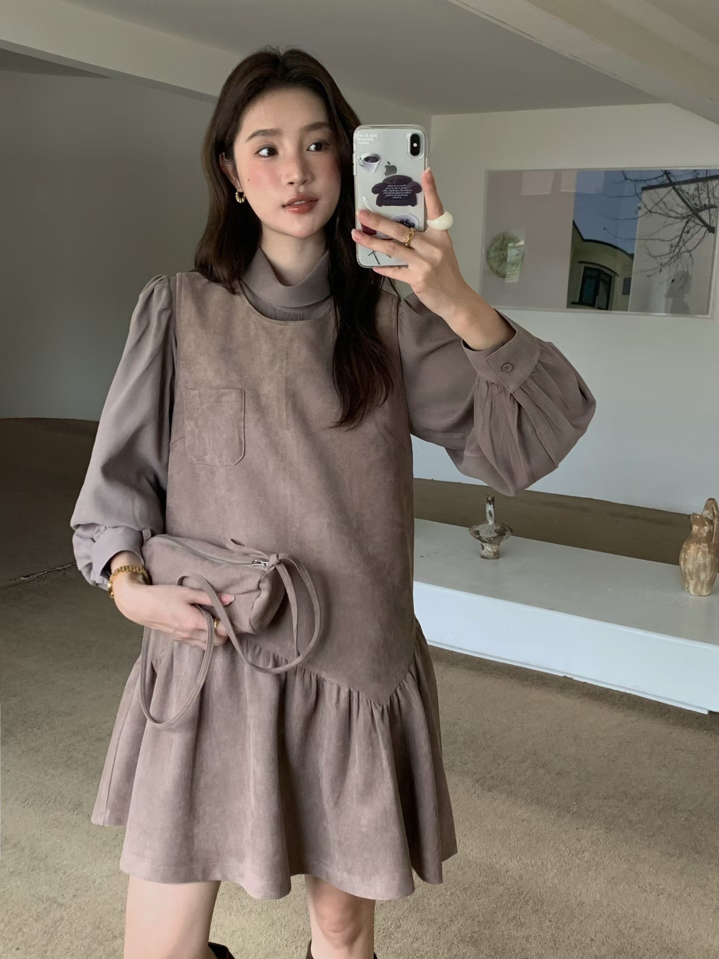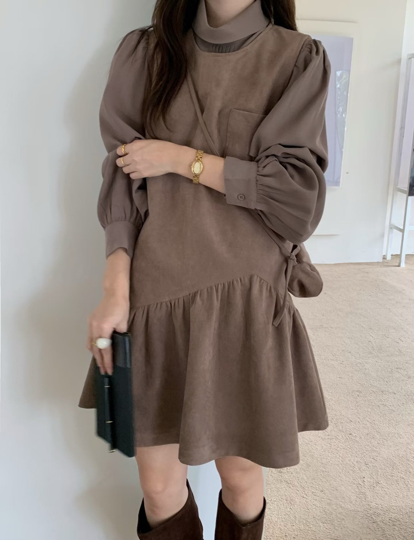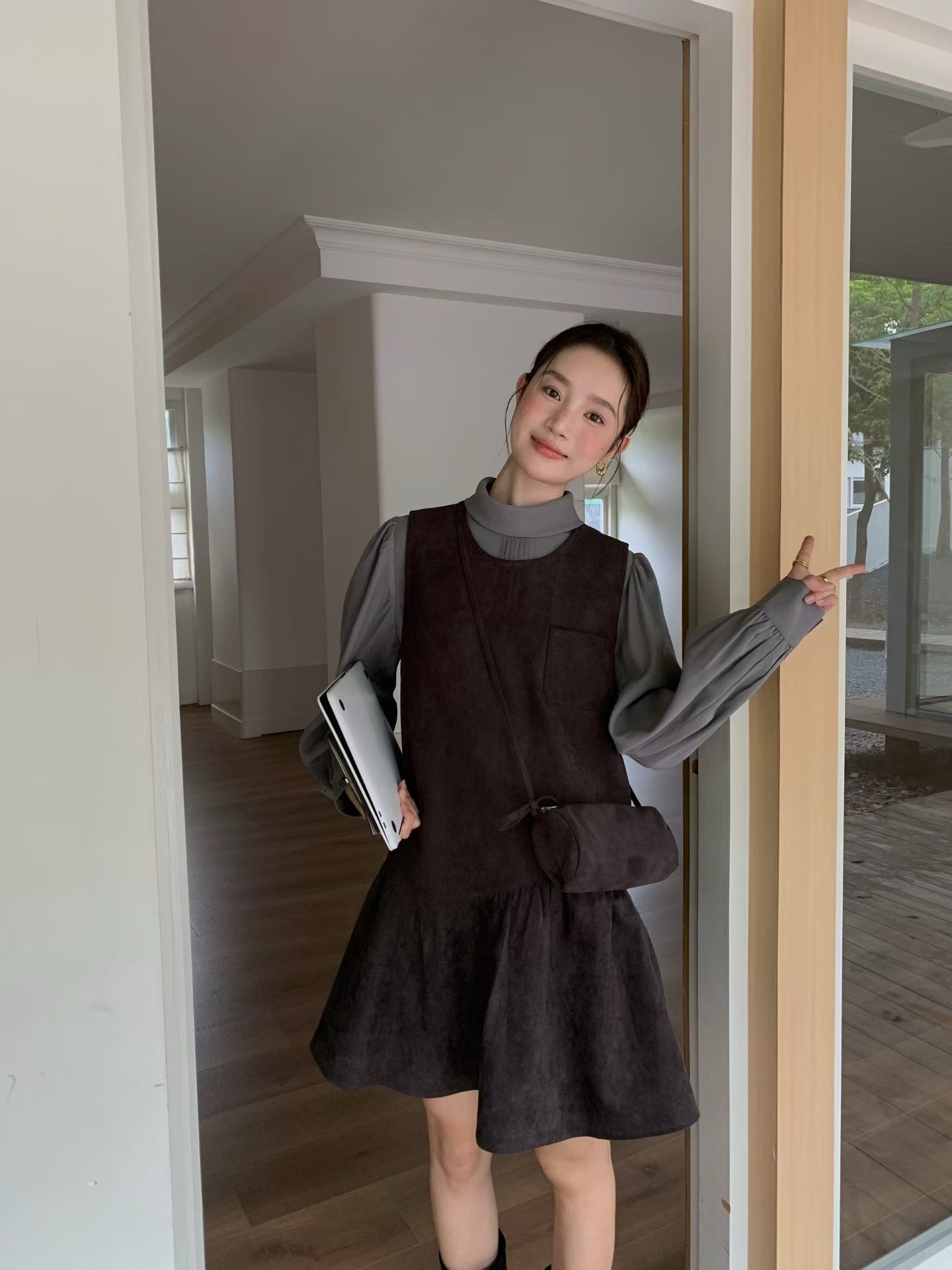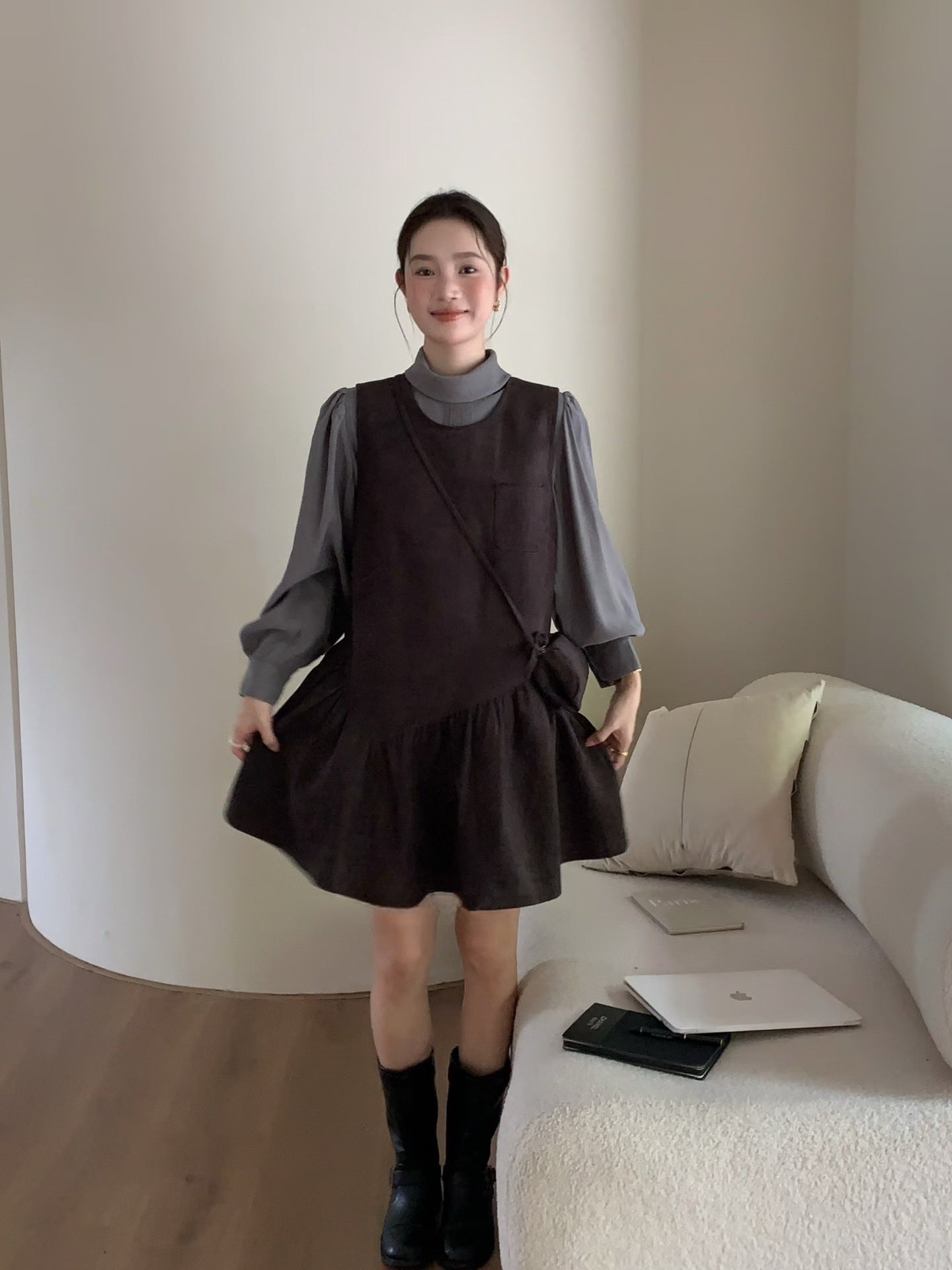 // 壓褶翻領silky BL+麂皮絨荷葉腳背心OPS套裝(連袋仔)