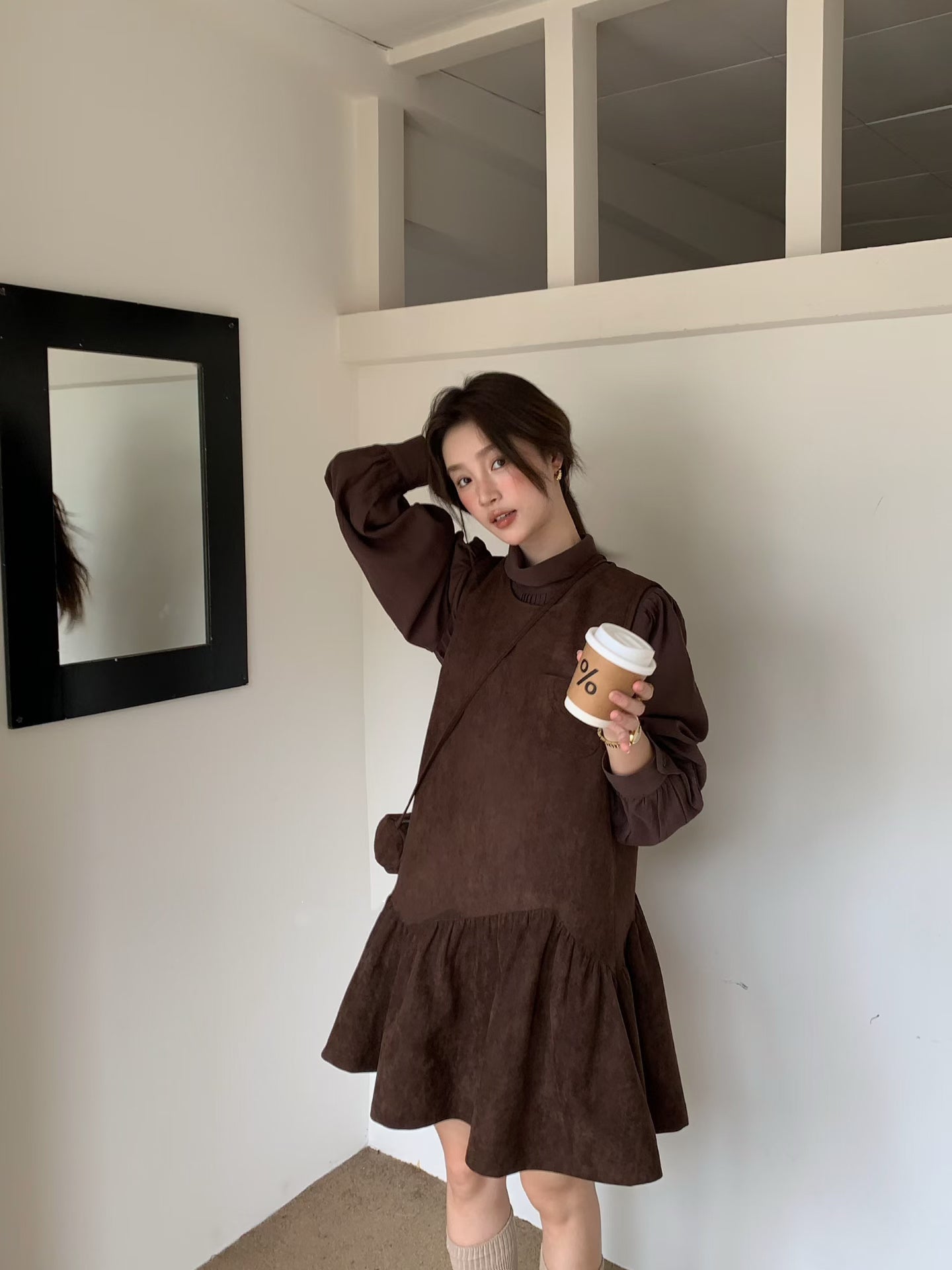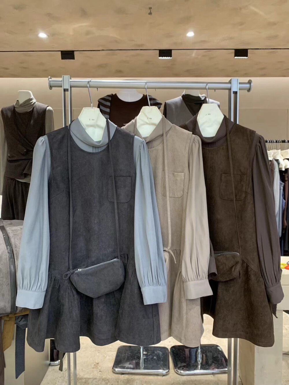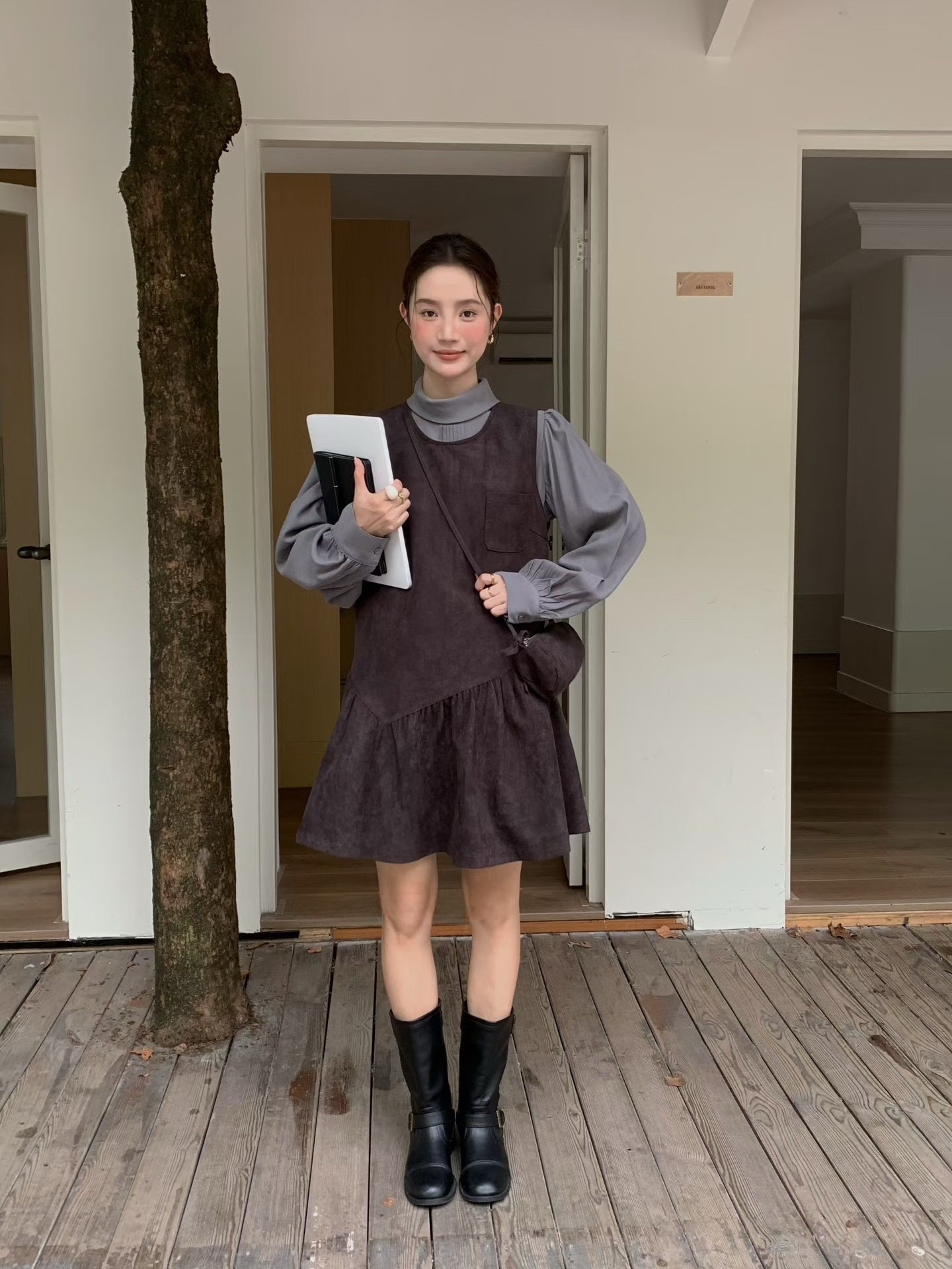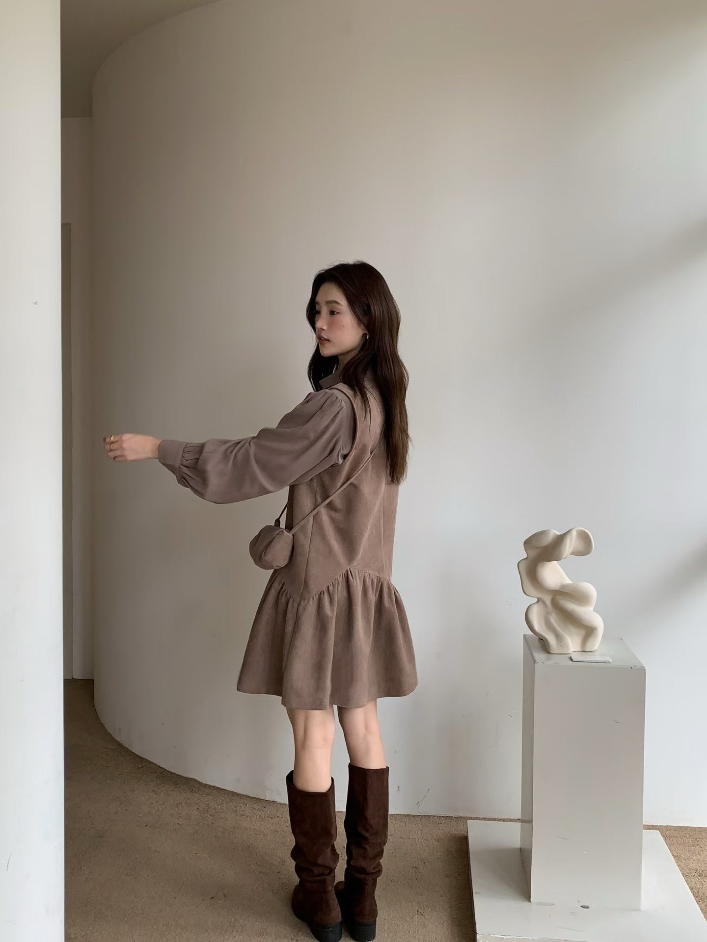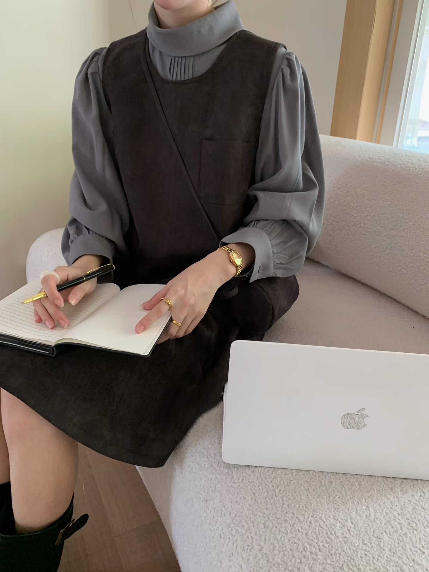 // 壓褶翻領silky BL+麂皮絨荷葉腳背心OPS套裝(連袋仔)