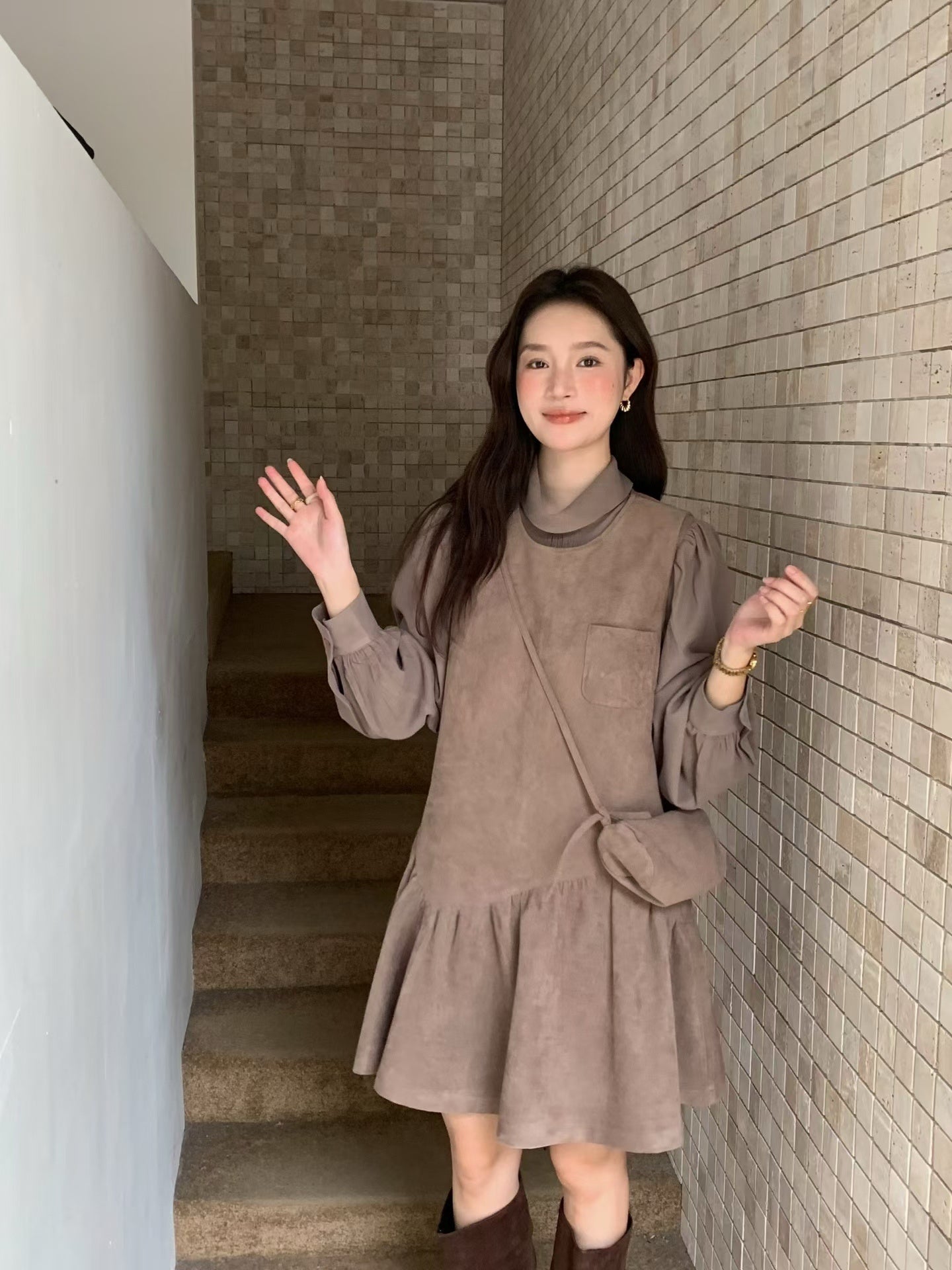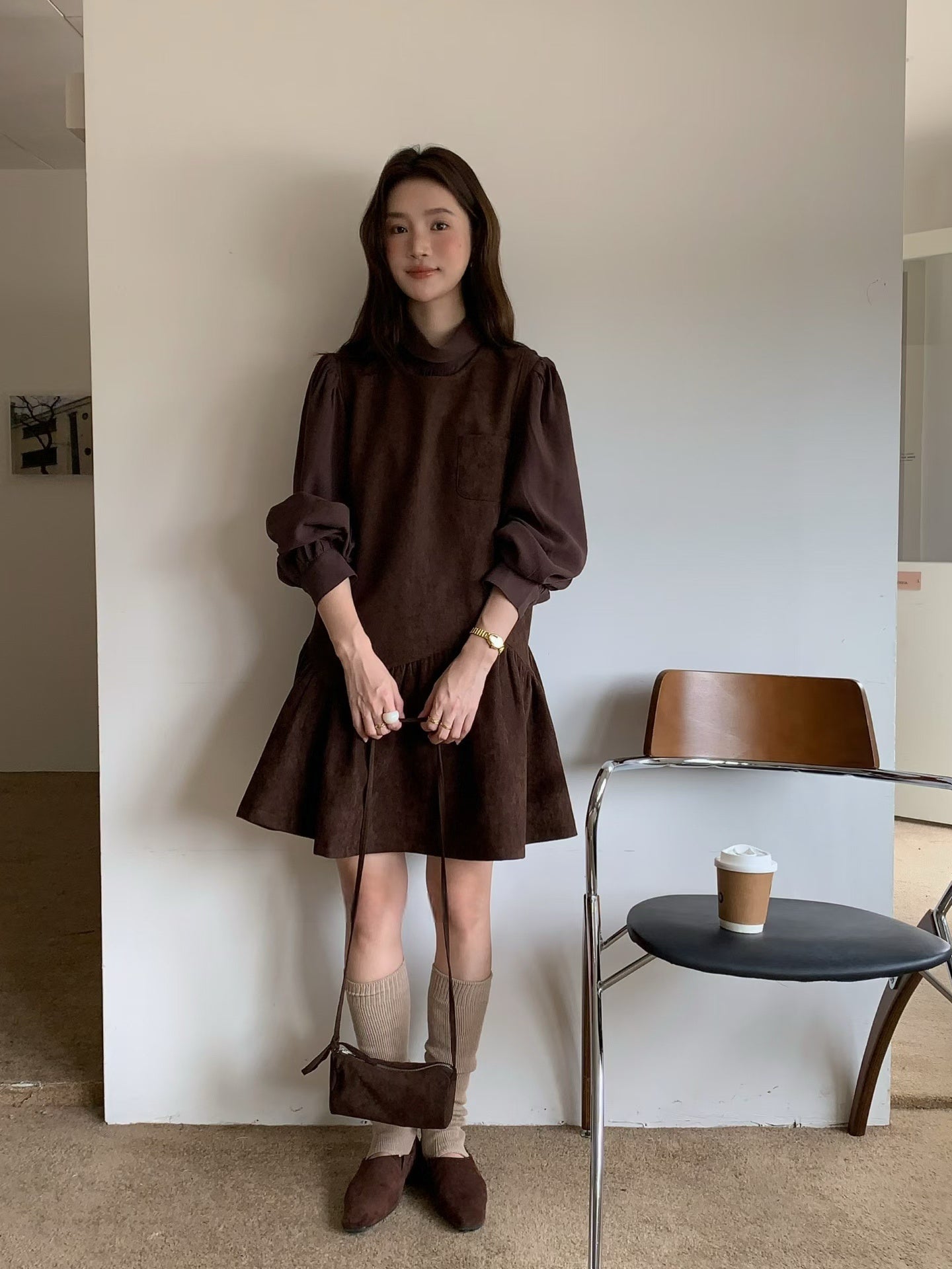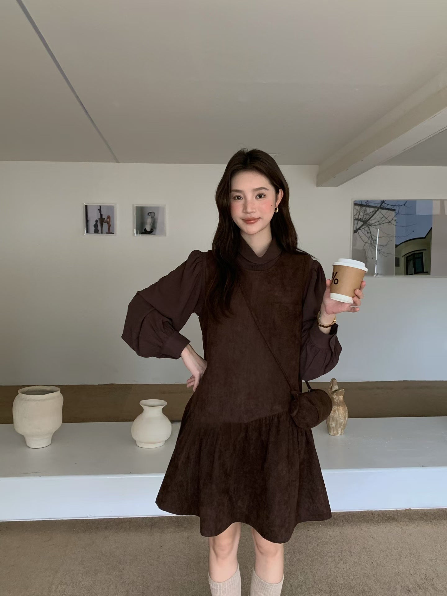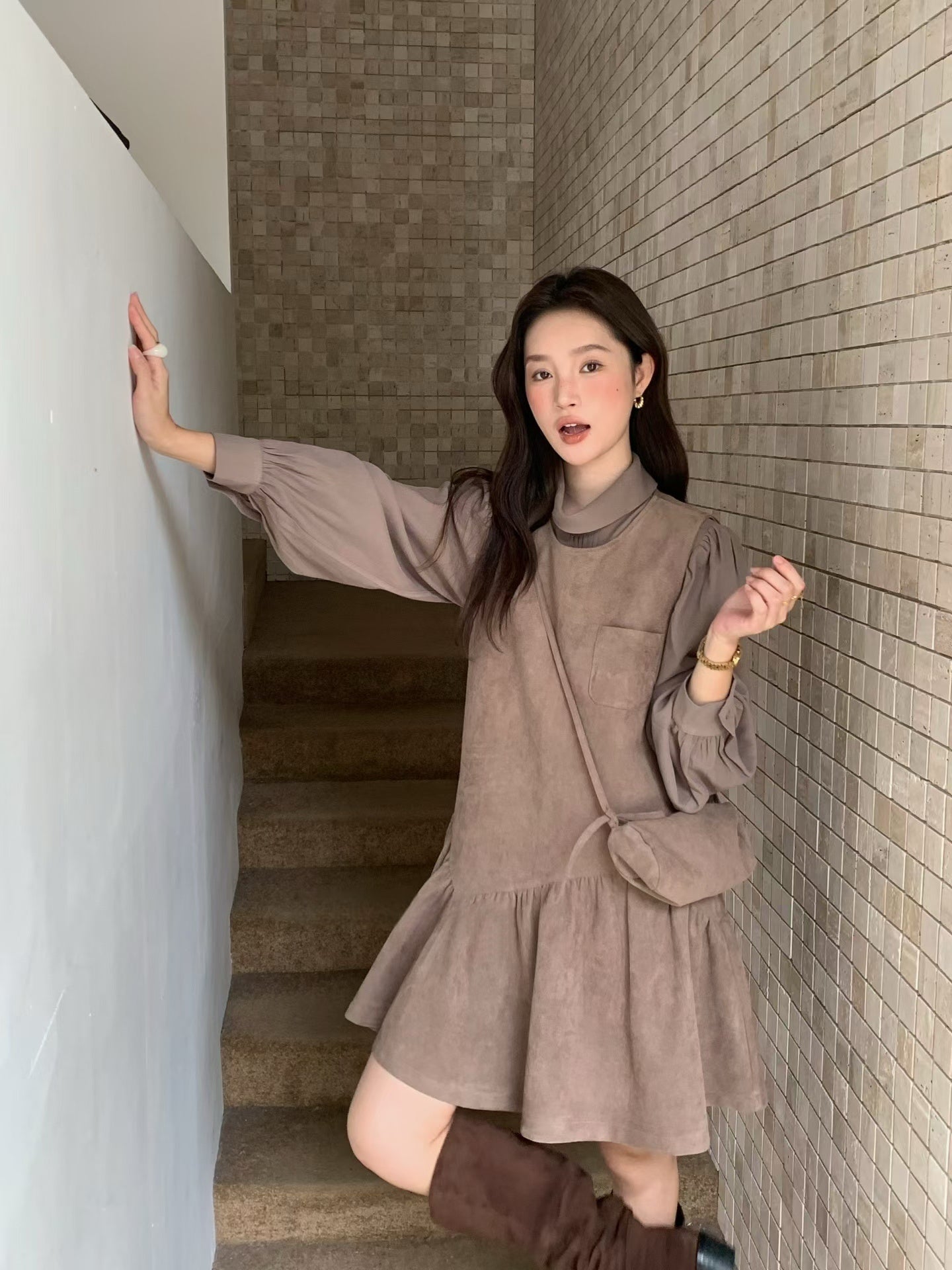 // 壓褶翻領silky BL+麂皮絨荷葉腳背心OPS套裝(連袋仔)