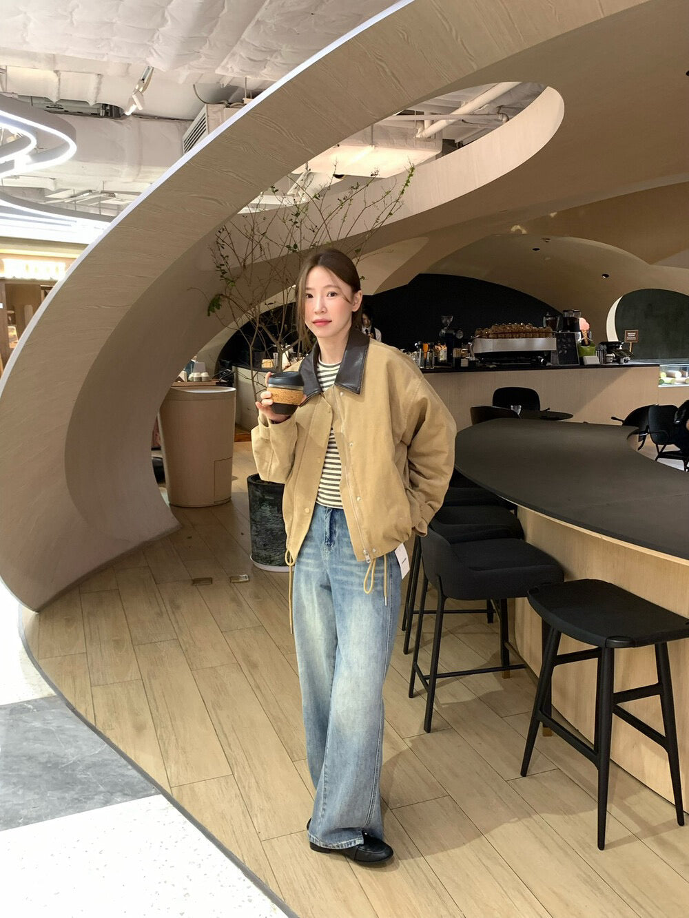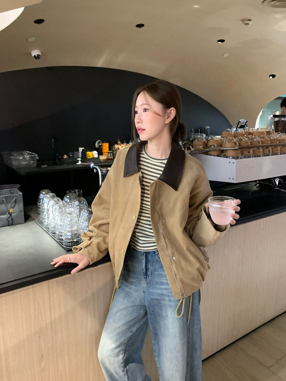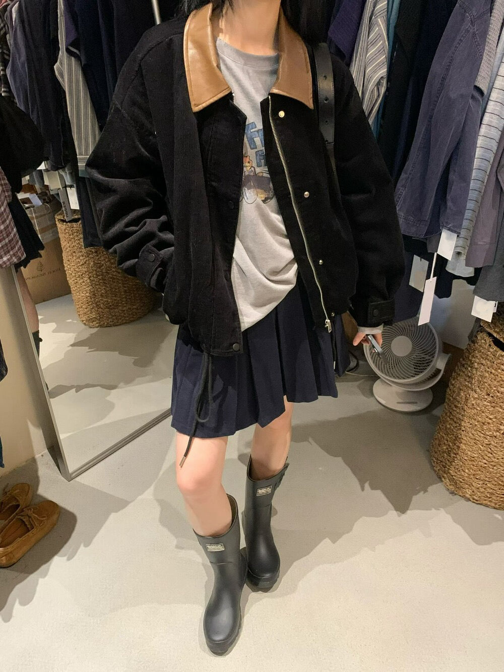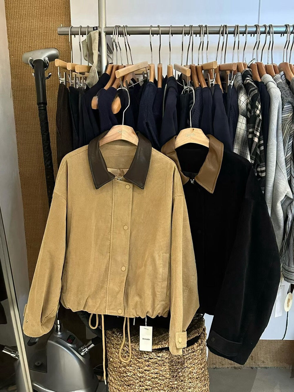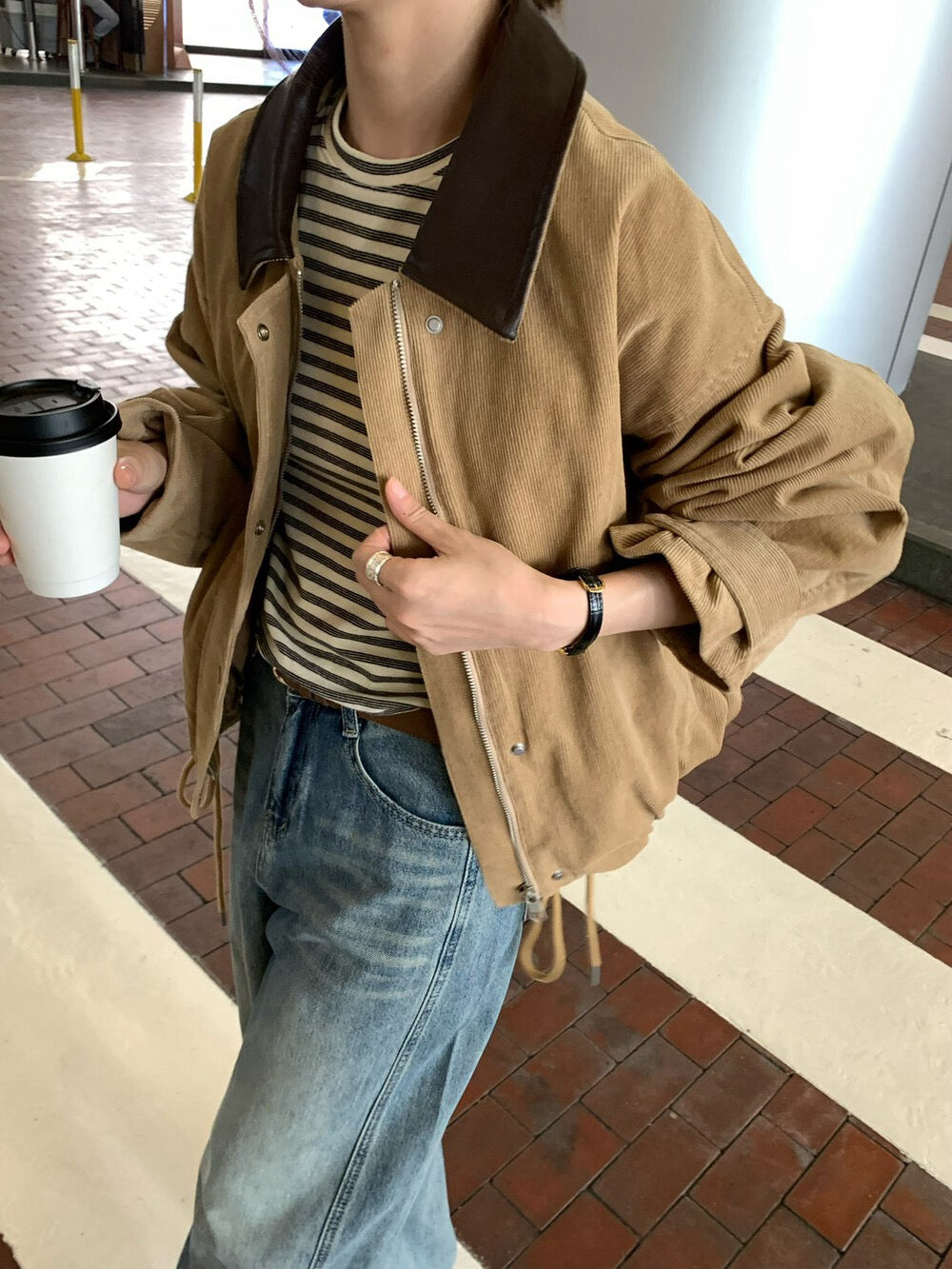 // 帥氣拼皮領燈芯絨可束腳拉鍊外套