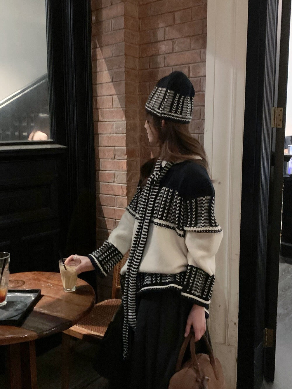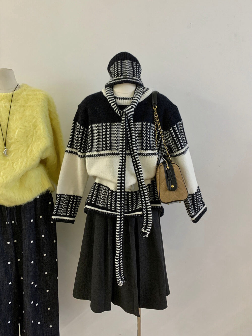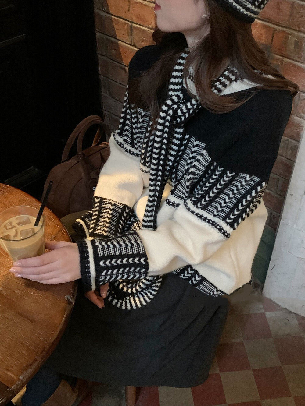 // 復古撞色特別織紋毛衣(連頸巾+帽)