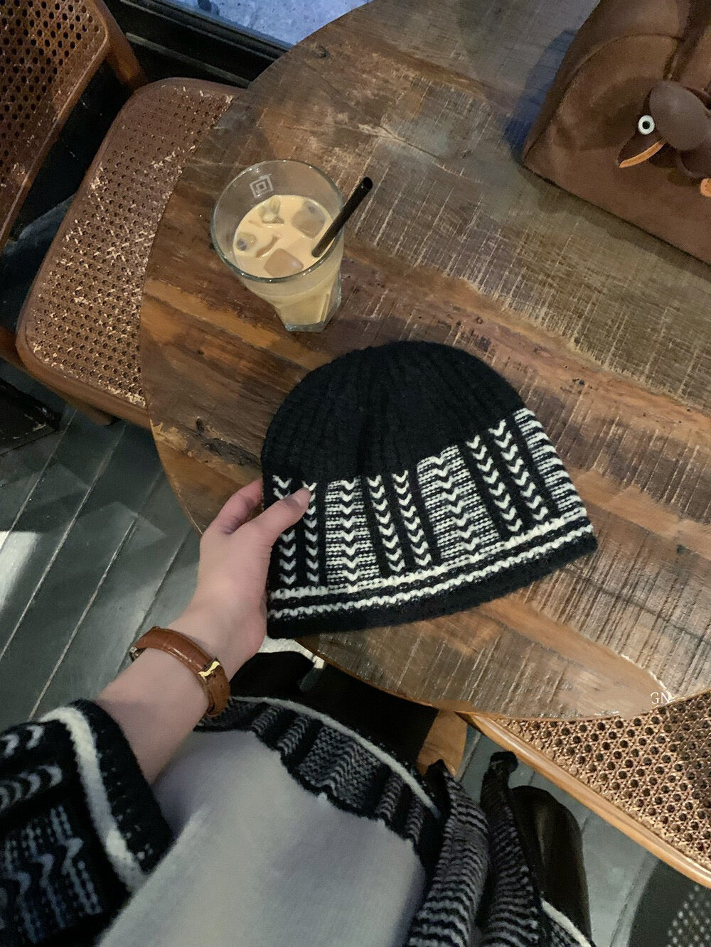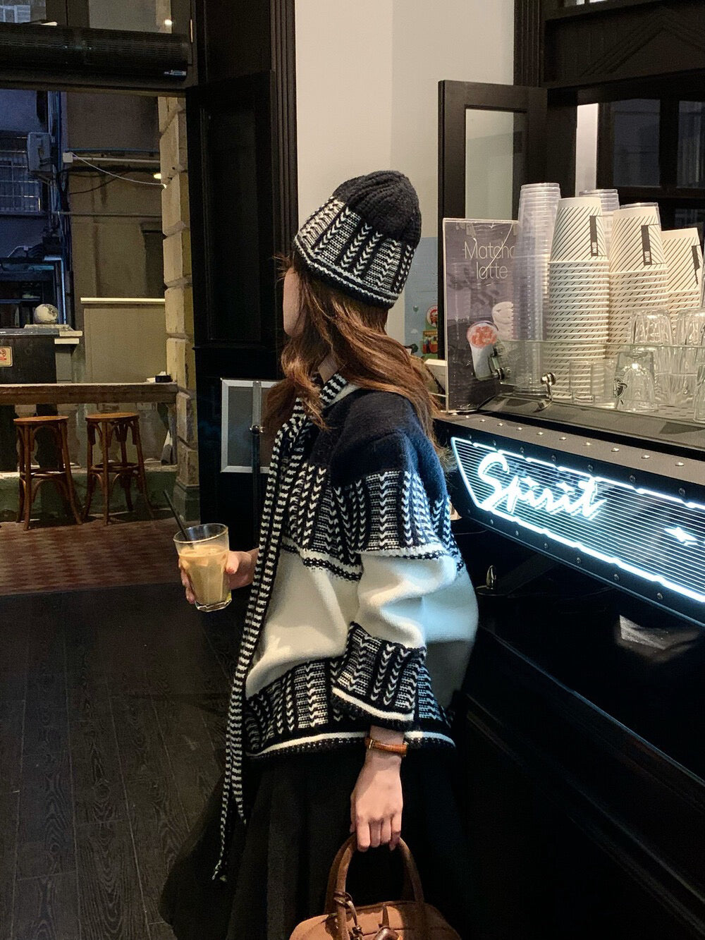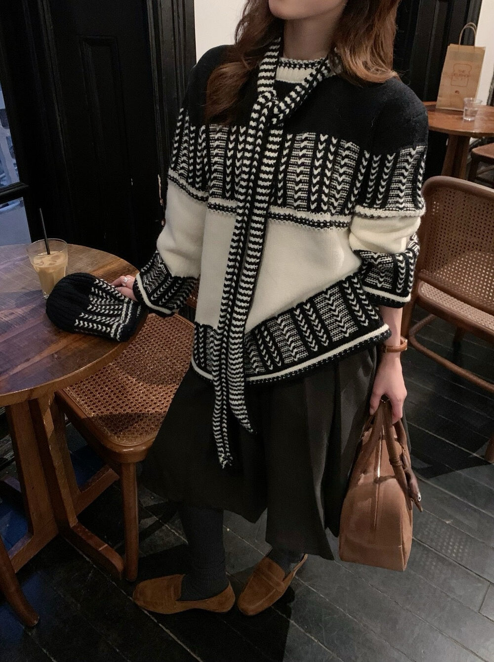 // 復古撞色特別織紋毛衣(連頸巾+帽)