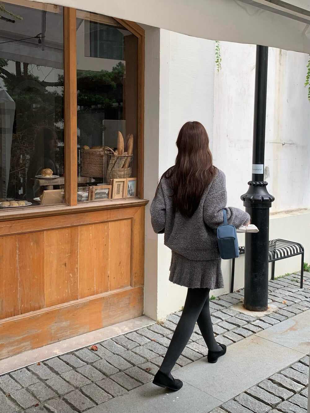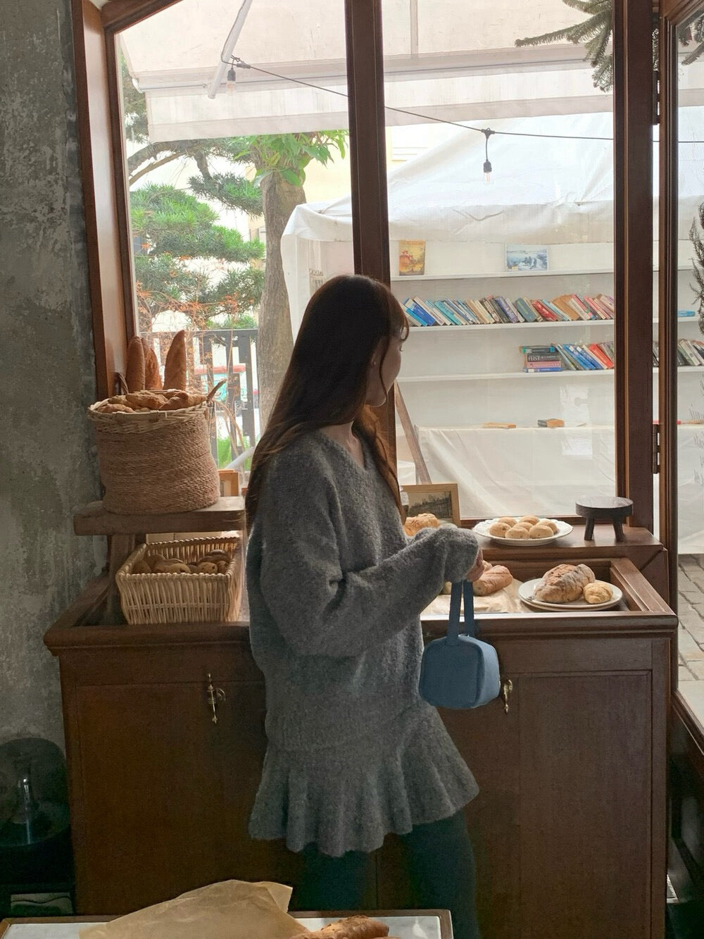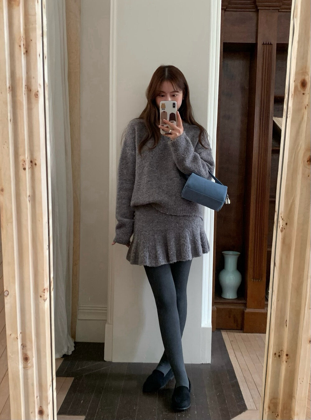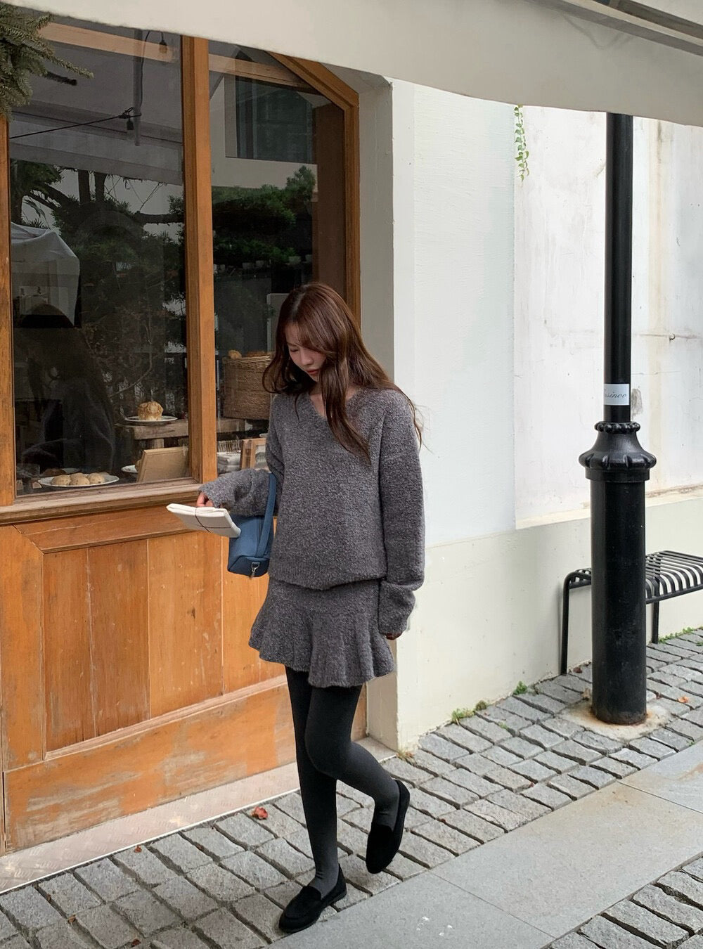 // 慵懶感V領毛衣+荷葉腳短裙套裝