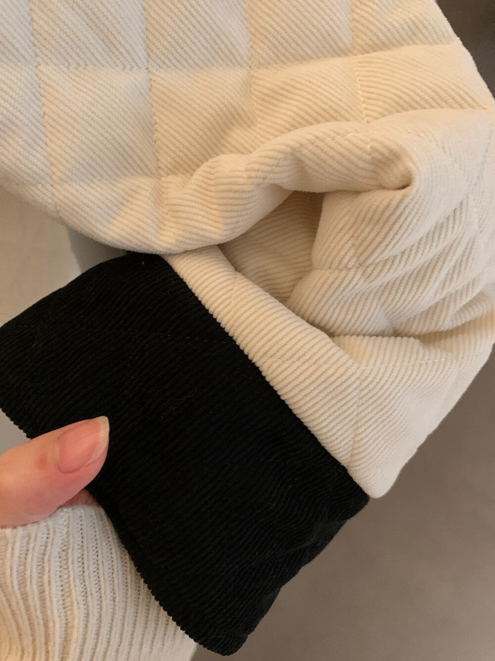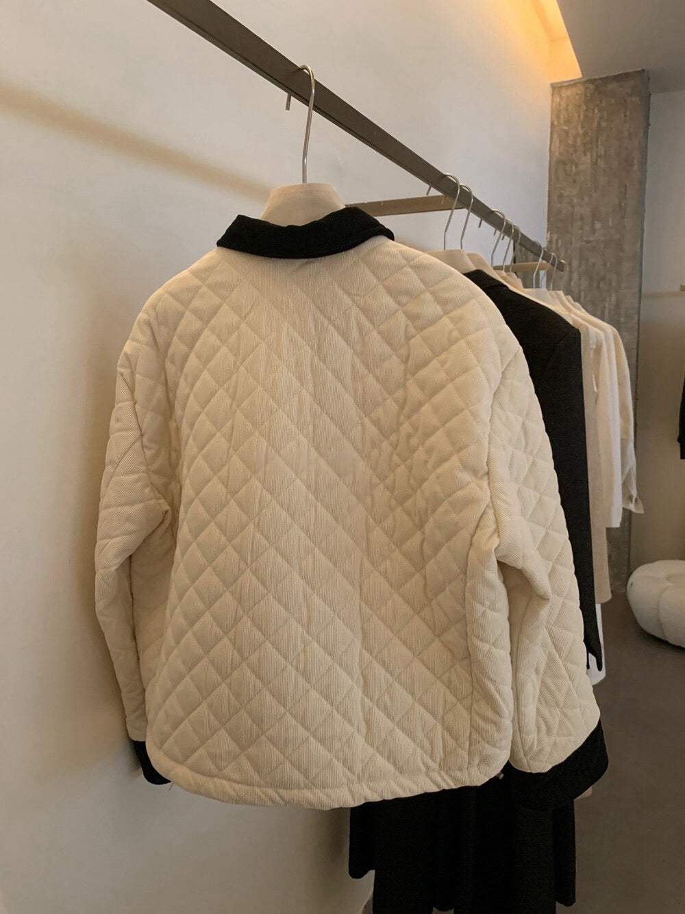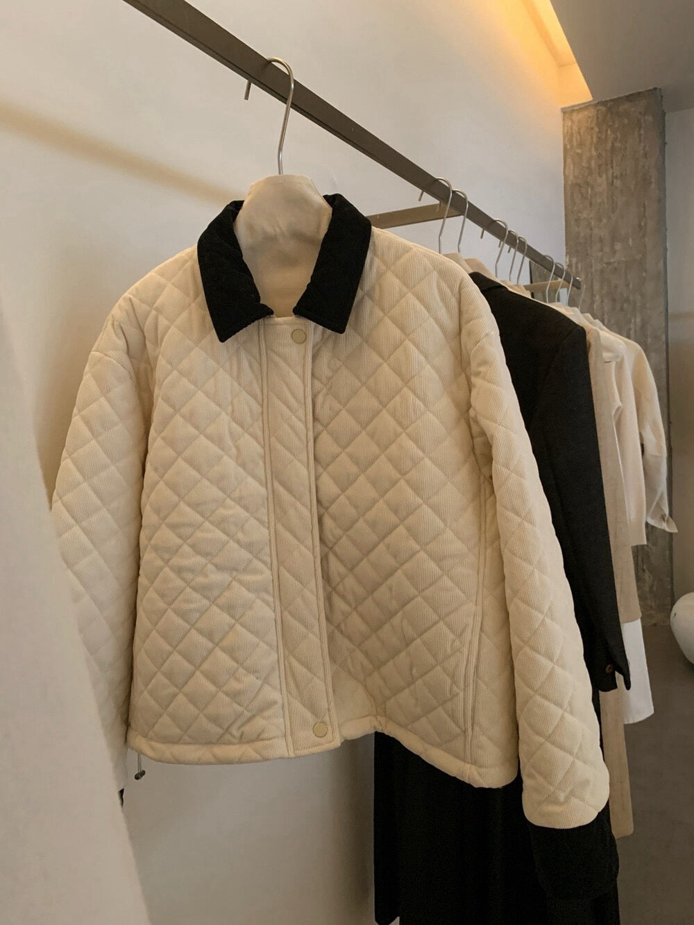 // 拼色燈芯絨領菱格絨面夾棉外套