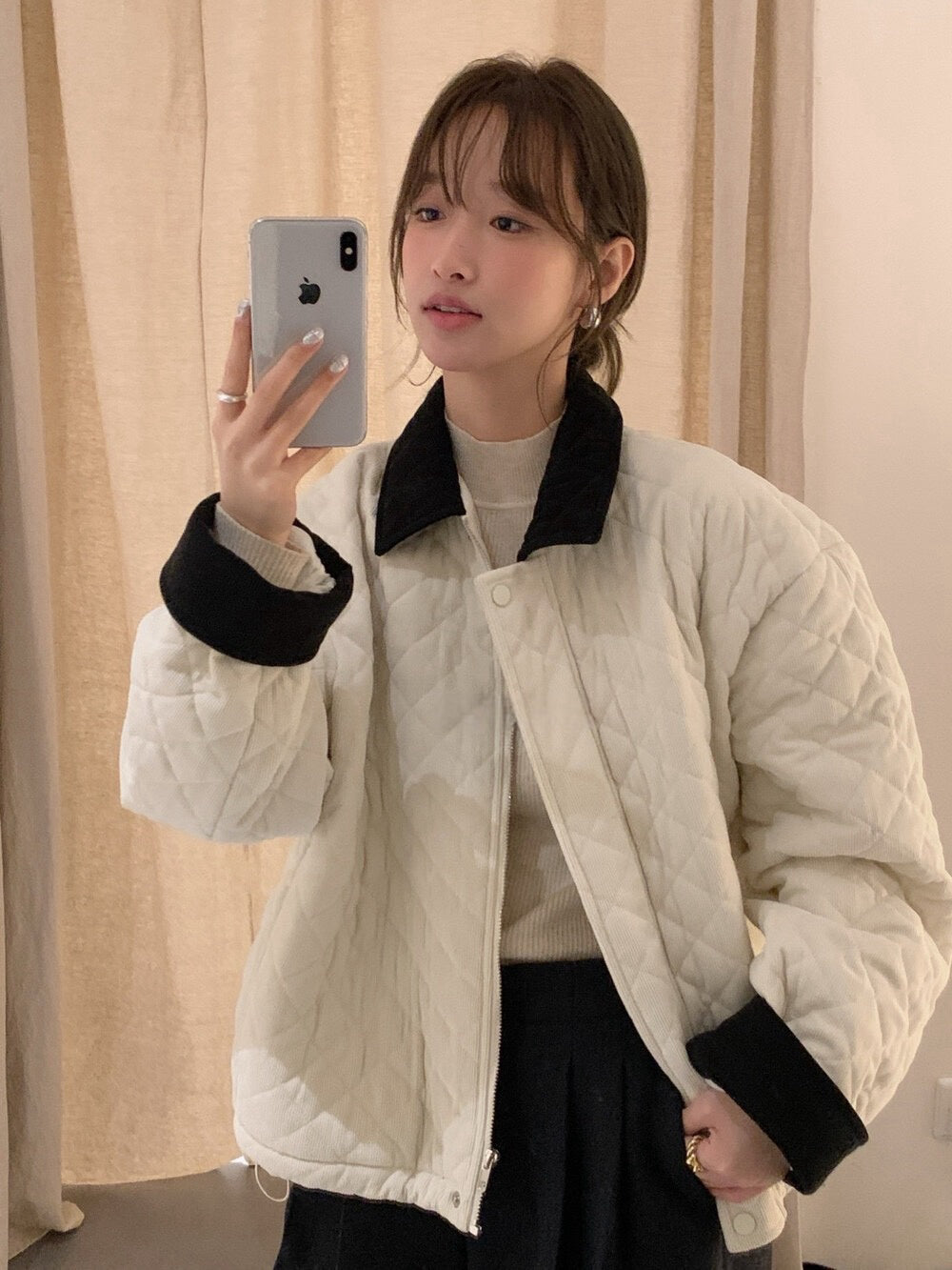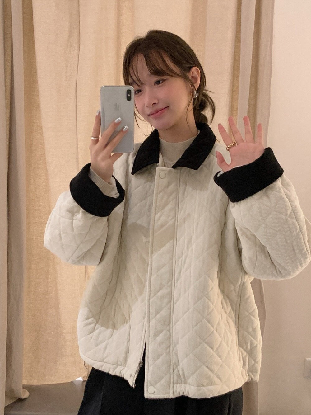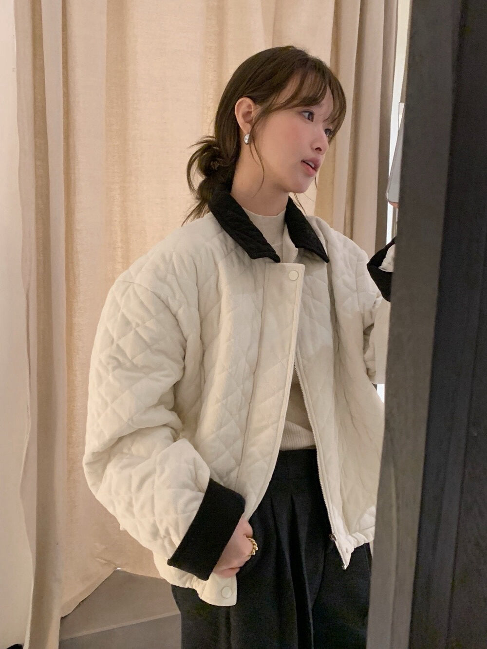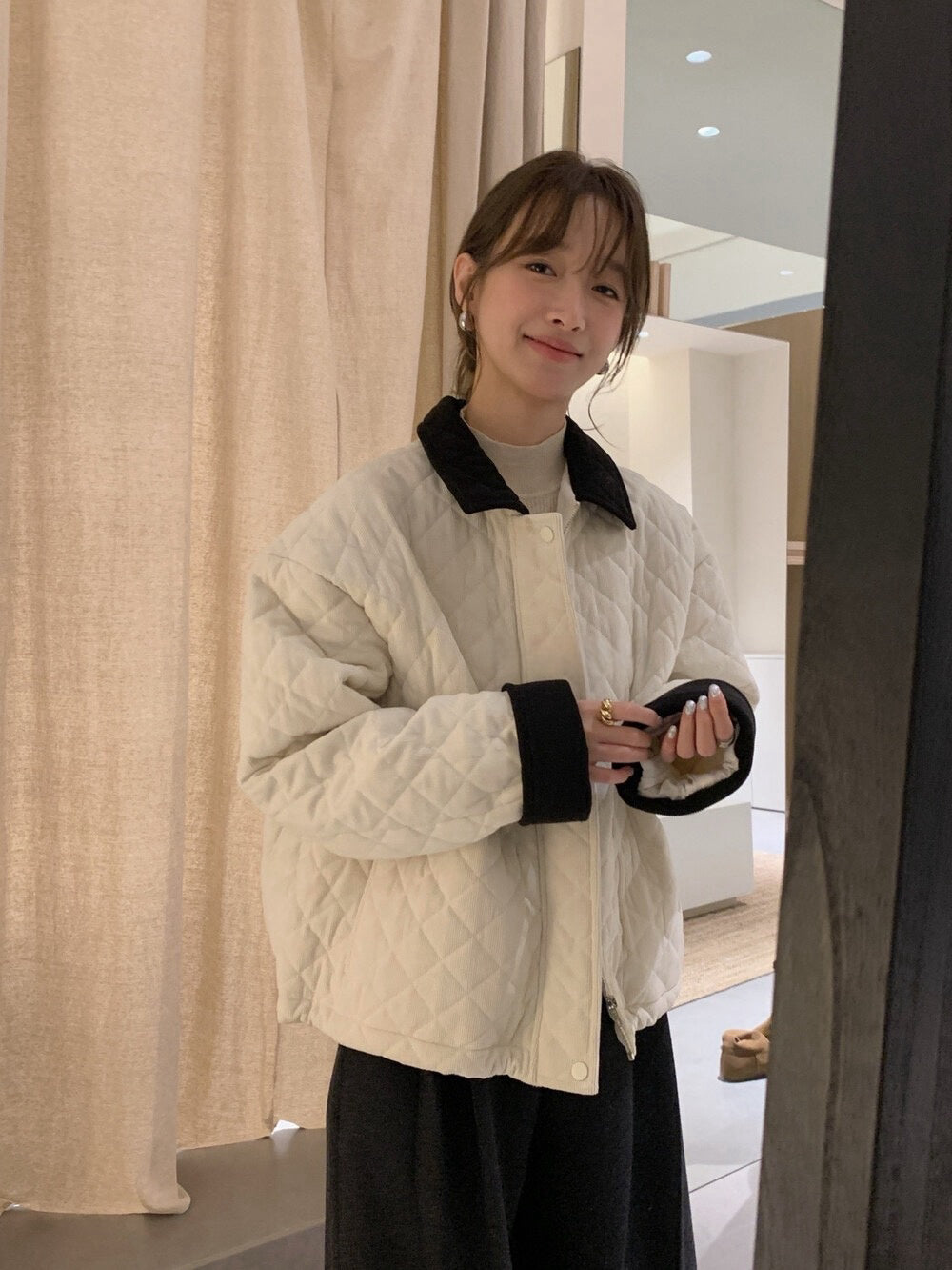 // 拼色燈芯絨領菱格絨面夾棉外套