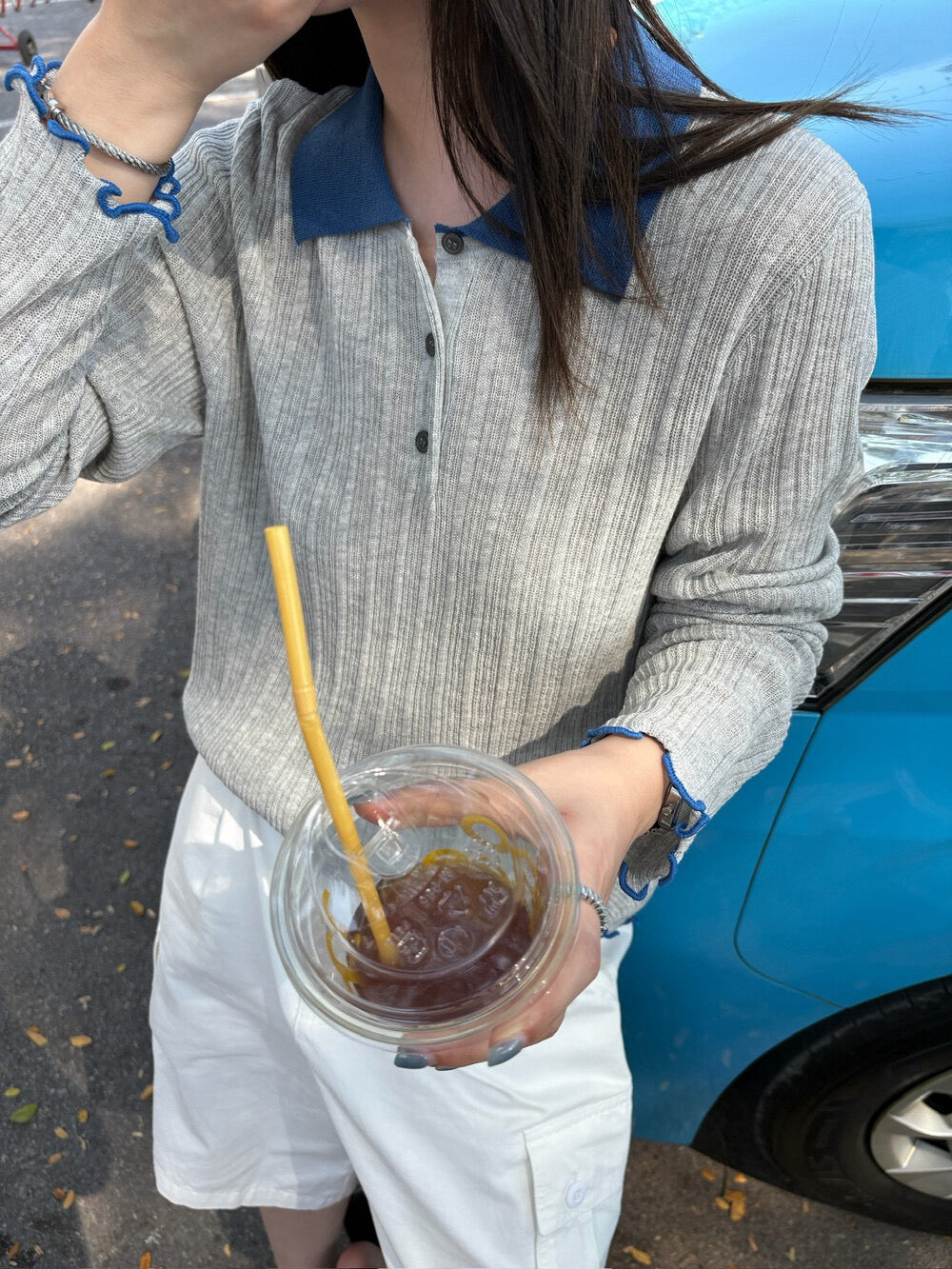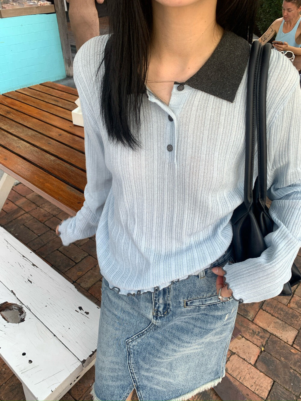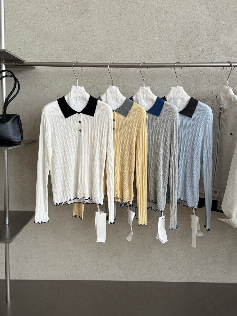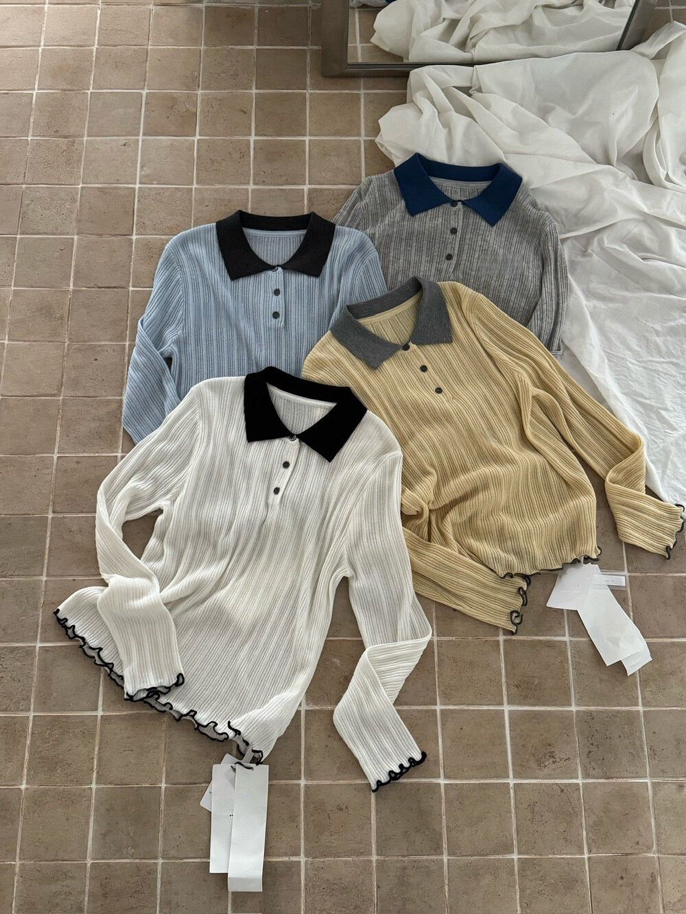 // 拼色領卷卷邊直紋鈕扣lyocell針織上衣