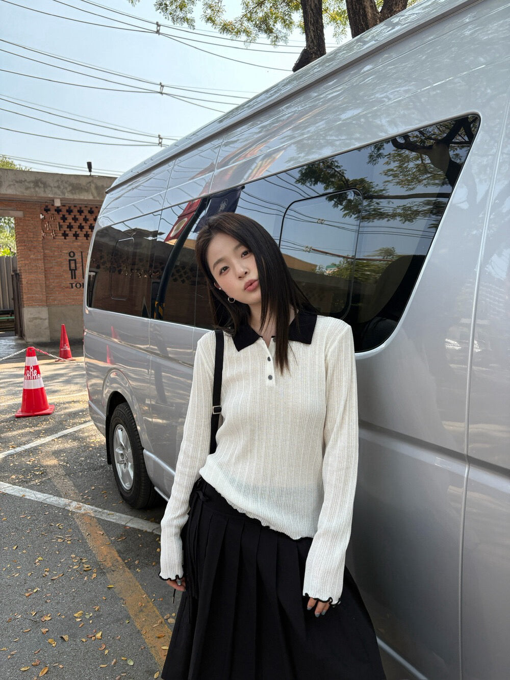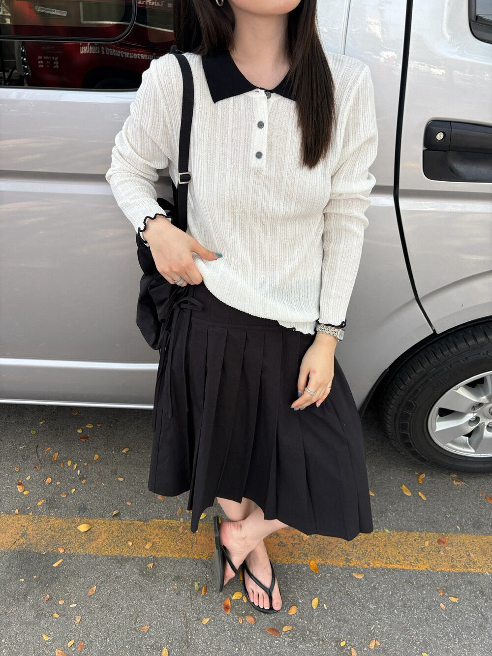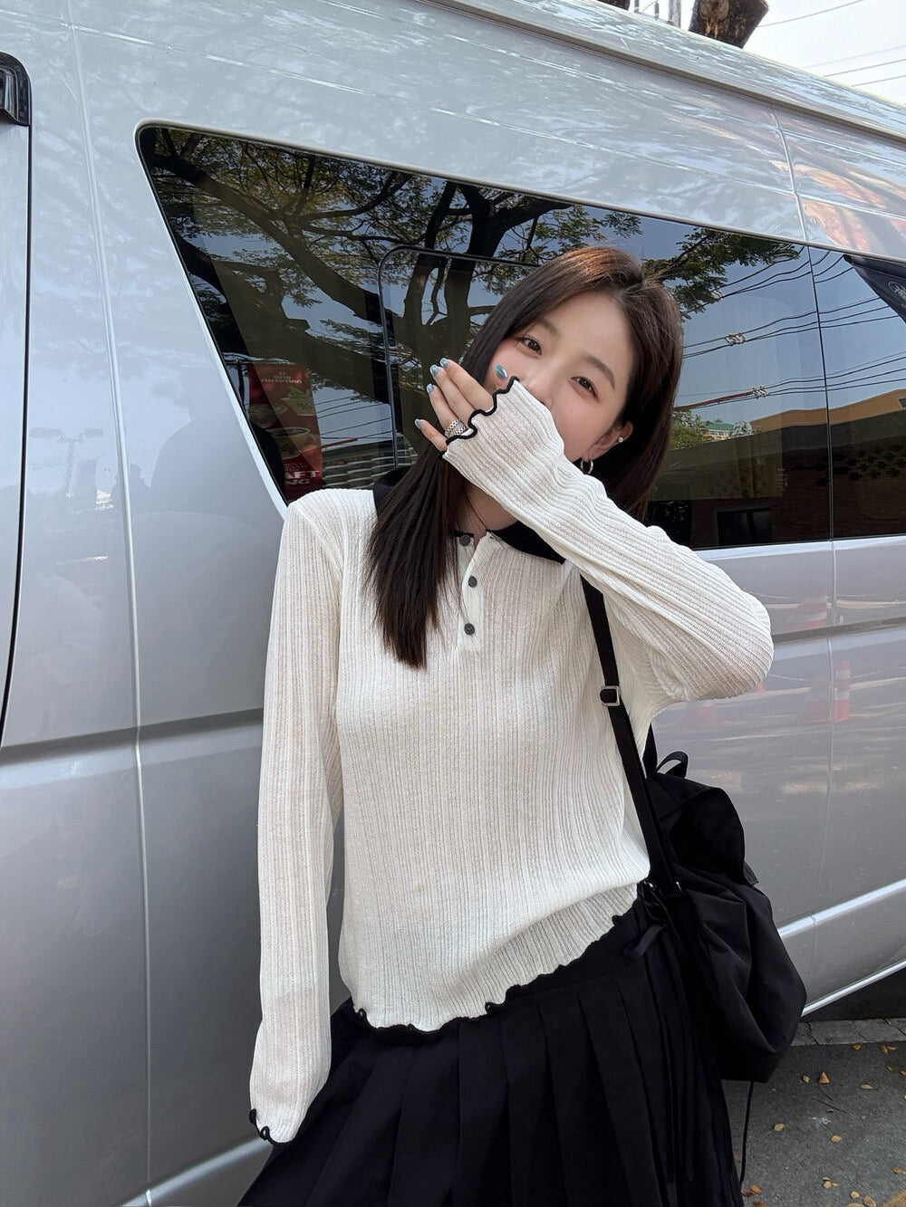 // 拼色領卷卷邊直紋鈕扣lyocell針織上衣