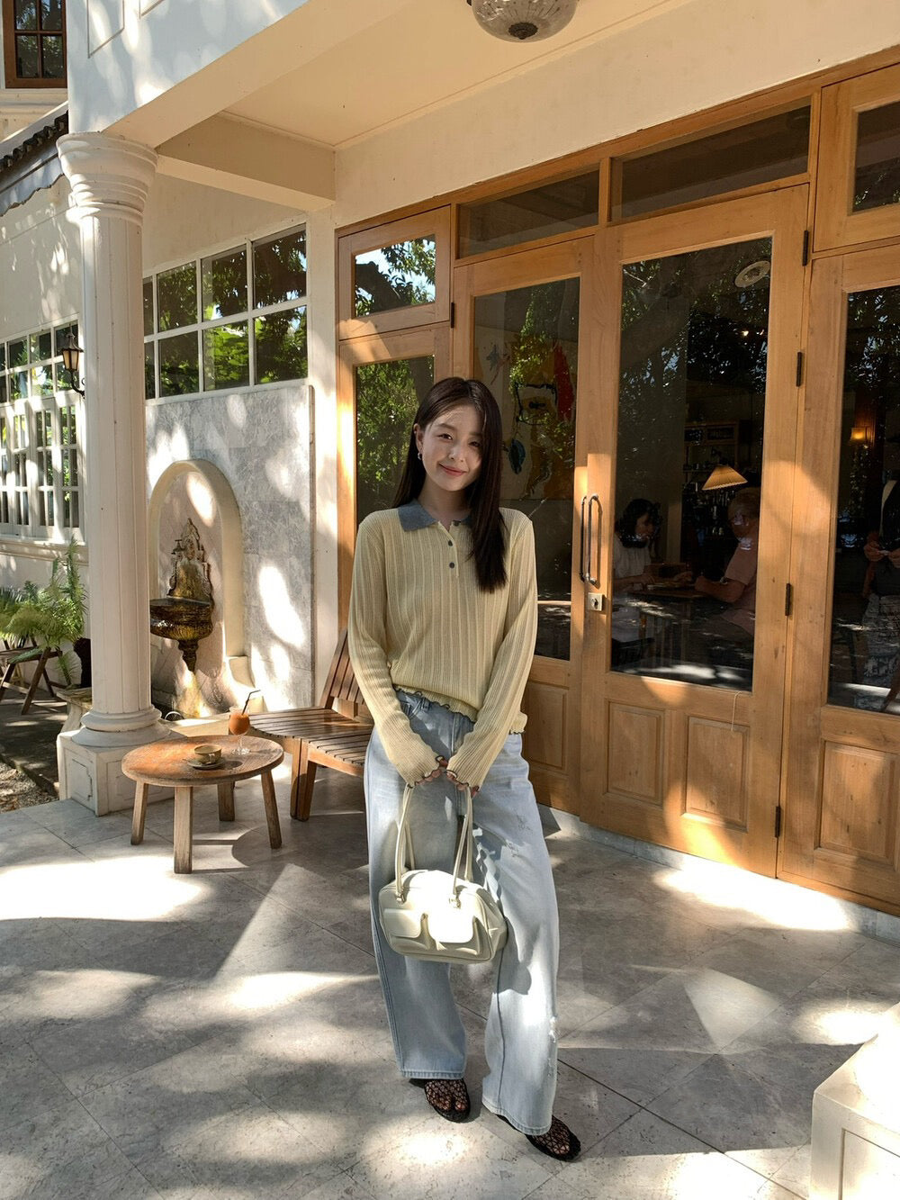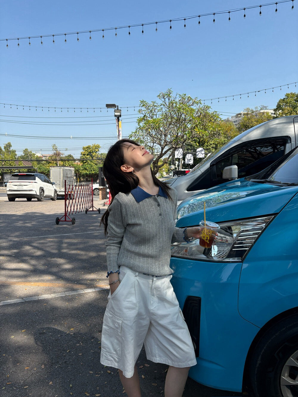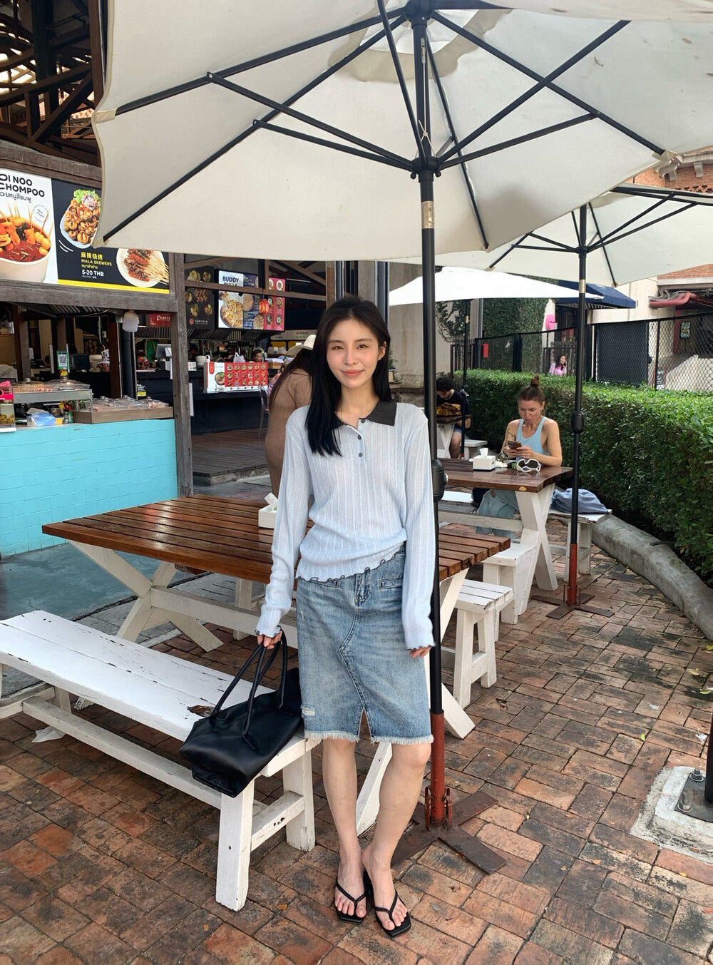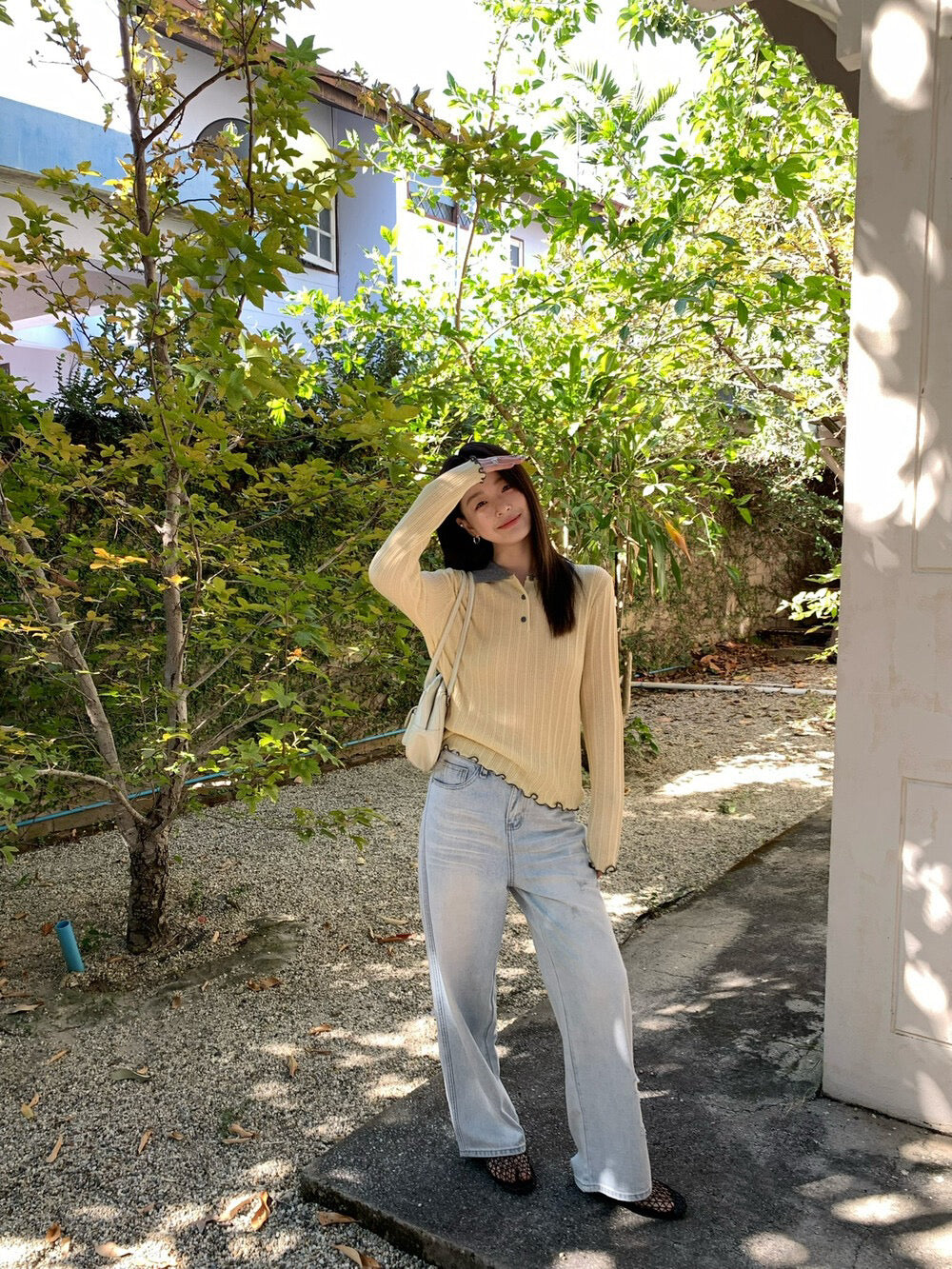 // 拼色領卷卷邊直紋鈕扣lyocell針織上衣