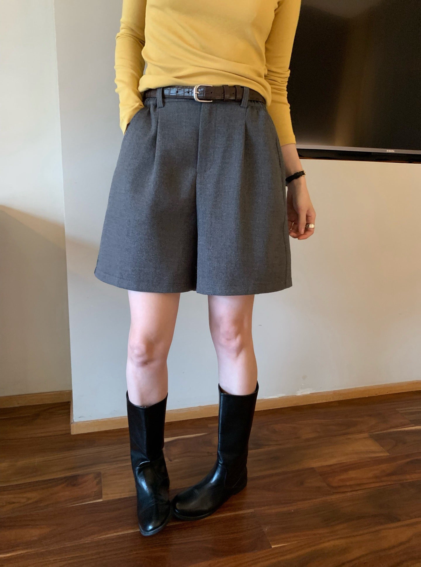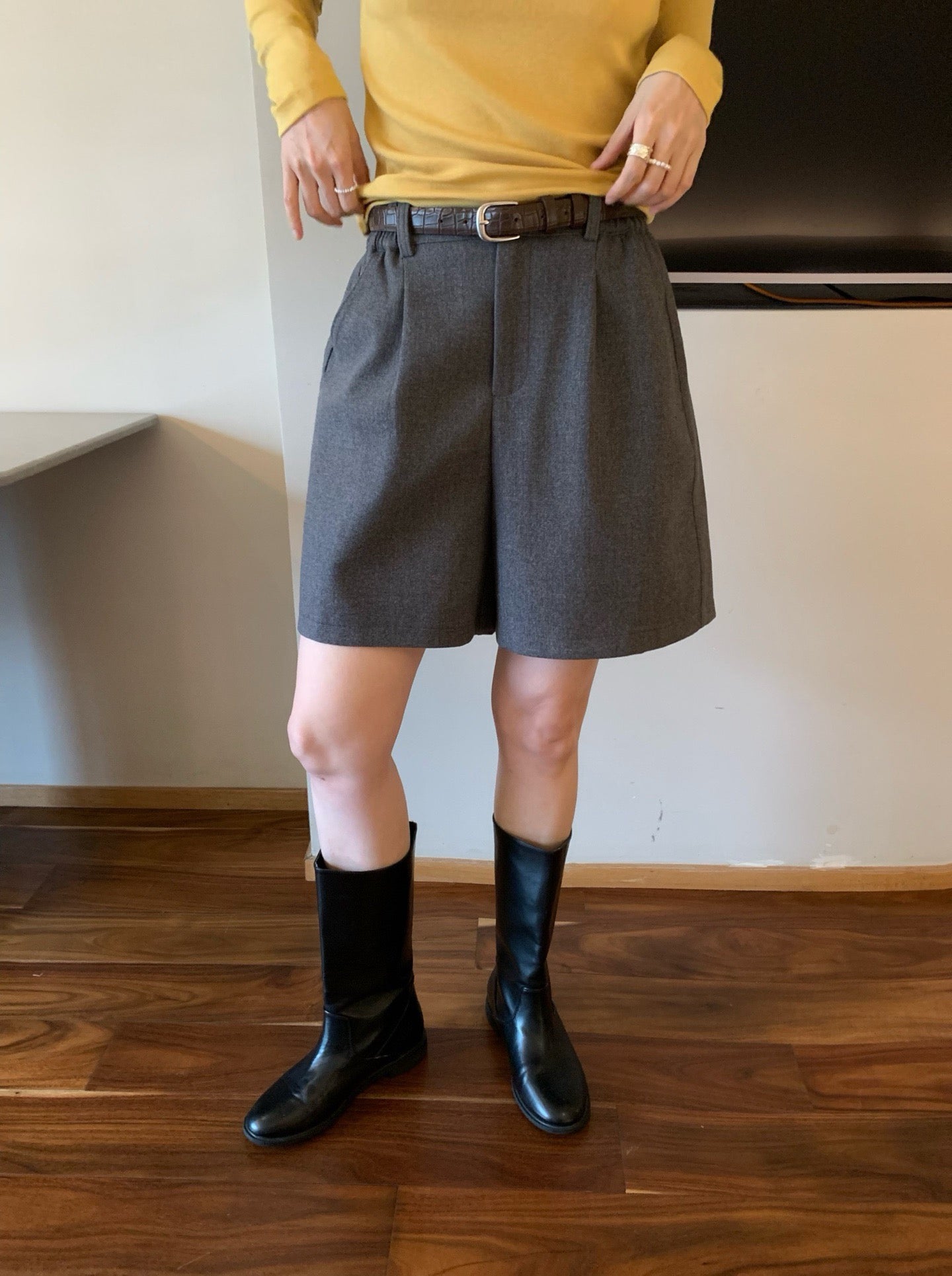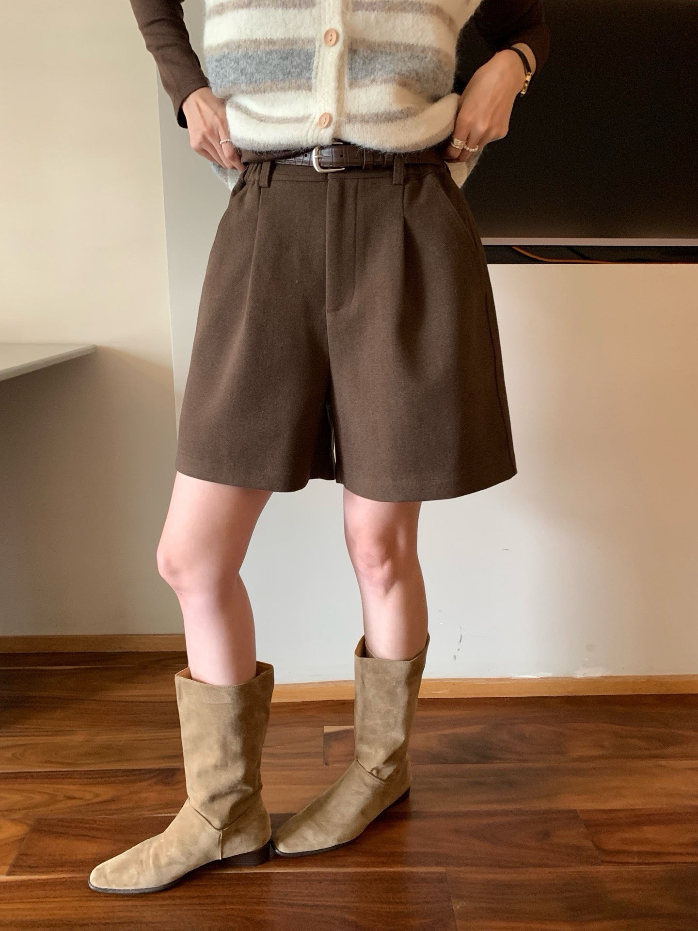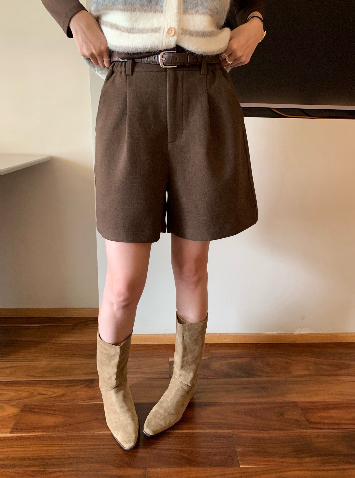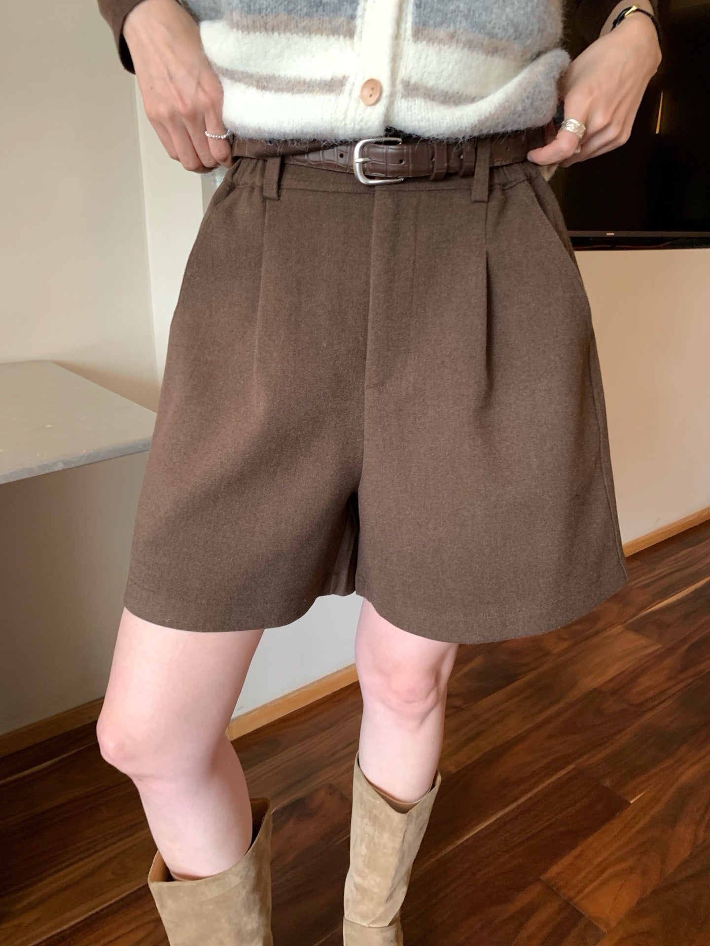 // 挺括感羊毛呢料連腰帶短褲