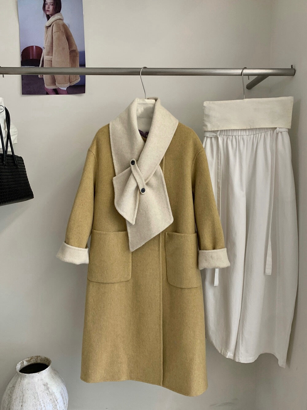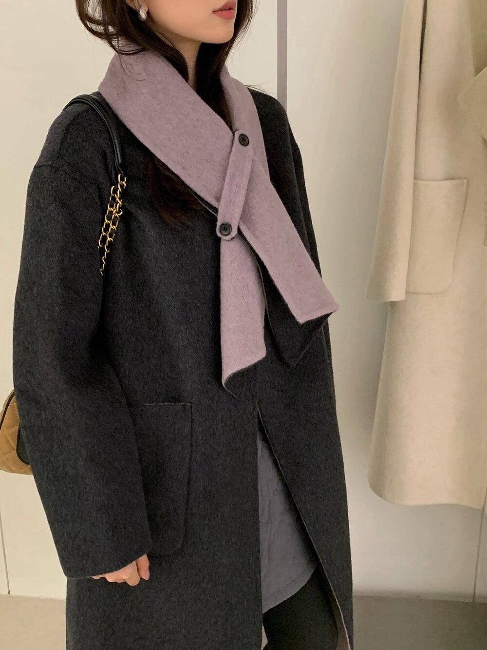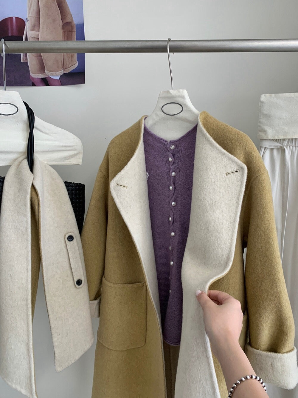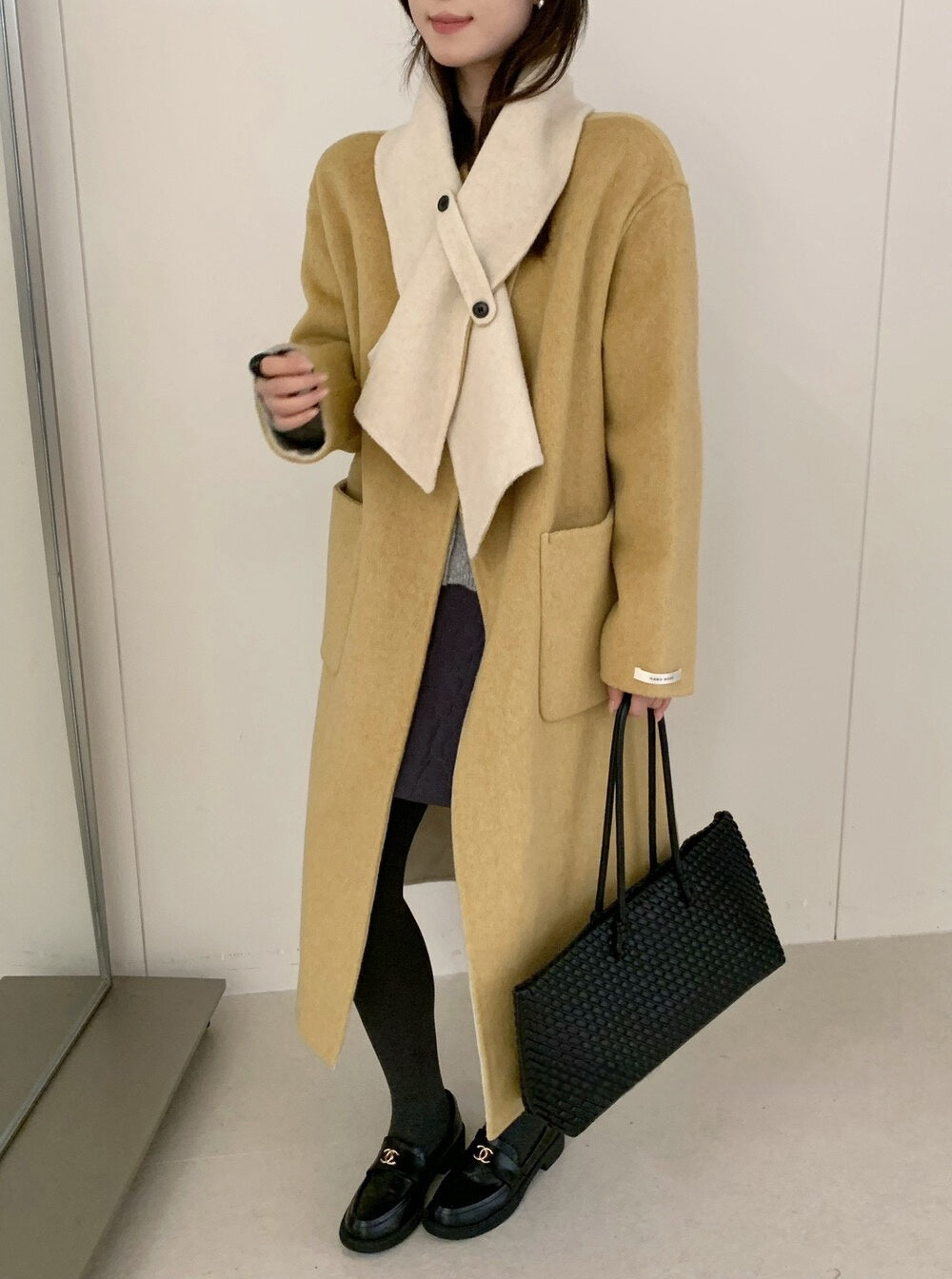 // 撞色內裡斜襟連頸巾100%羊毛雙面手工外套