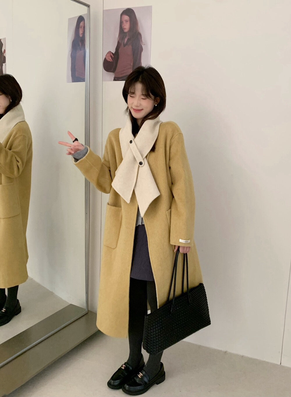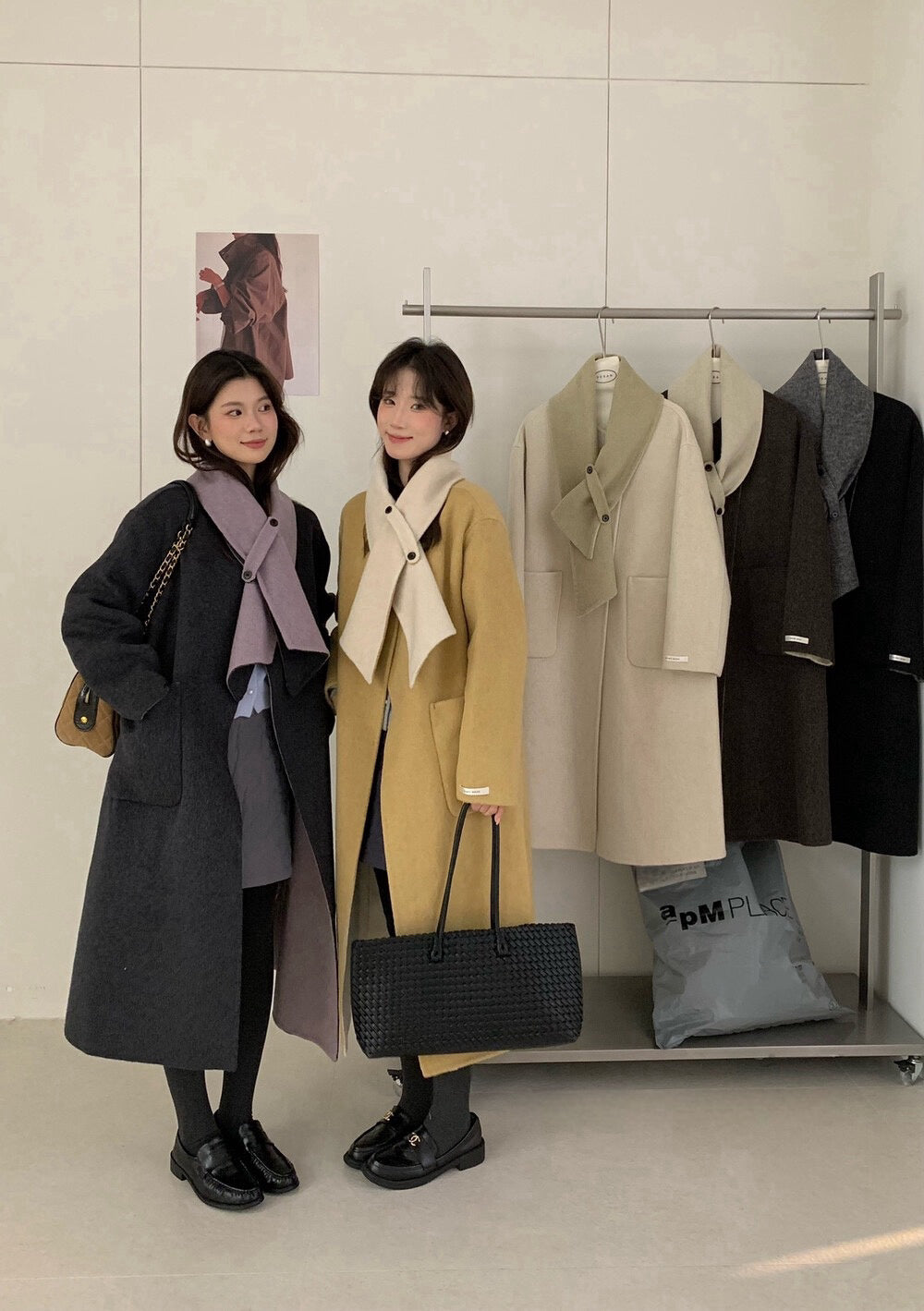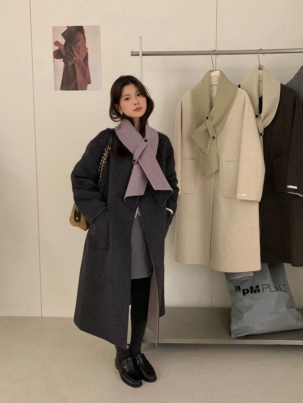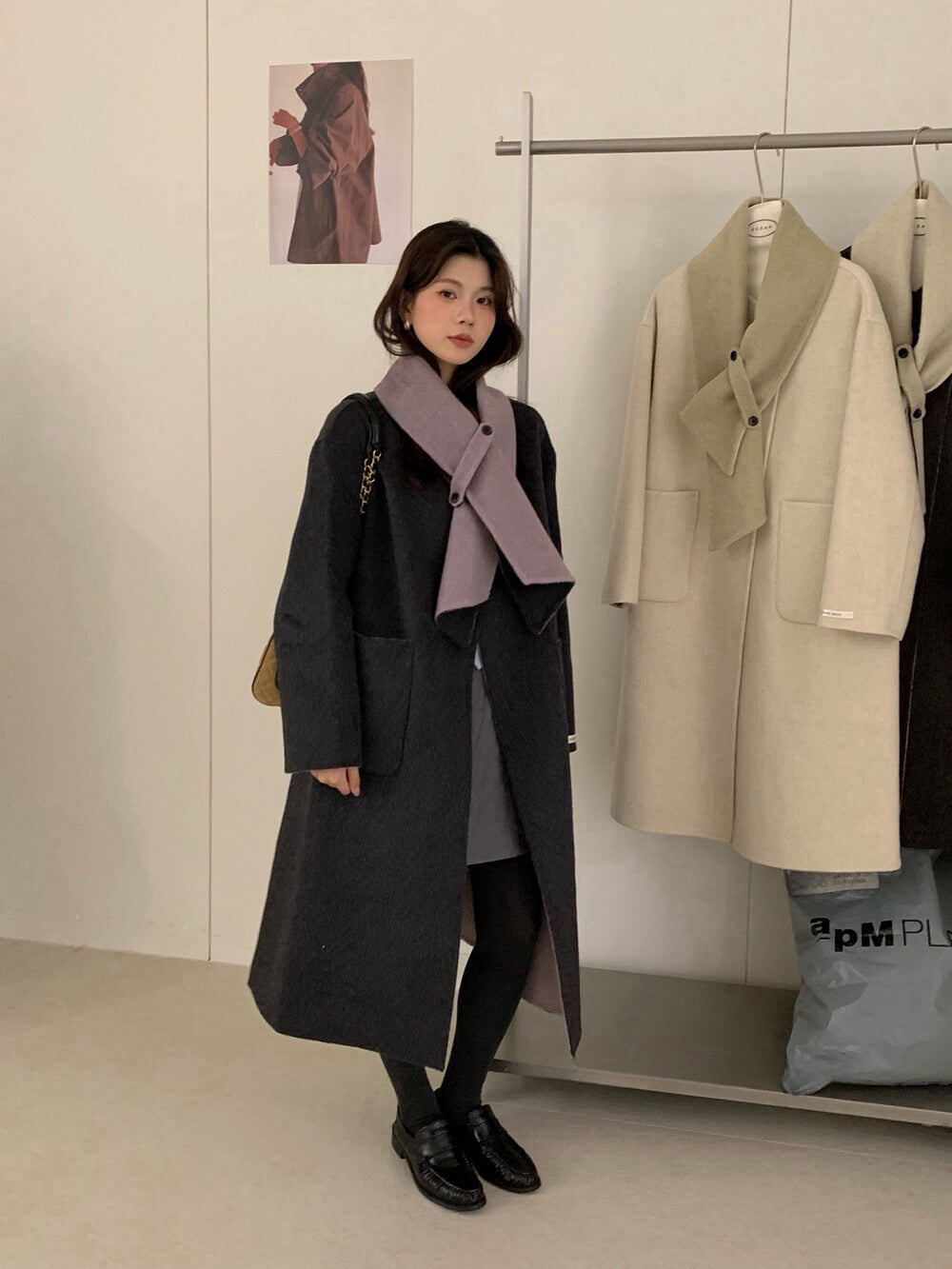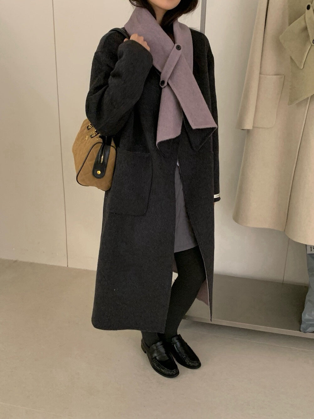 // 撞色內裡斜襟連頸巾100%羊毛雙面手工外套