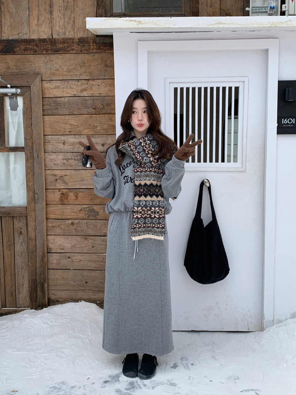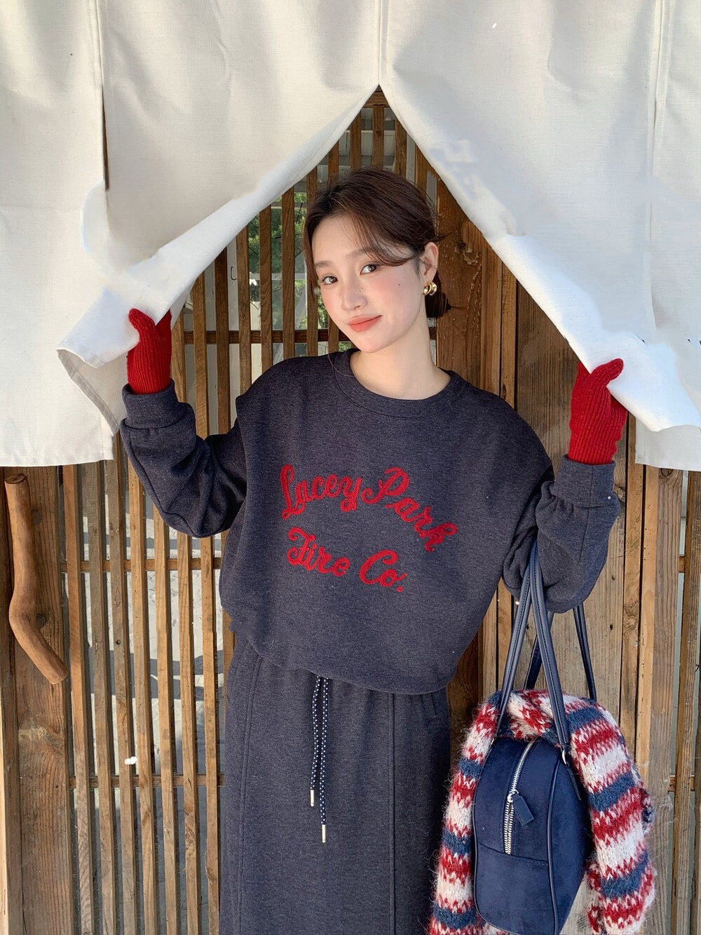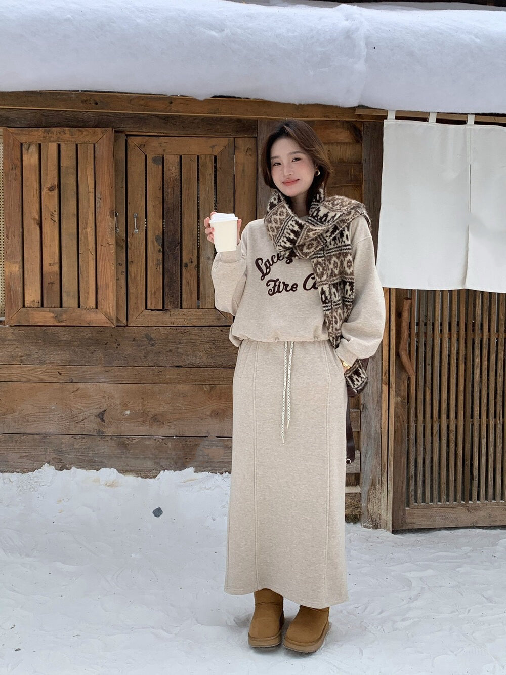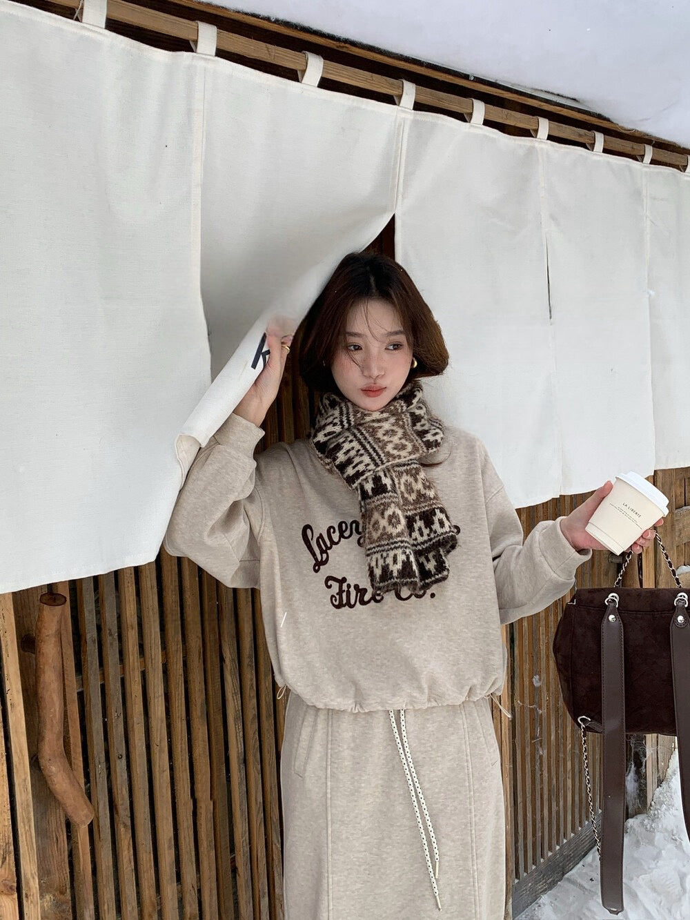 // 撞色刺繡字可束腳衛衣+中裙套裝(連頸巾)