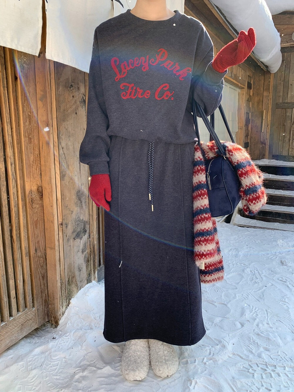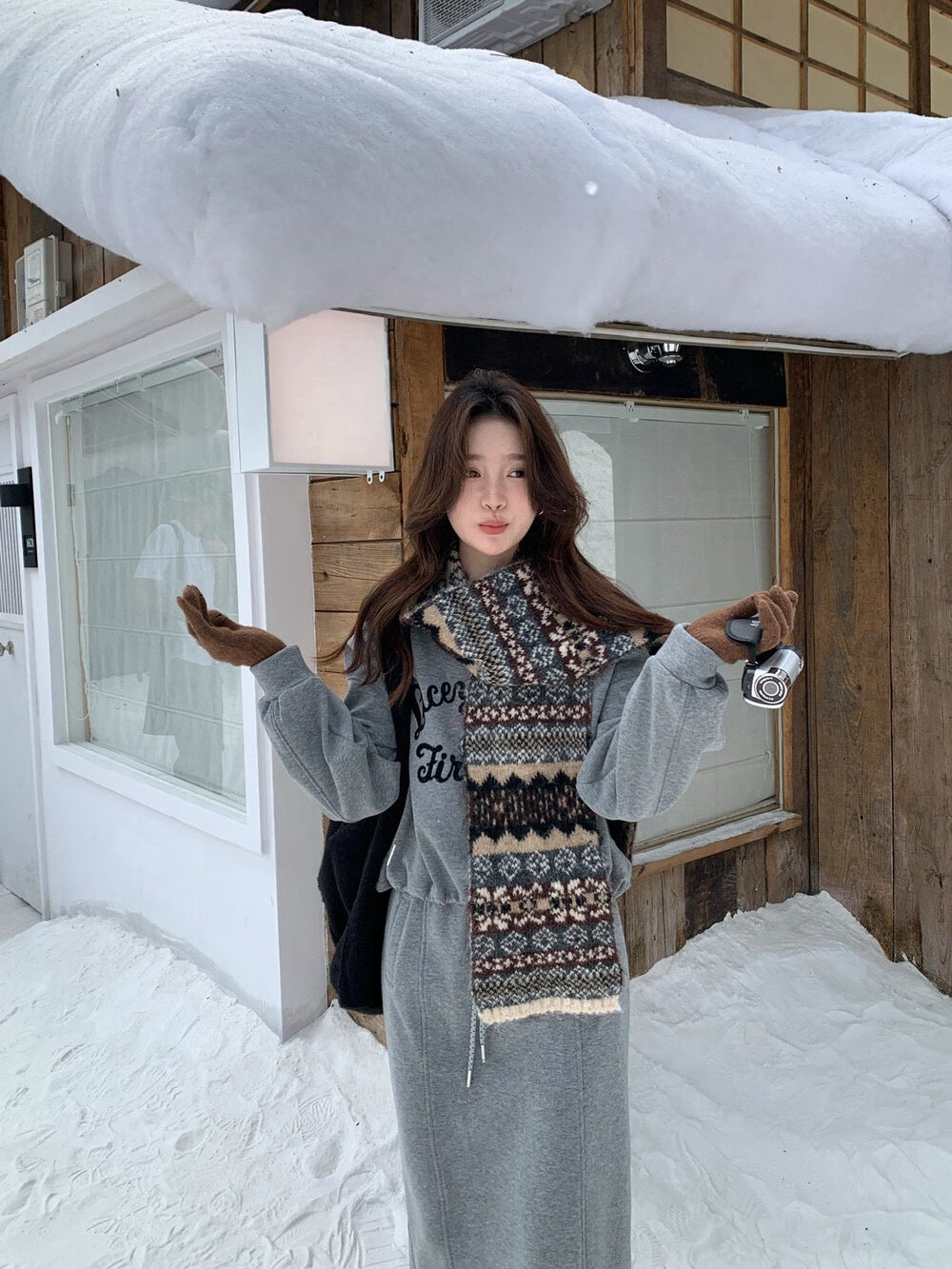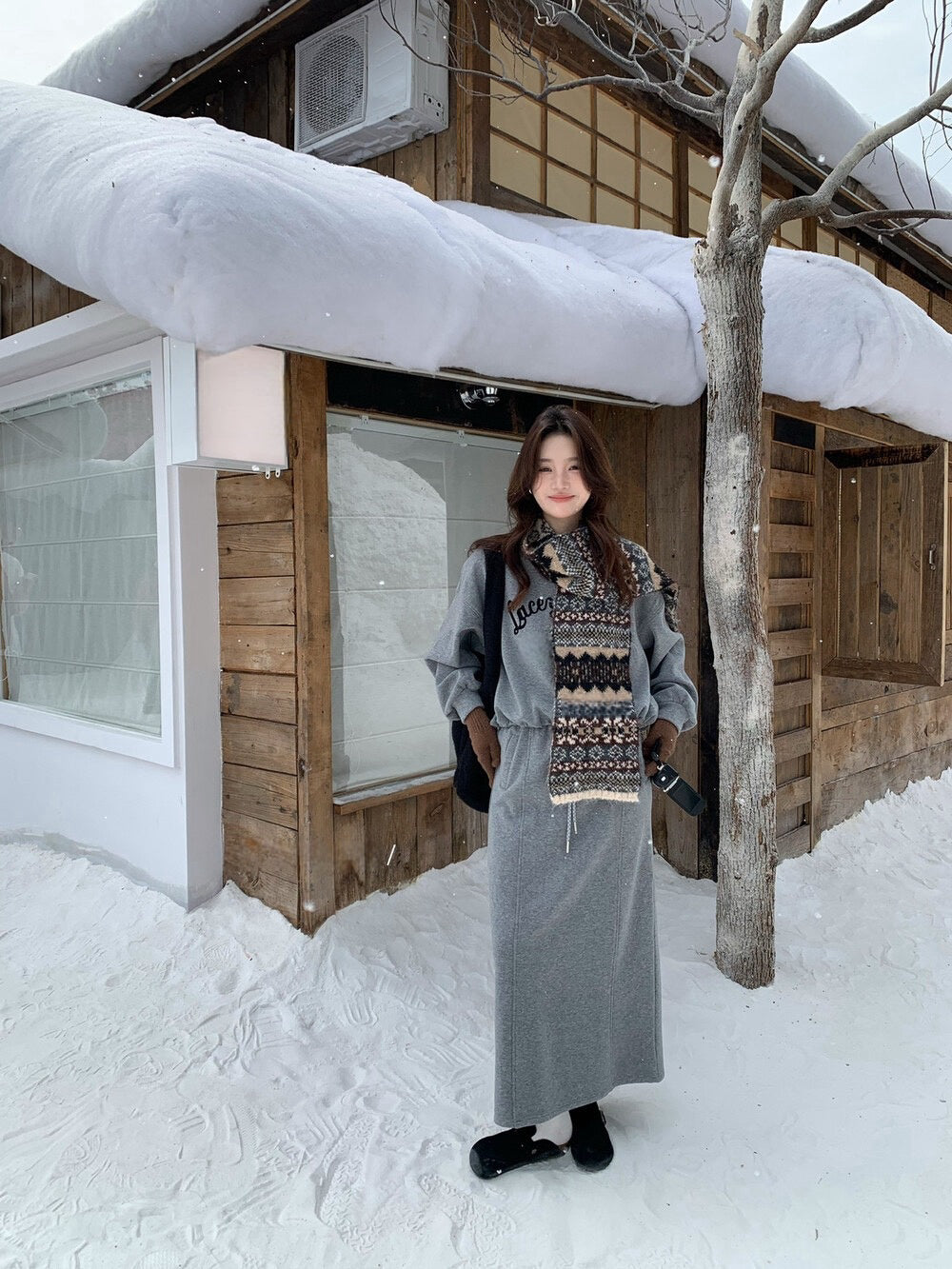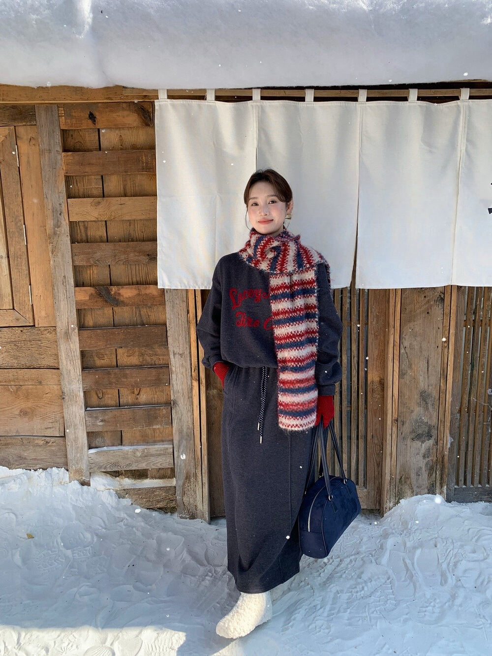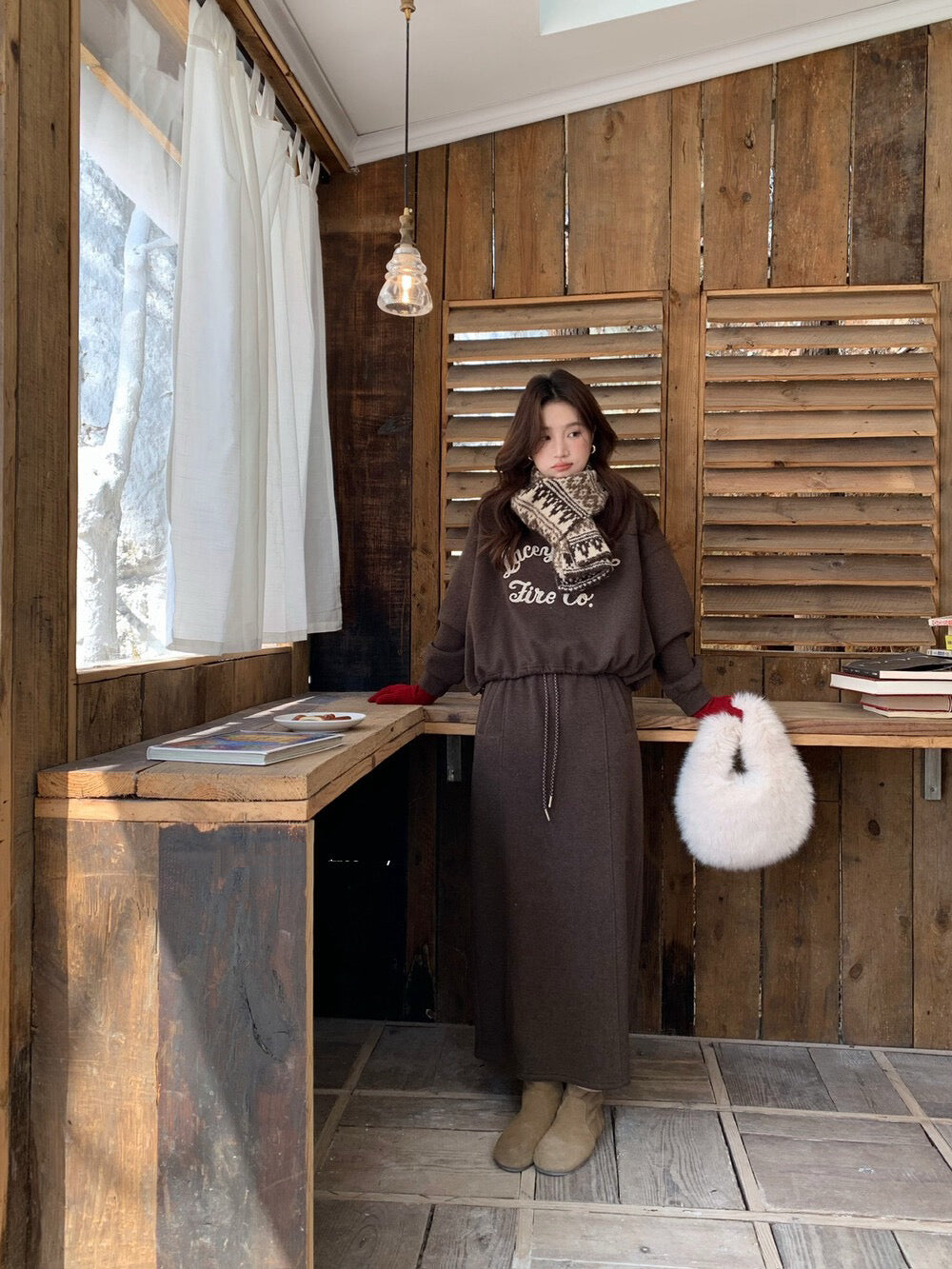 // 撞色刺繡字可束腳衛衣+中裙套裝(連頸巾)