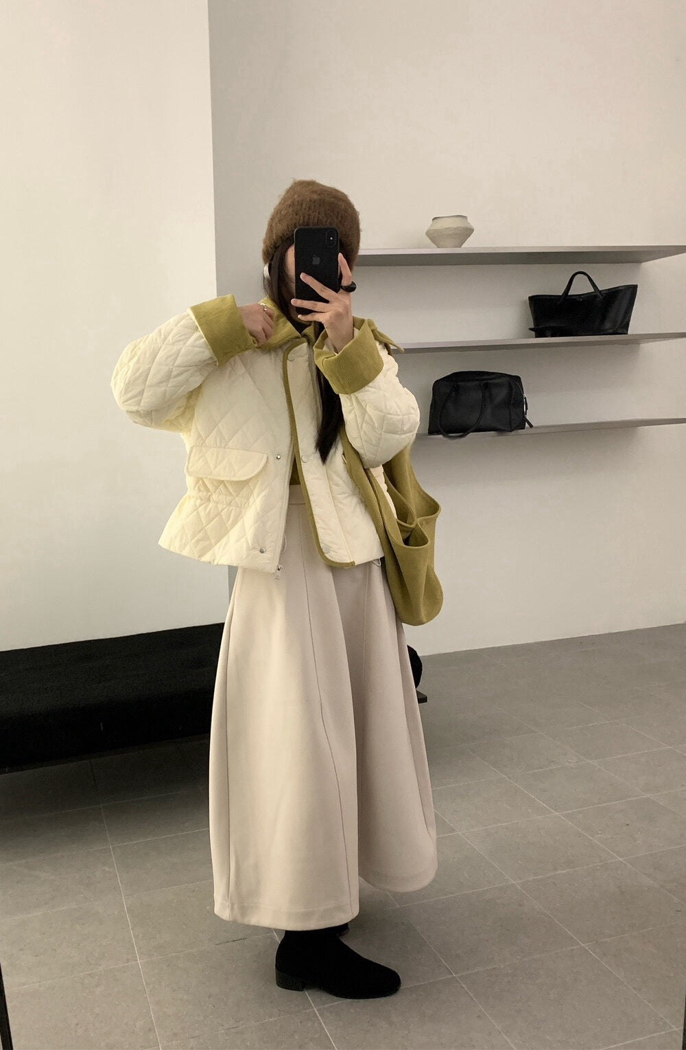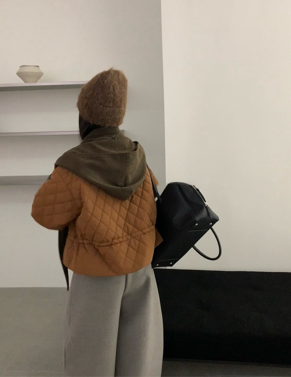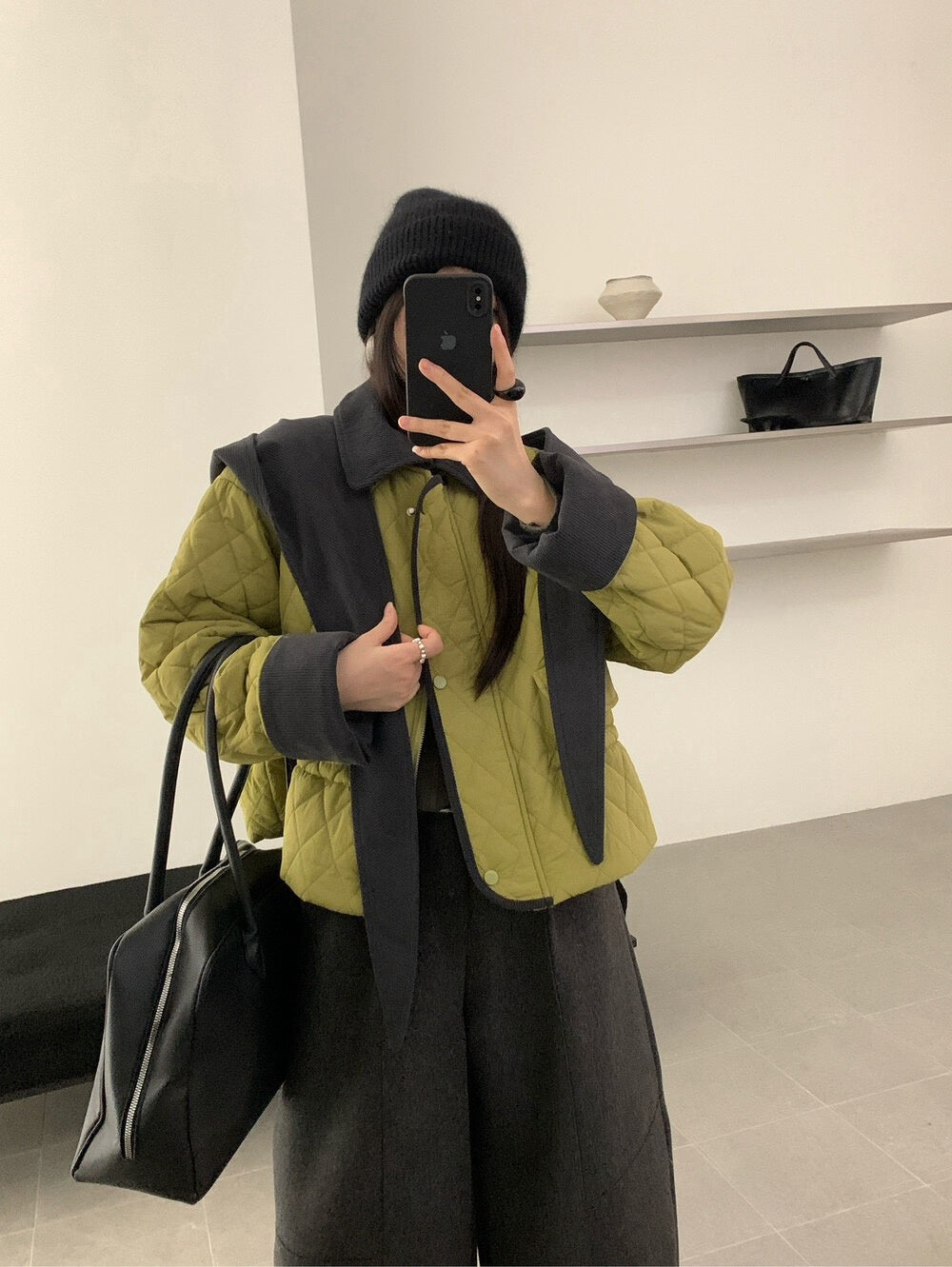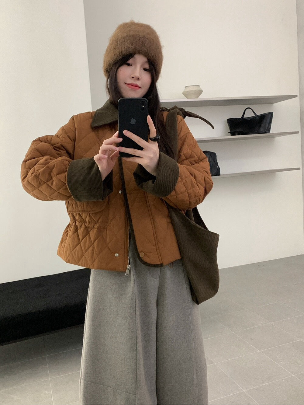 // 撞色包邊拼燈芯絨領可束腰菱格夾棉短外套(帽子可拆)