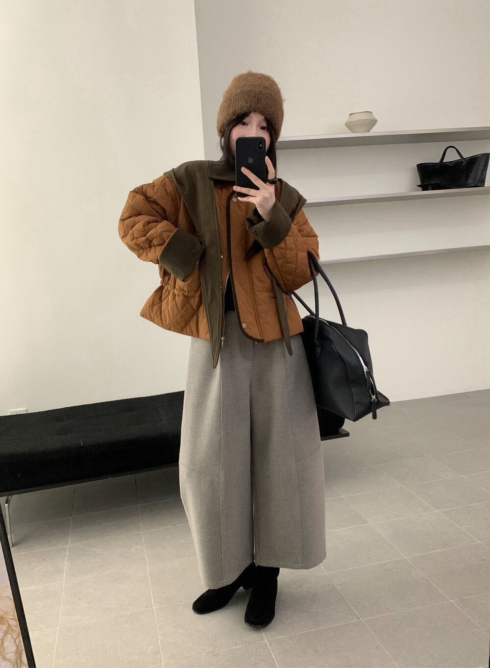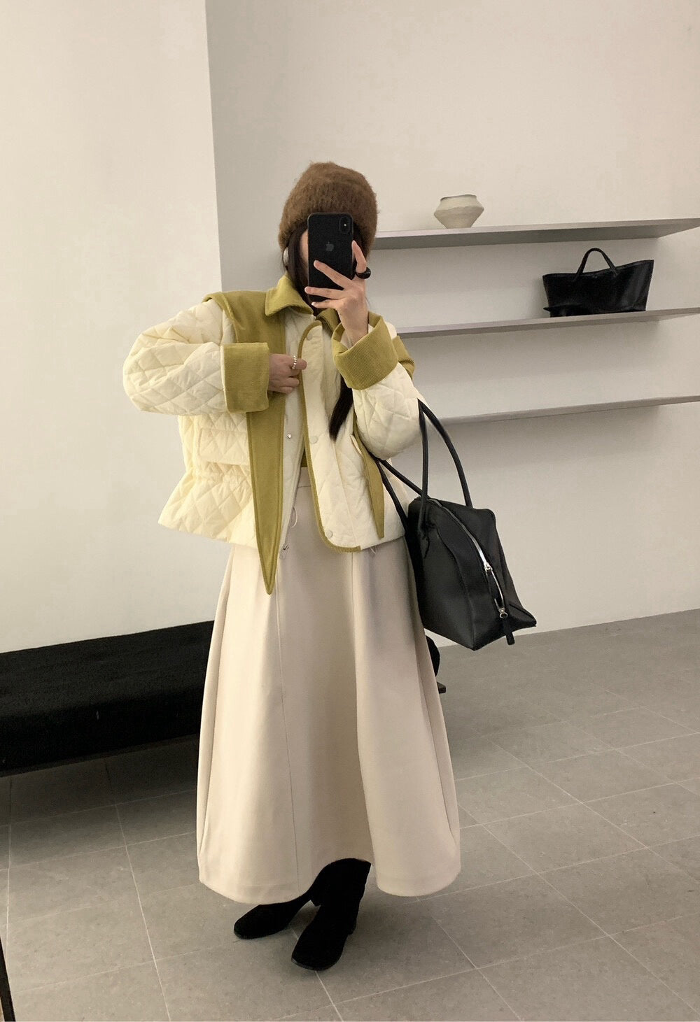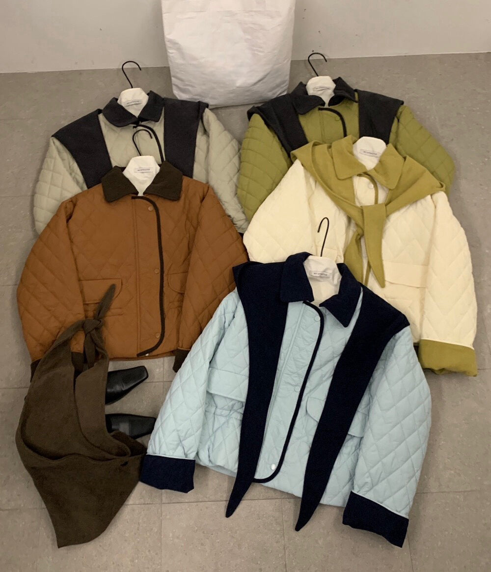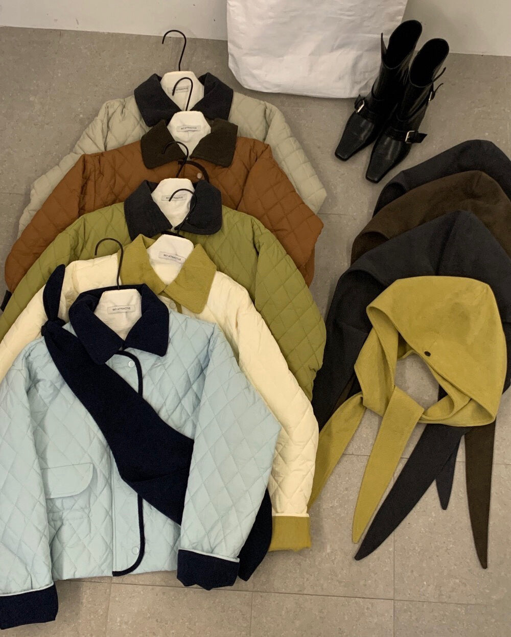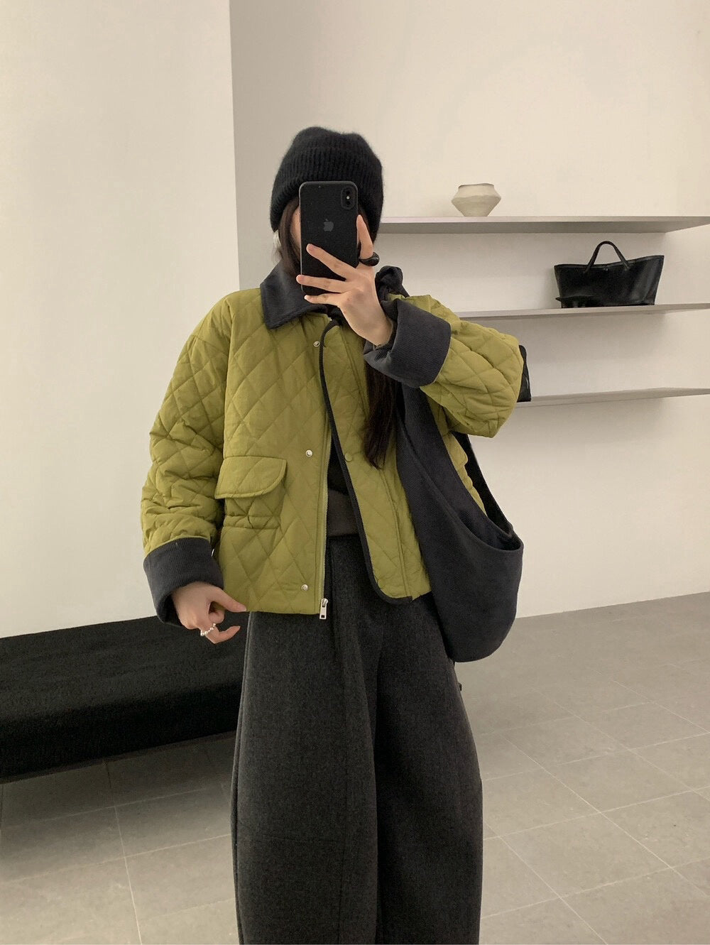 // 撞色包邊拼燈芯絨領可束腰菱格夾棉短外套(帽子可拆)
