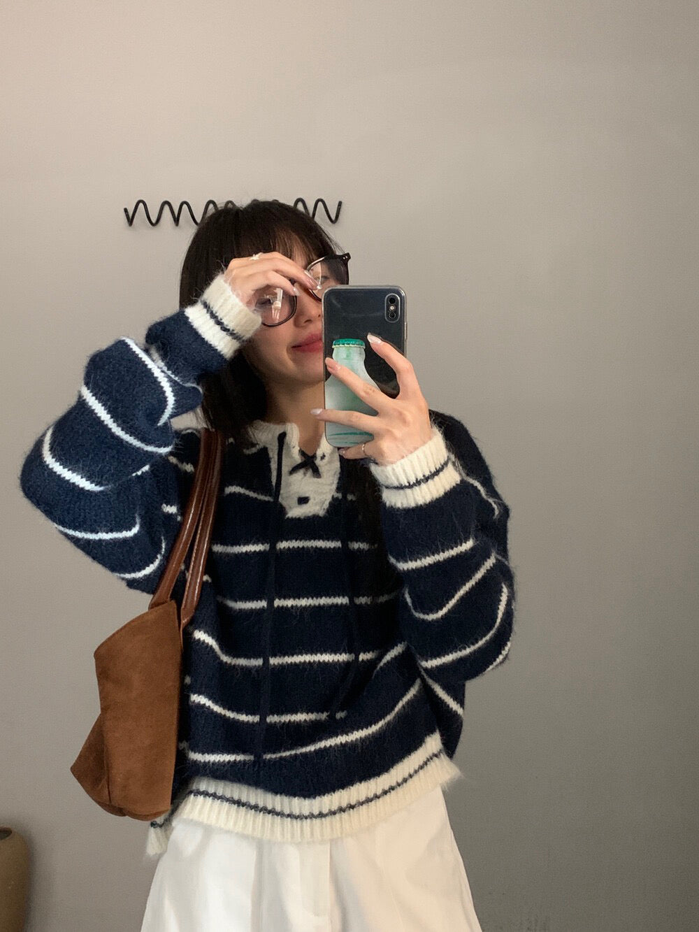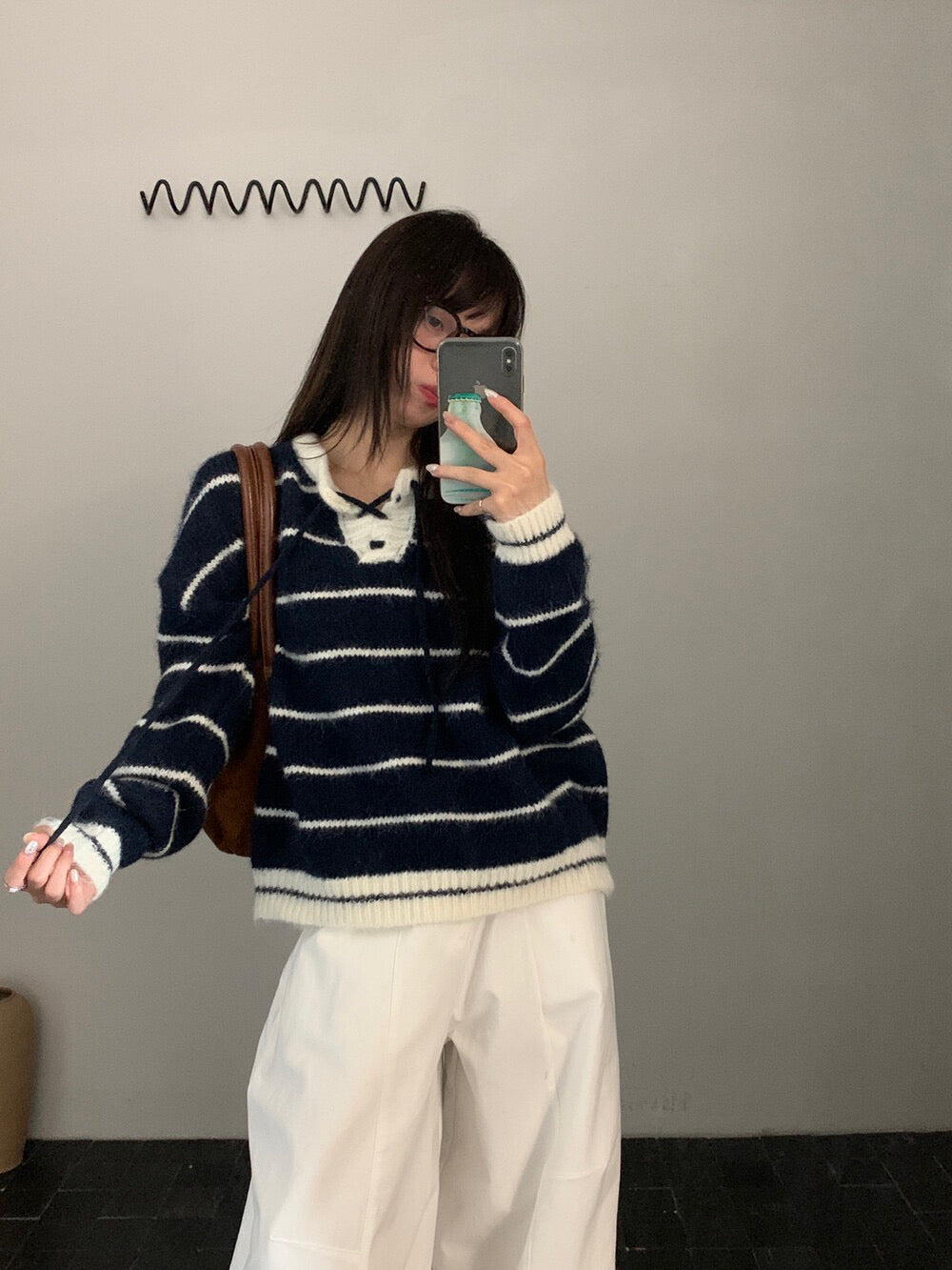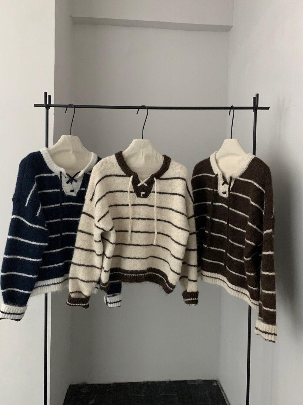 // 撞色綁帶領口間條毛衣