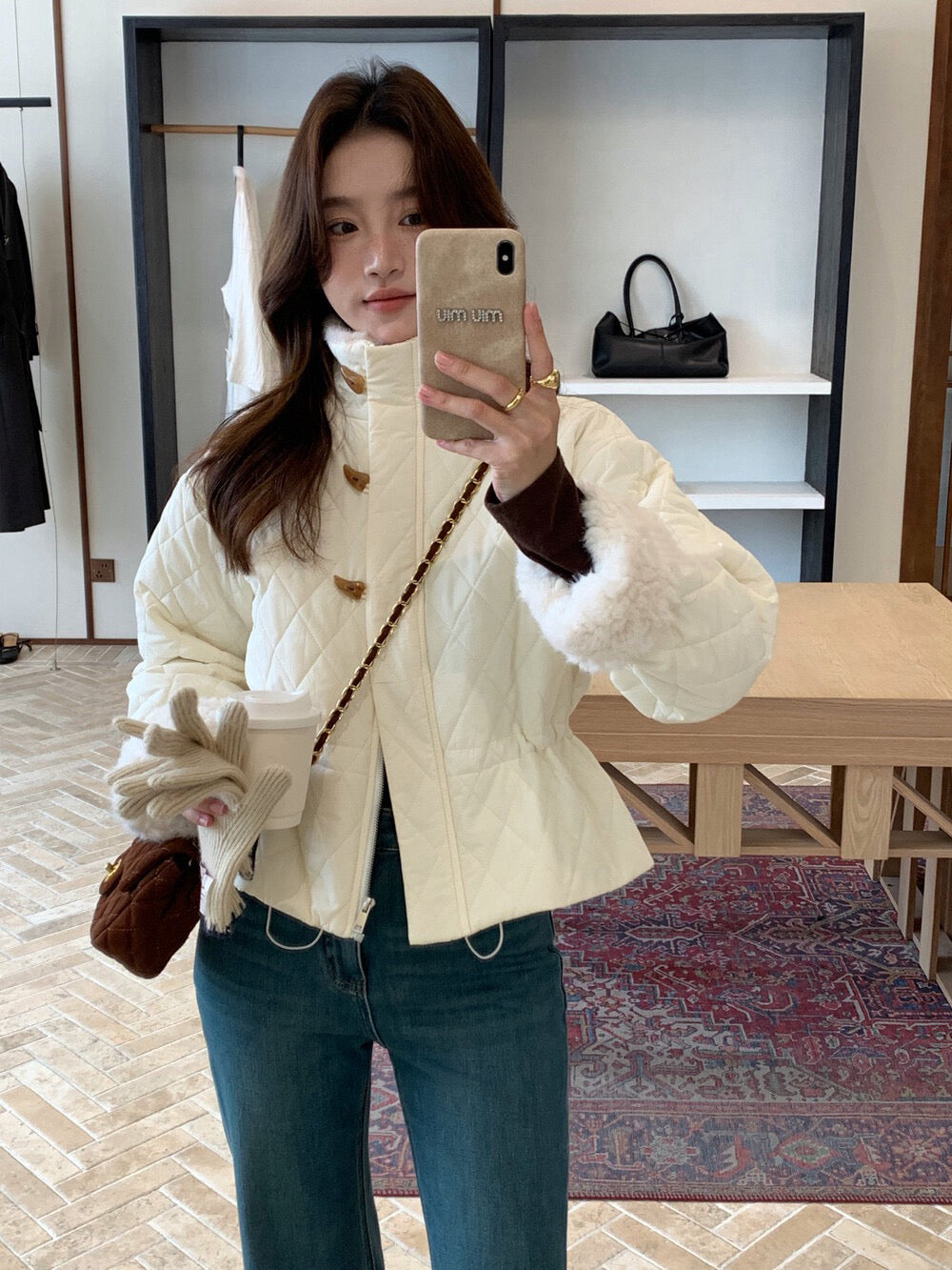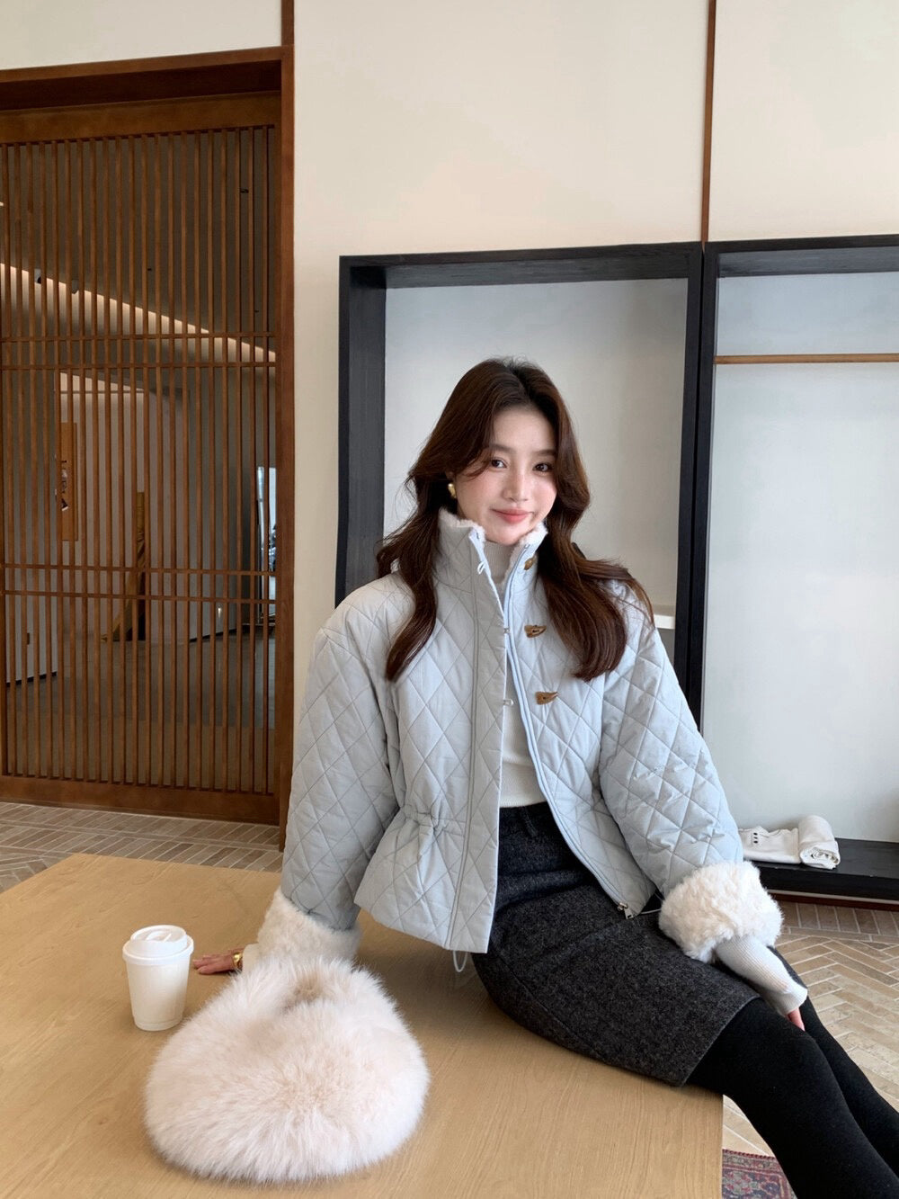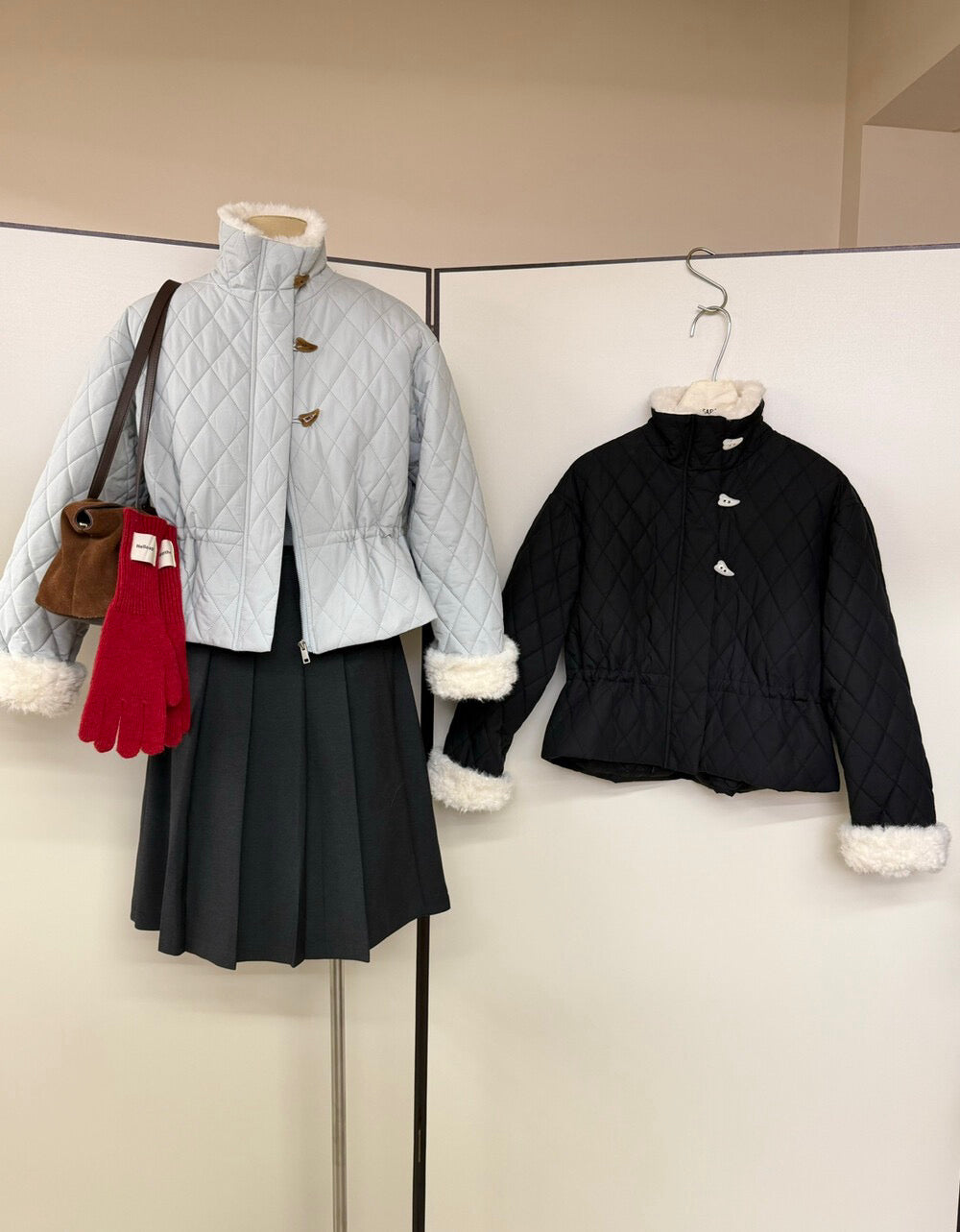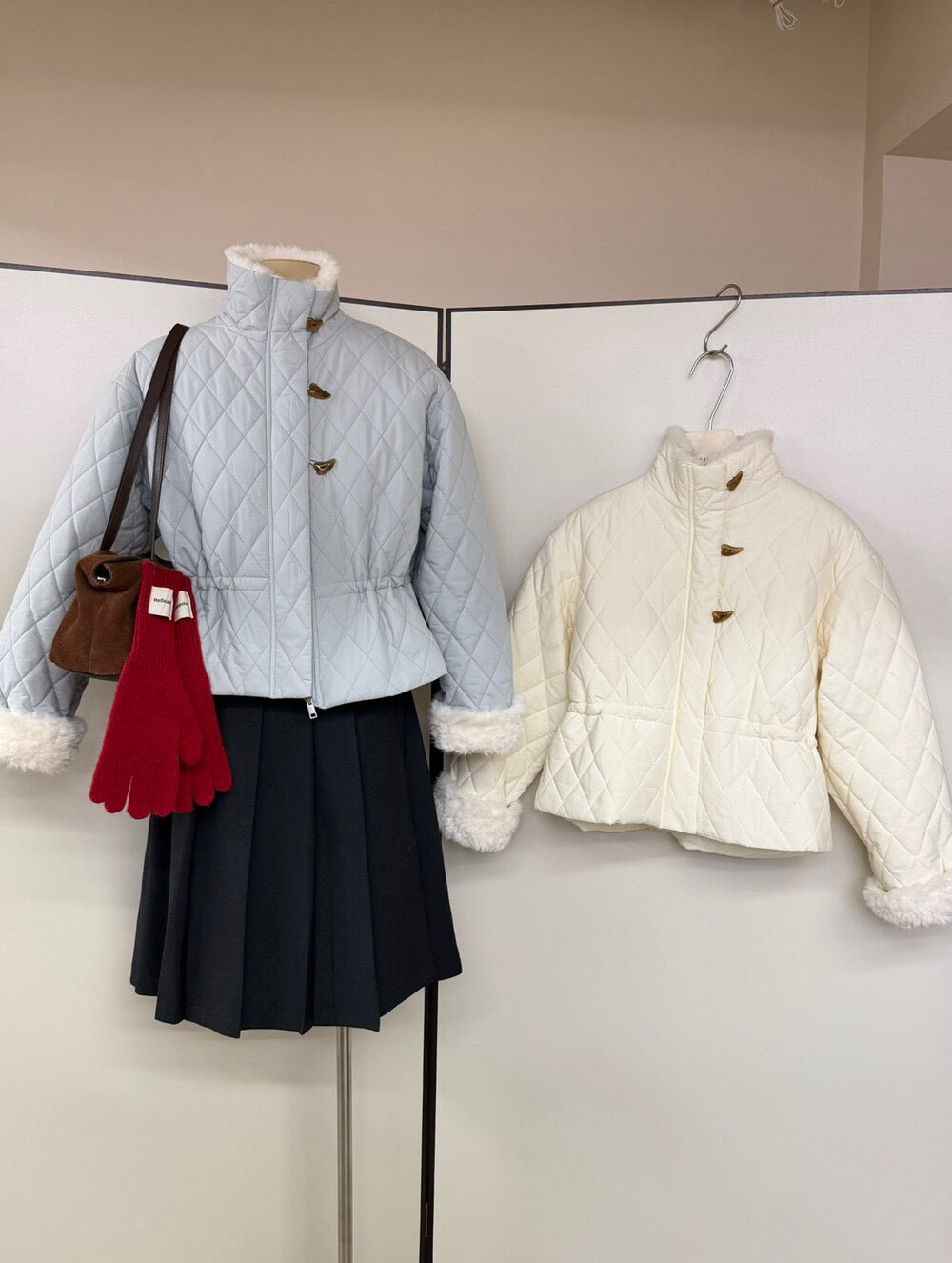 // 毛毛邊可抽繩腰牛角鈕菱格夾棉短外套