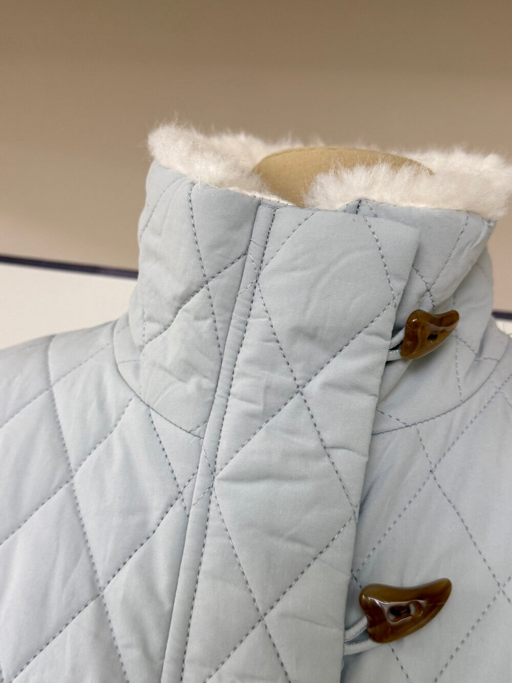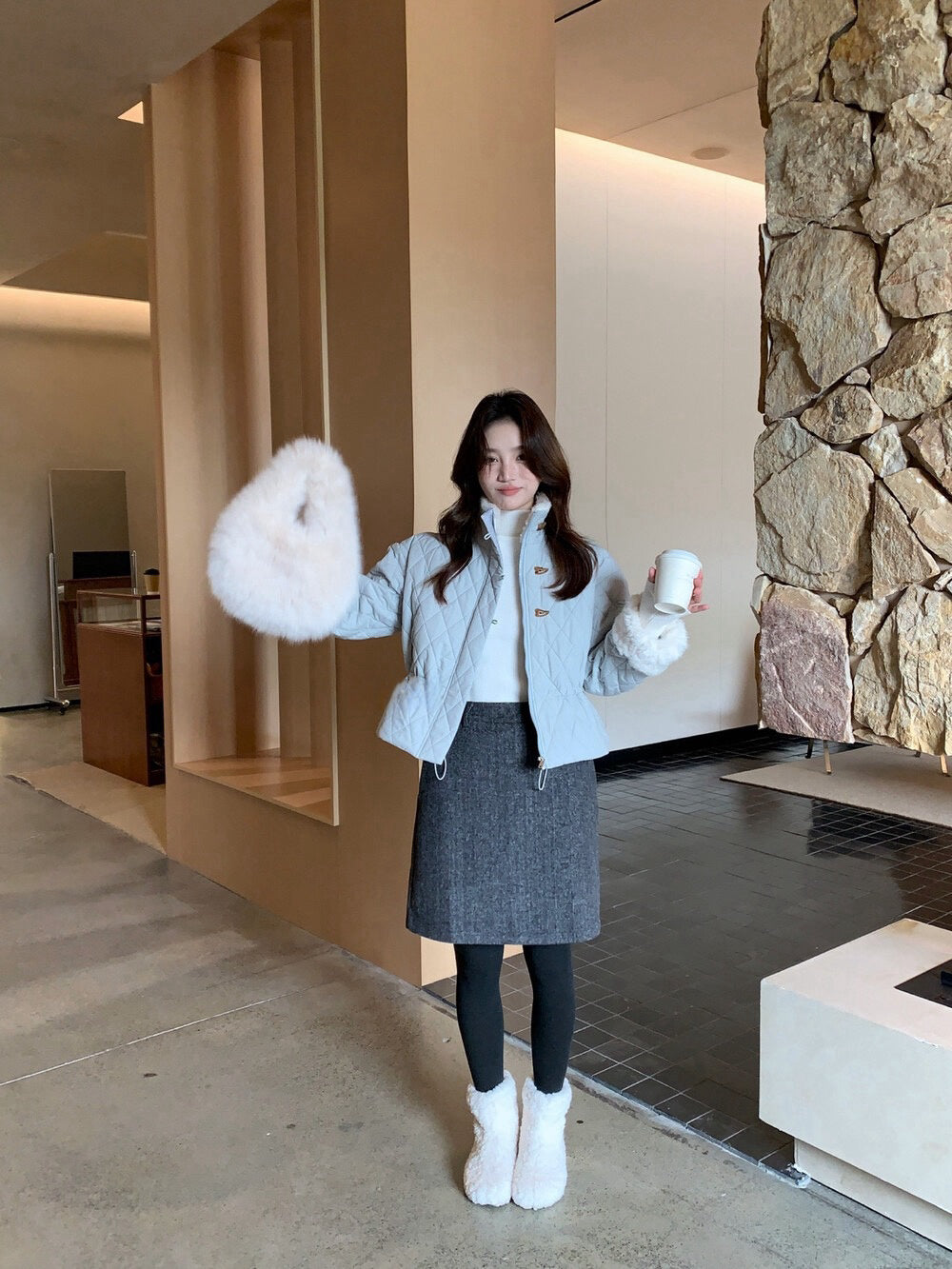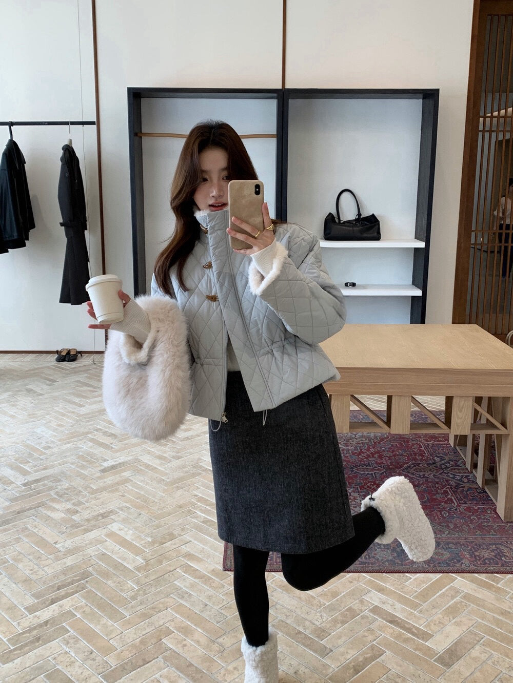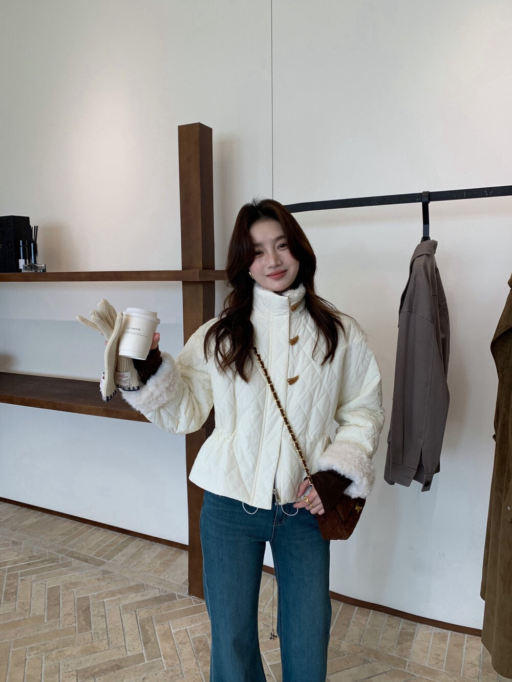 // 毛毛邊可抽繩腰牛角鈕菱格夾棉短外套