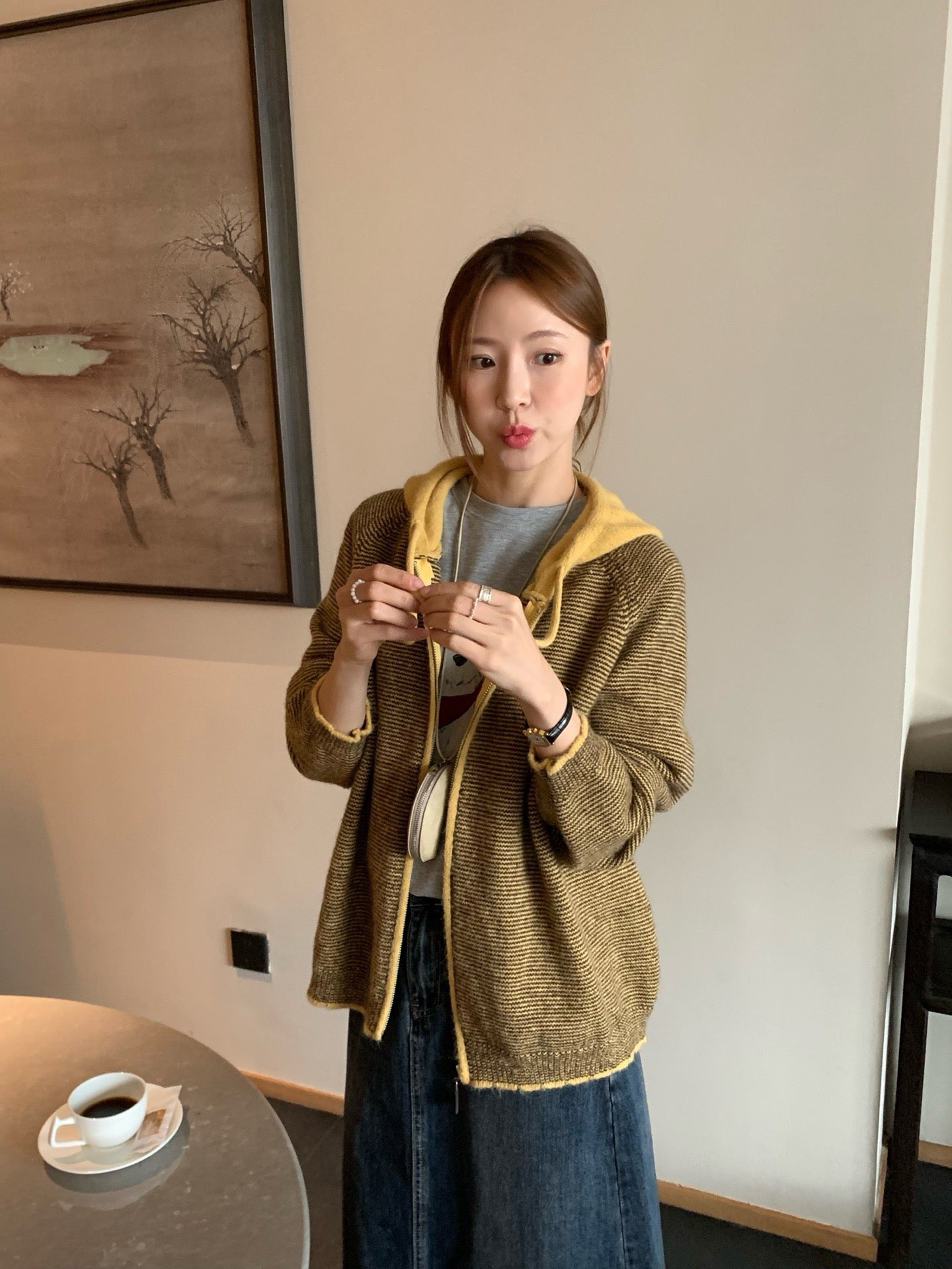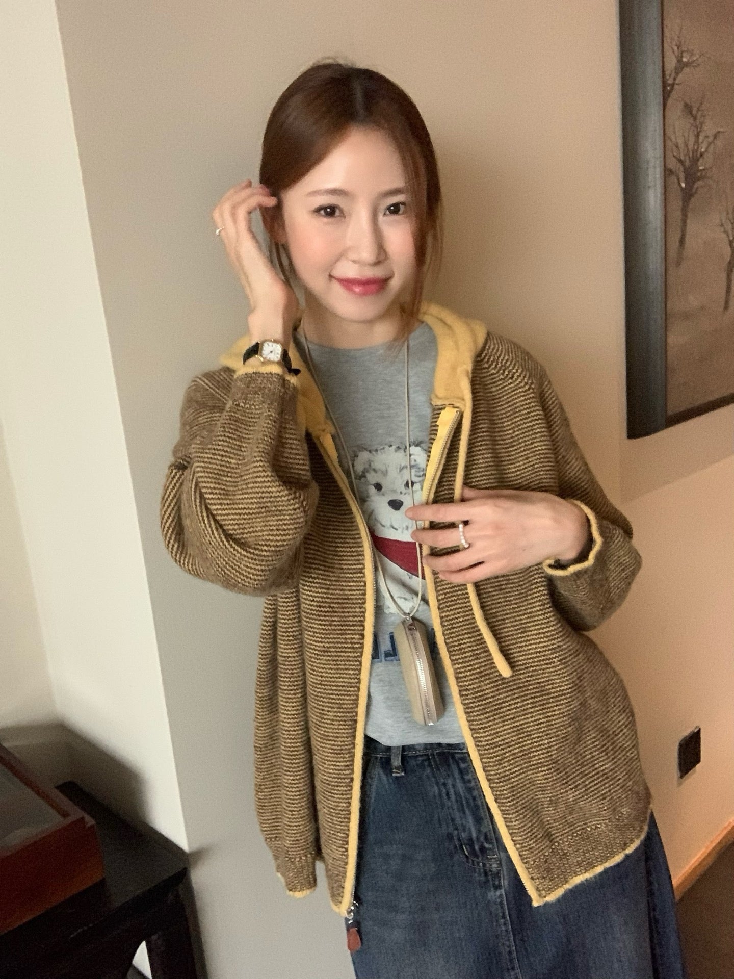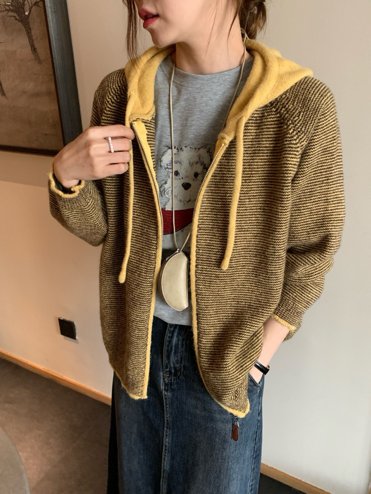 // 拼色連帽細間條拉鍊CD