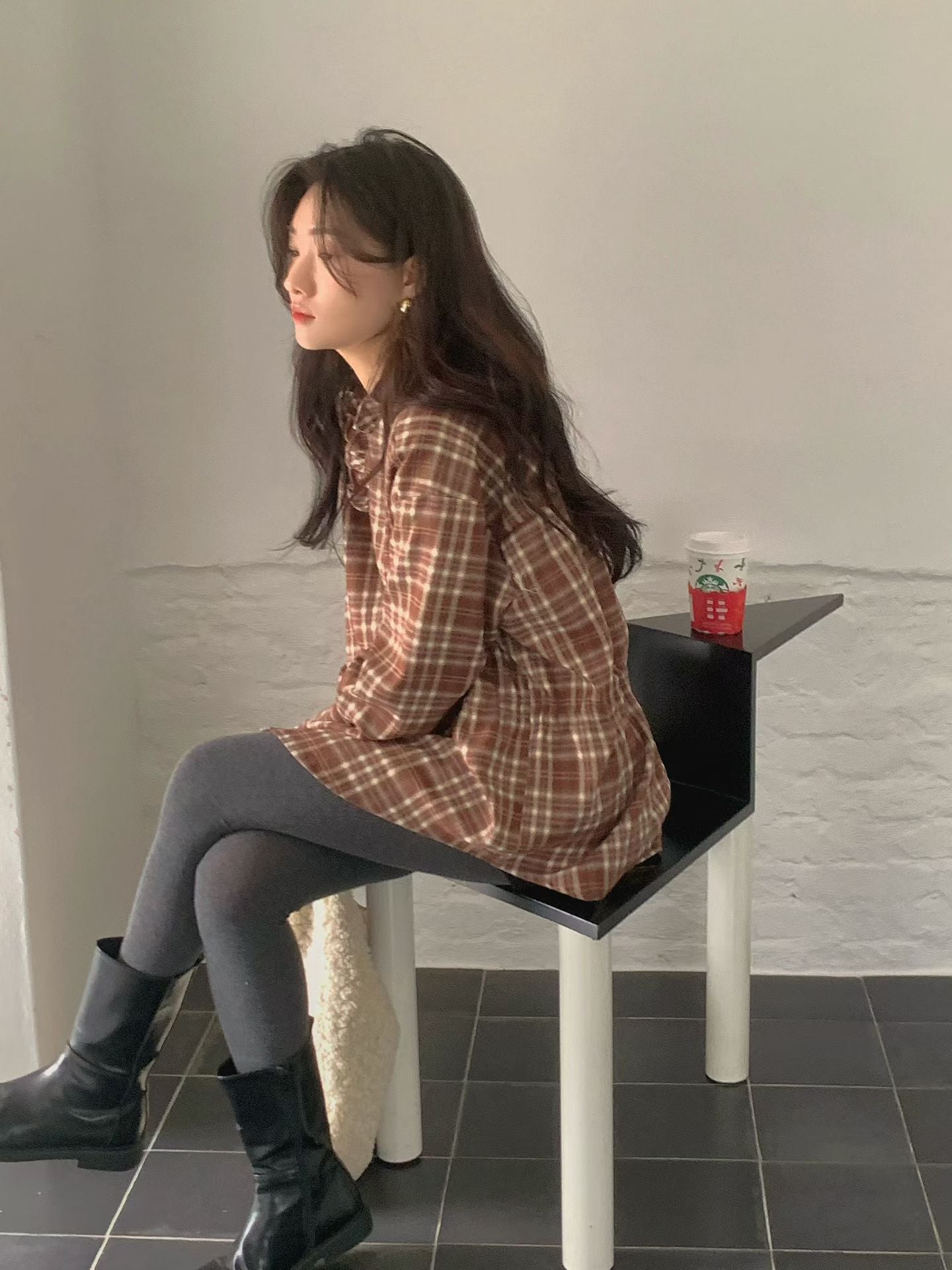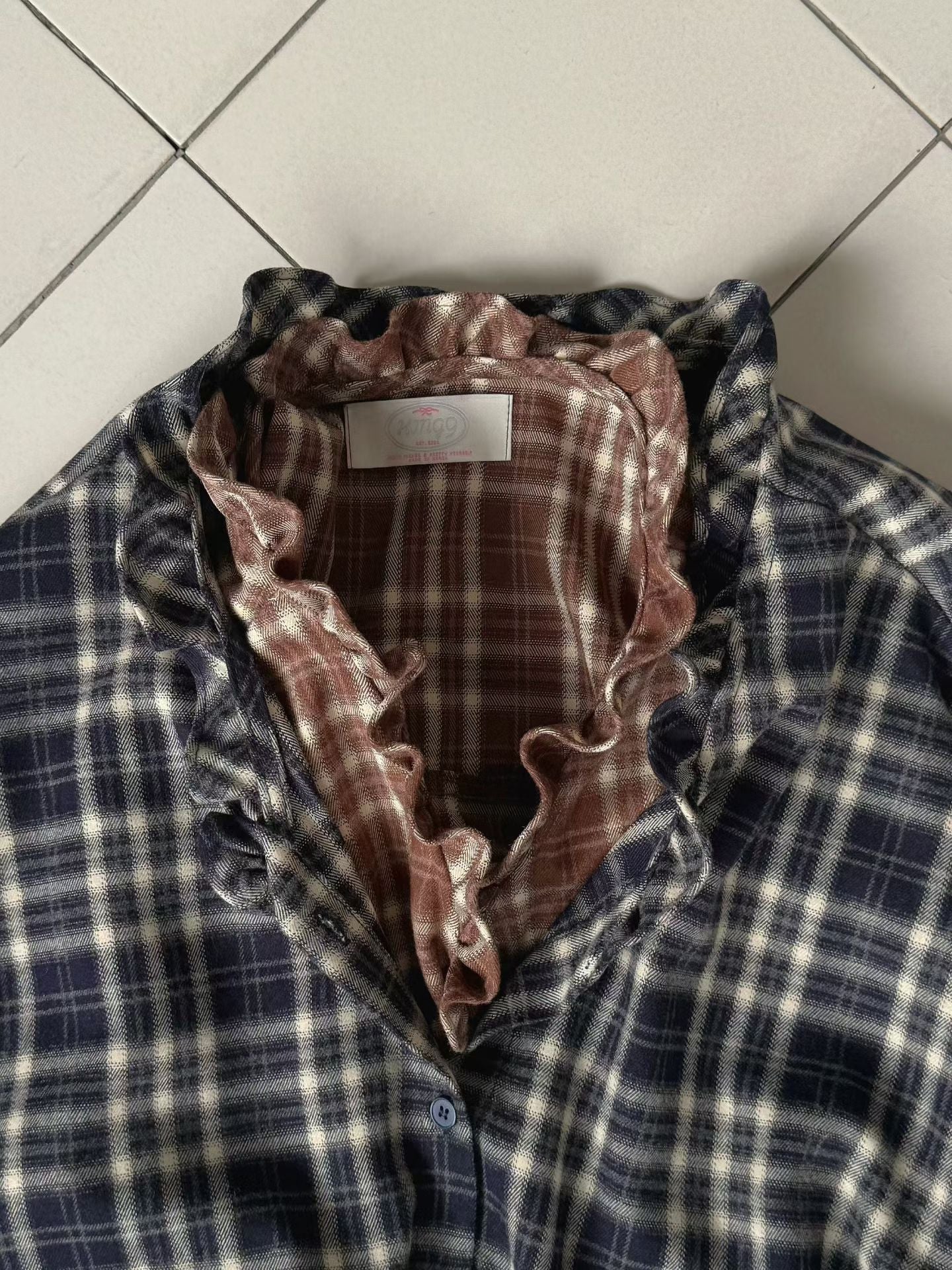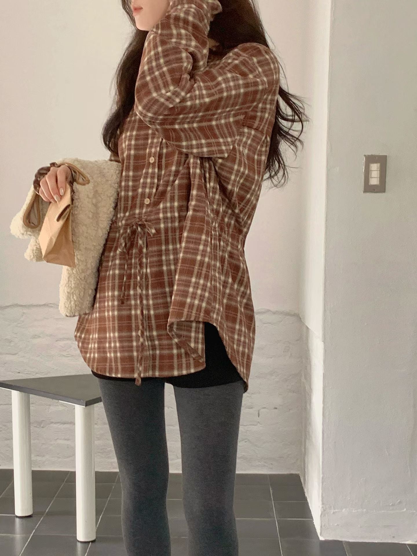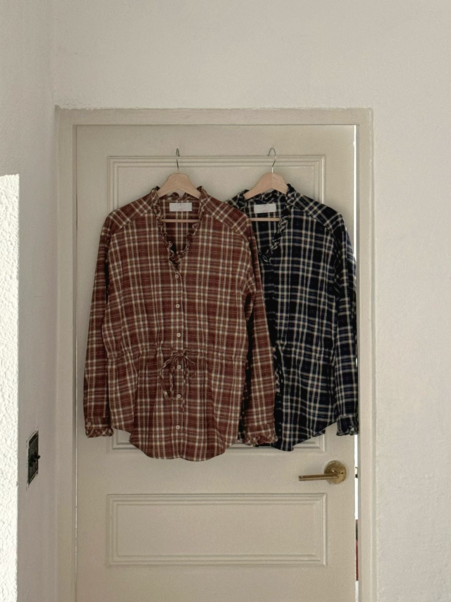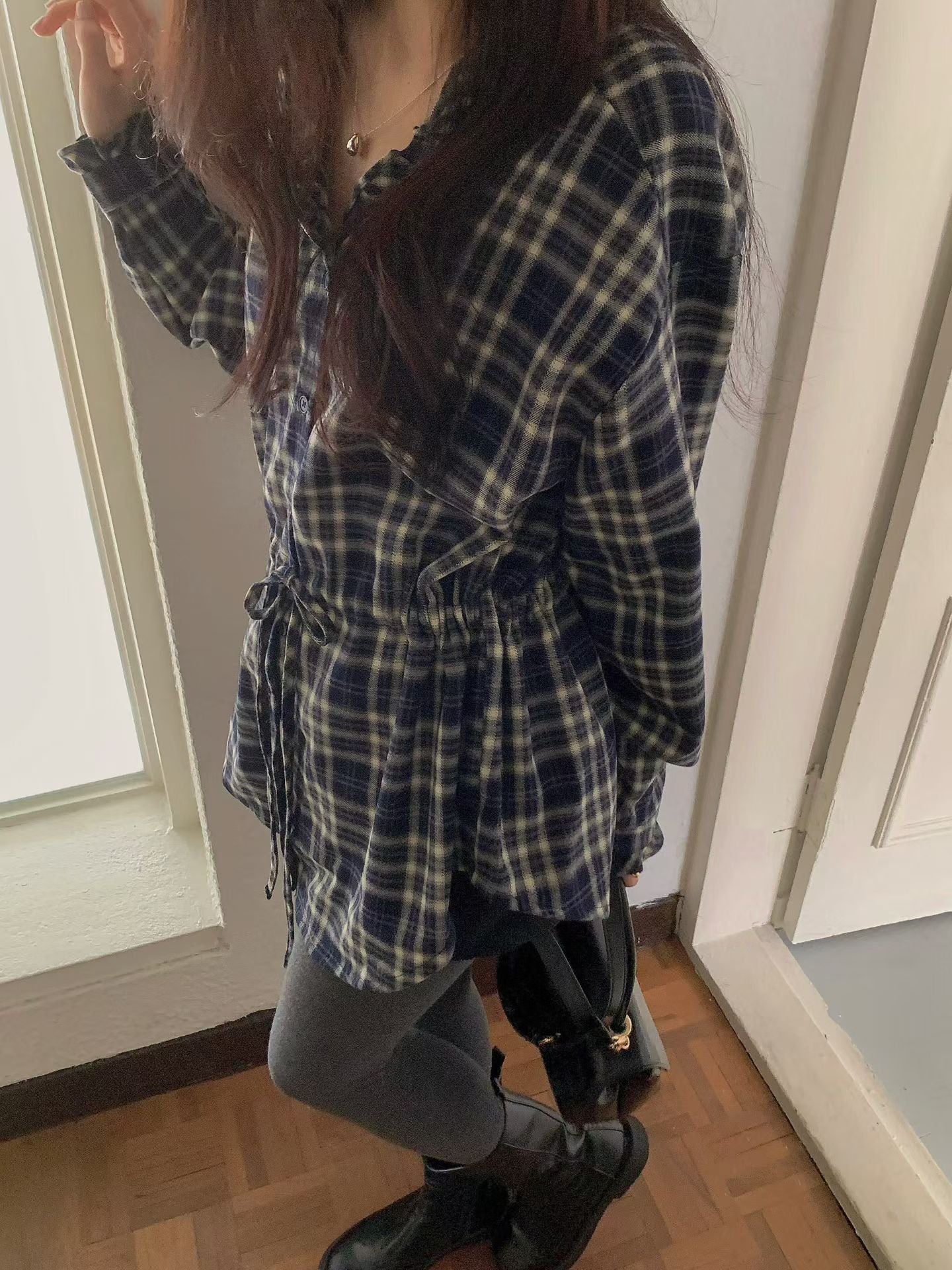 // 木耳邊可綁腰格紋BL