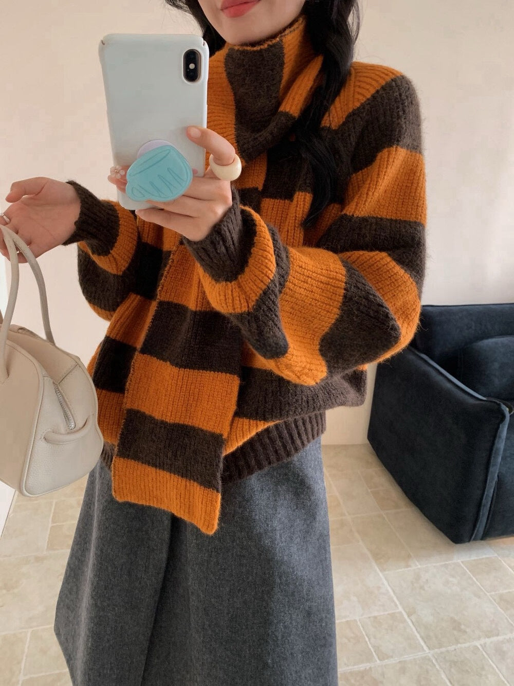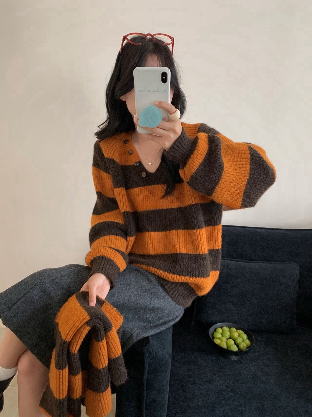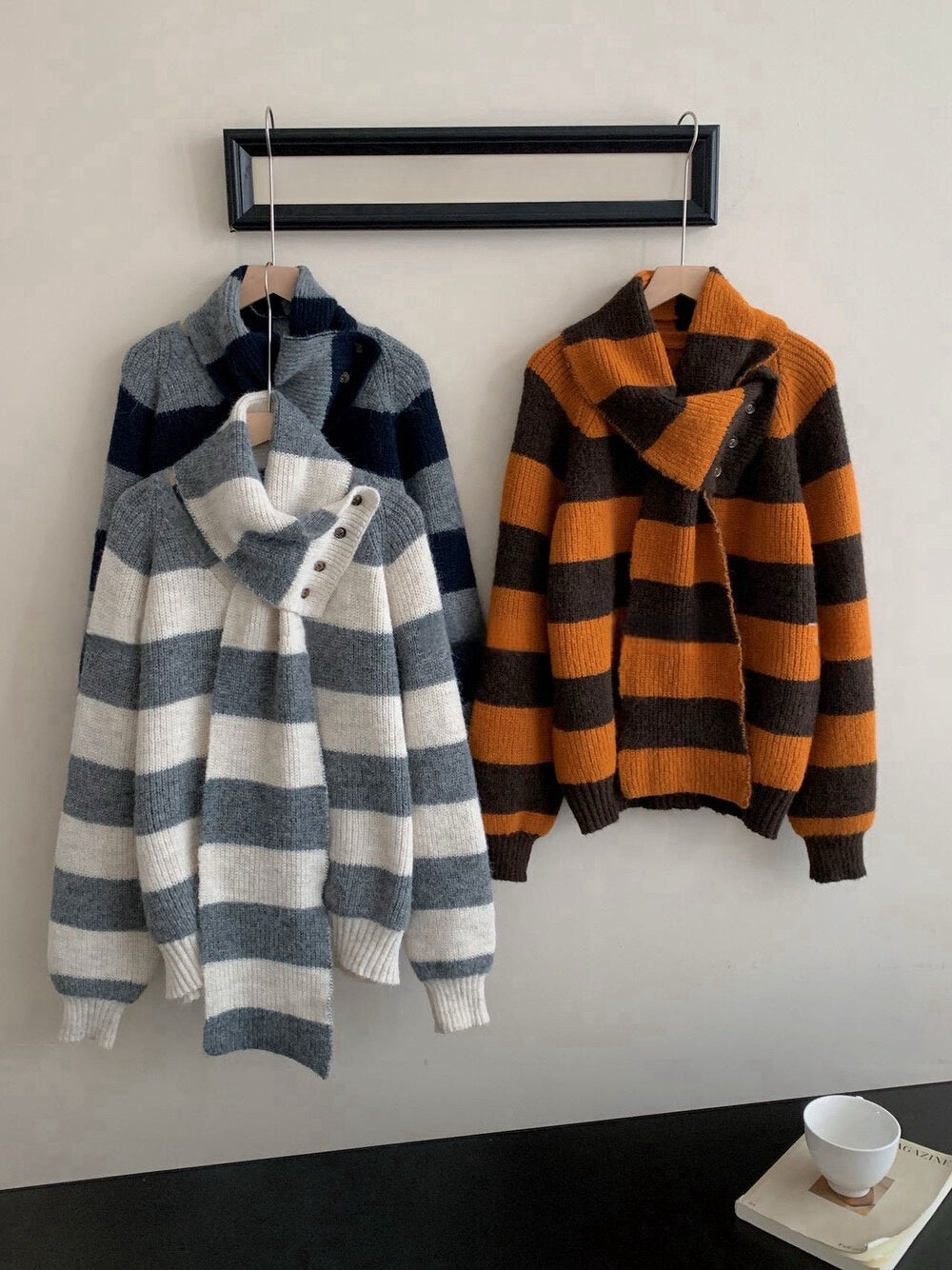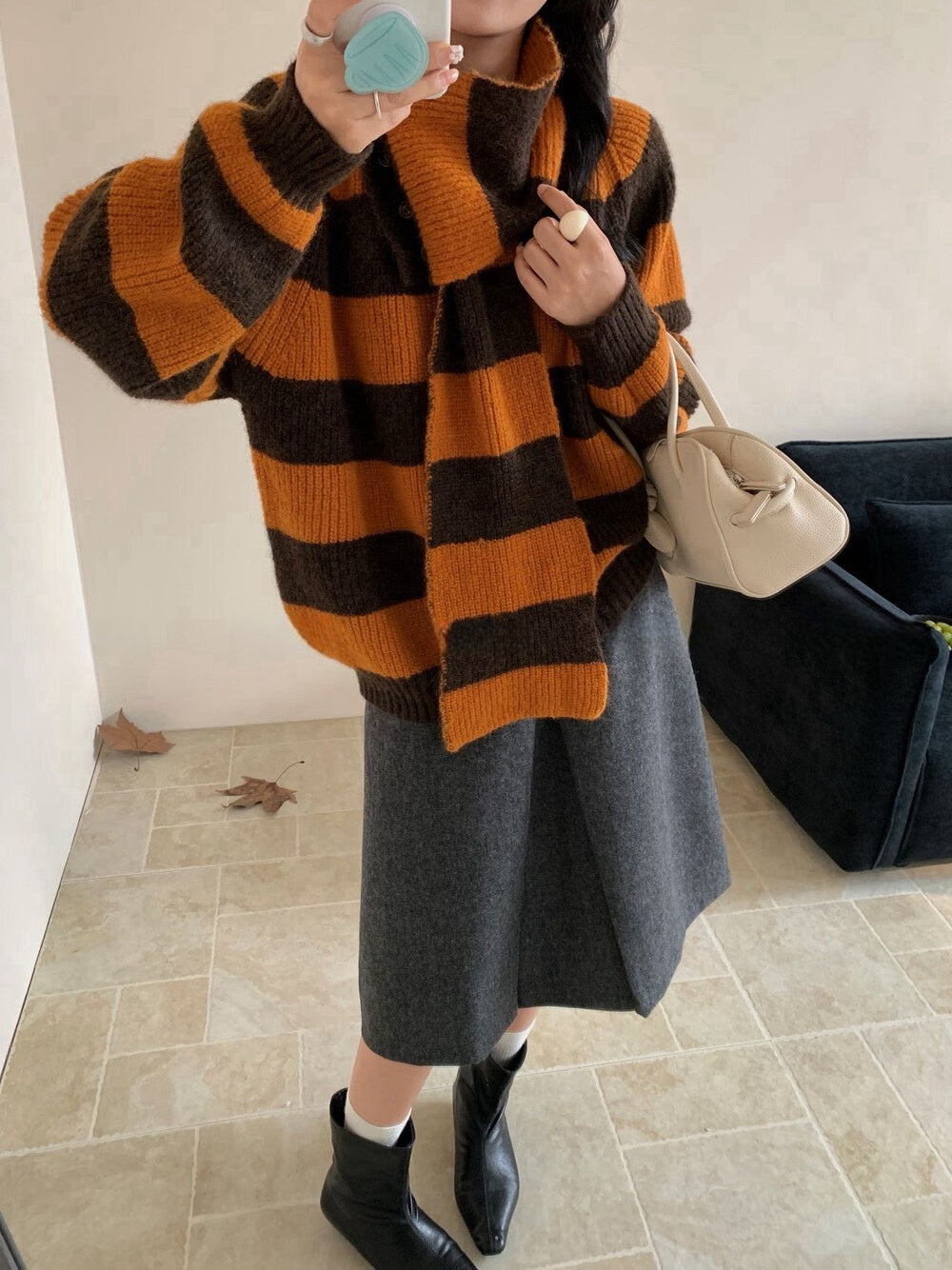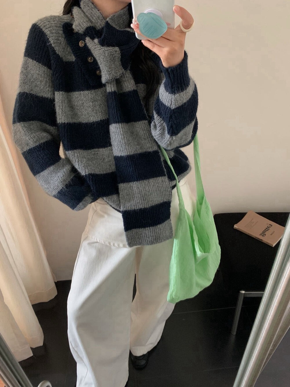 // 連可拆頸巾粗間條鈕扣V領毛衣