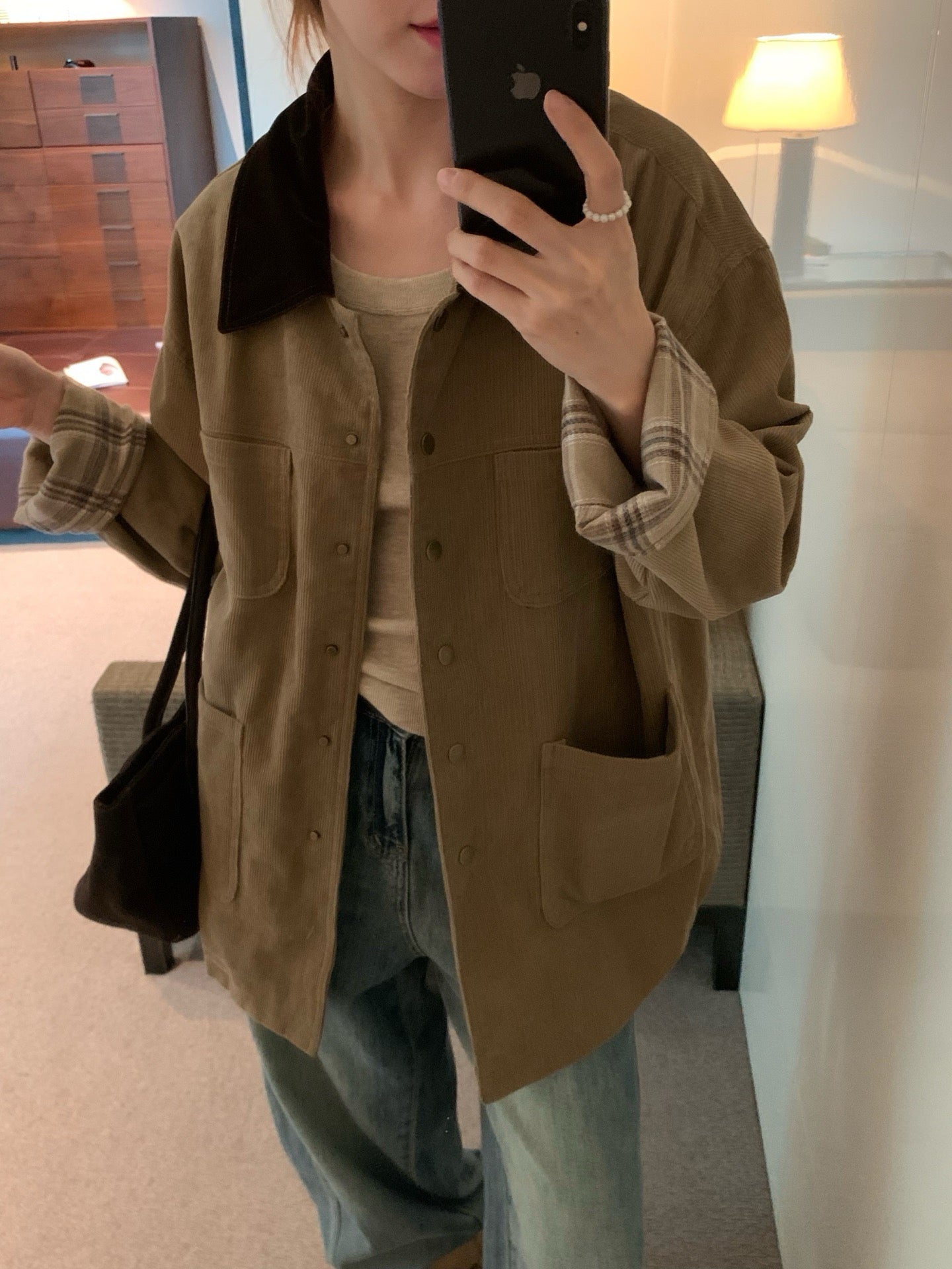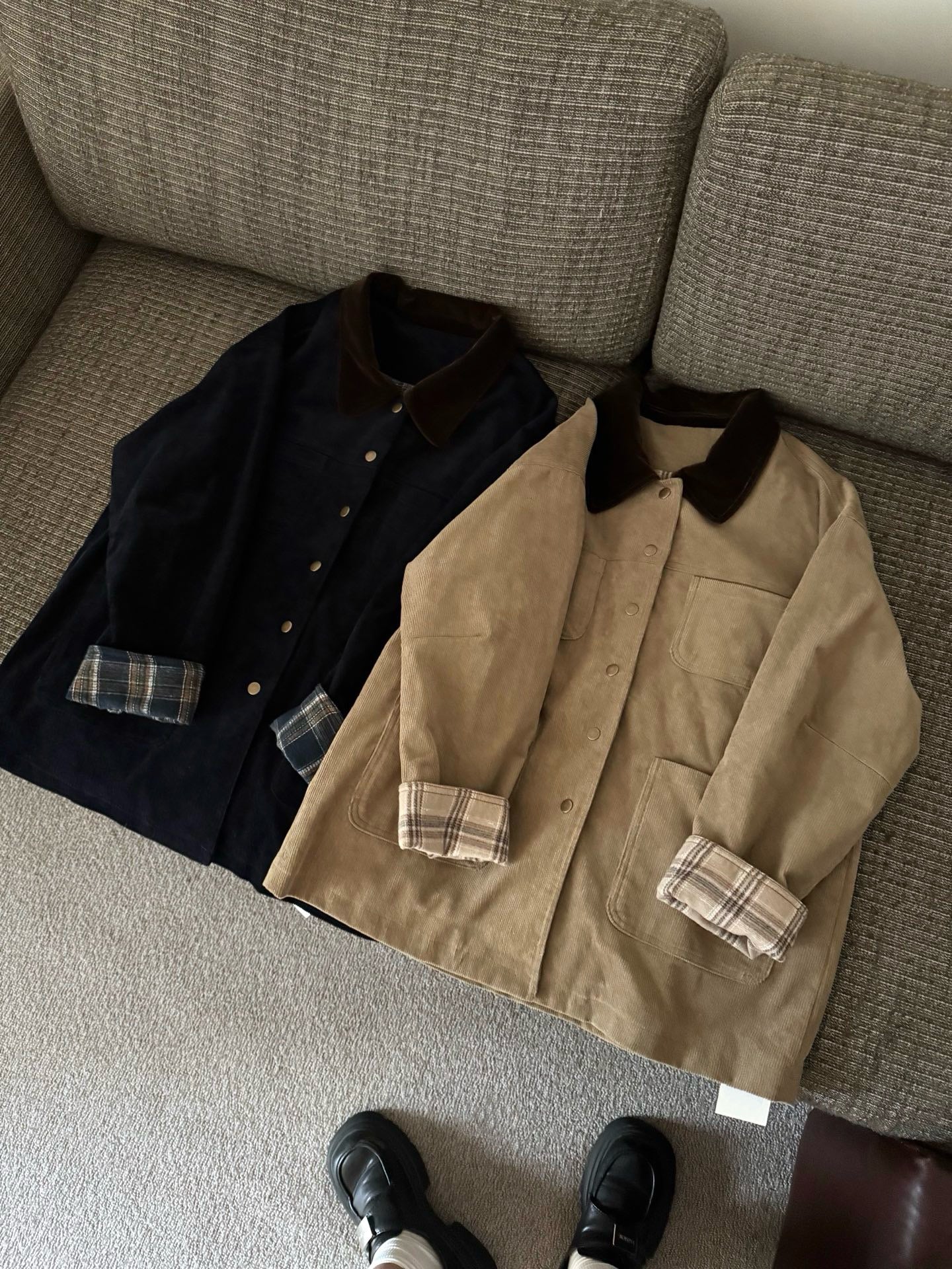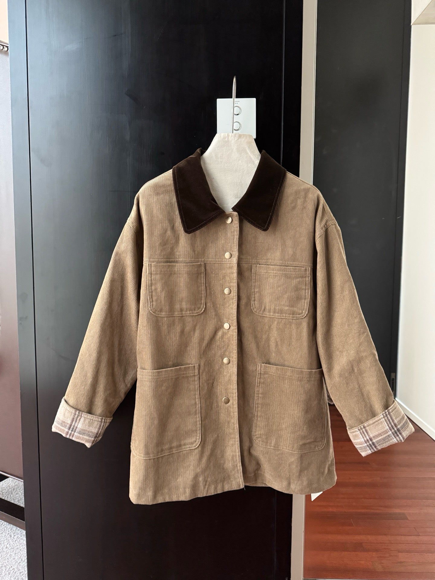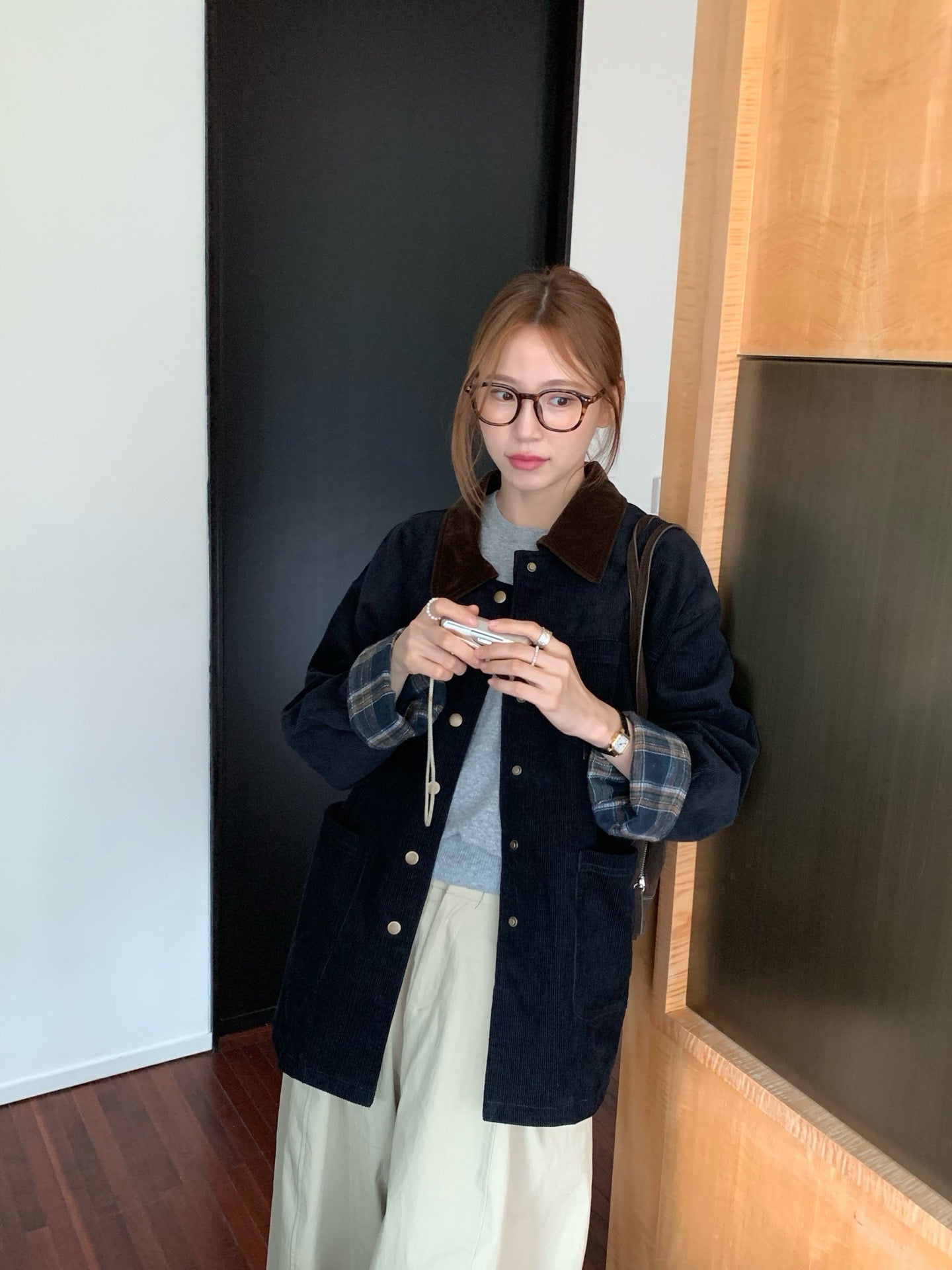 // 絨面領拼燈芯絨格紋拼布中長外套
