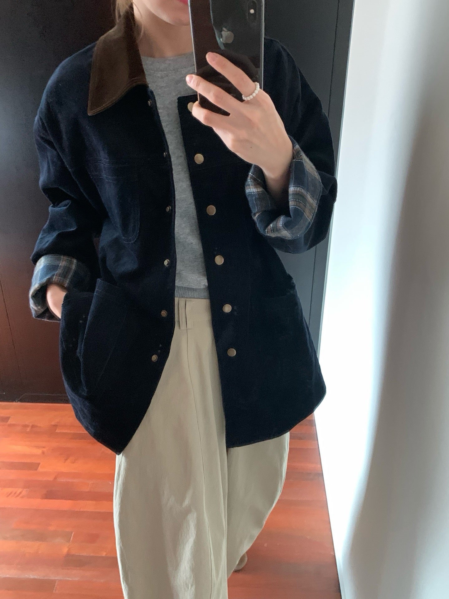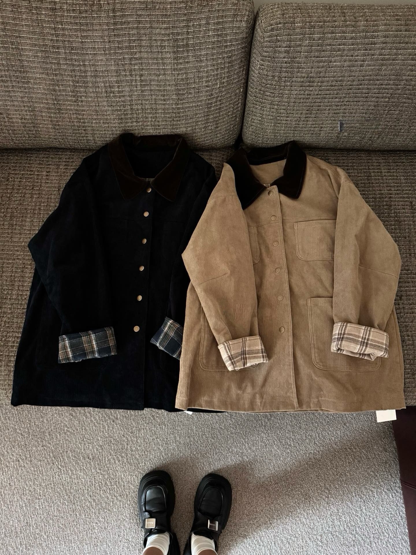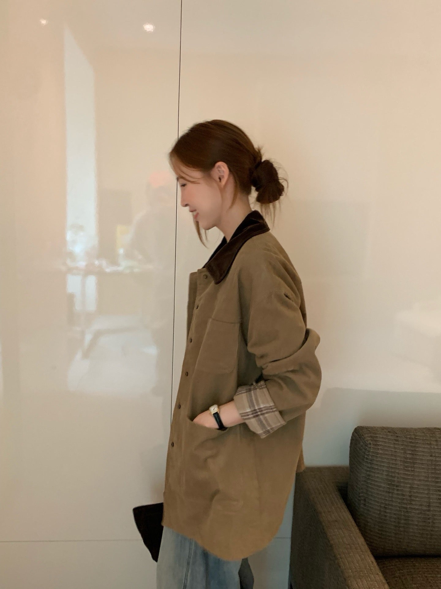 // 絨面領拼燈芯絨格紋拼布中長外套