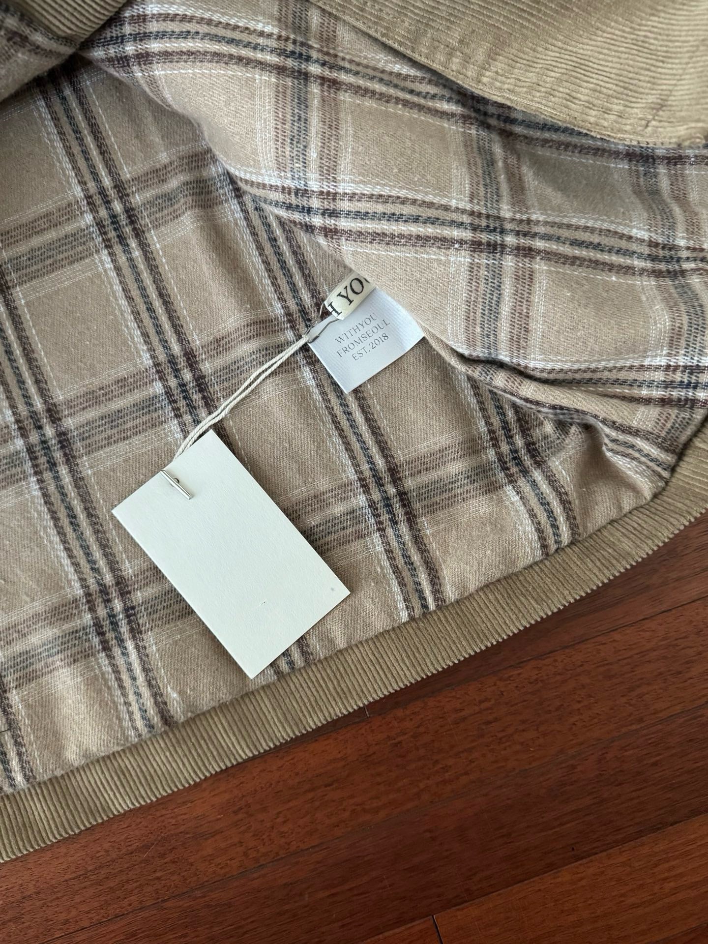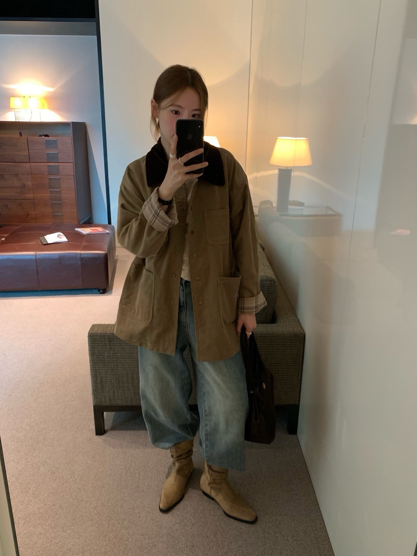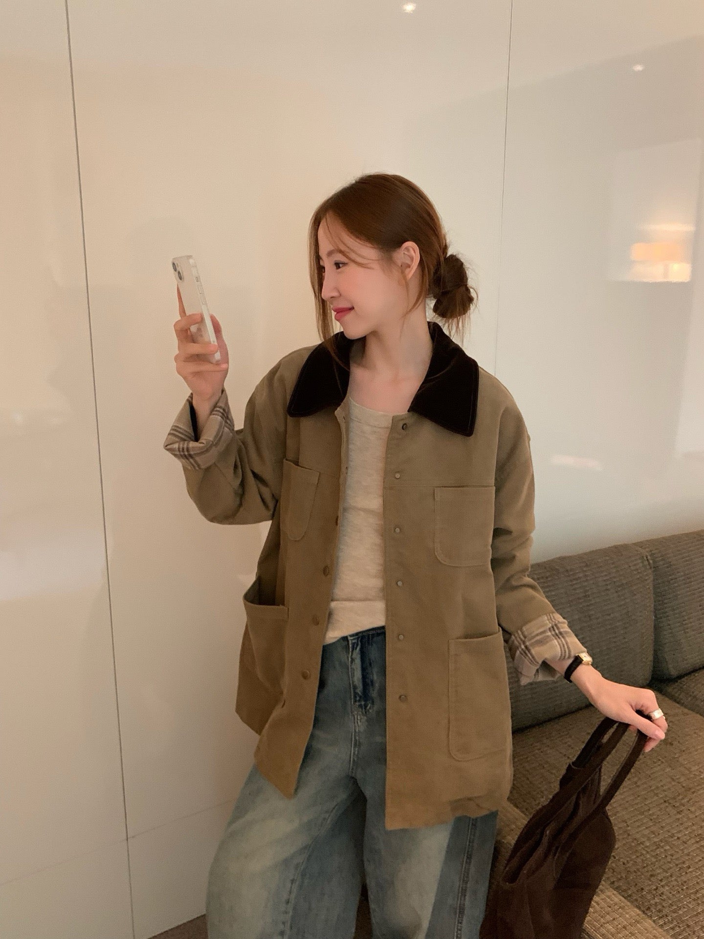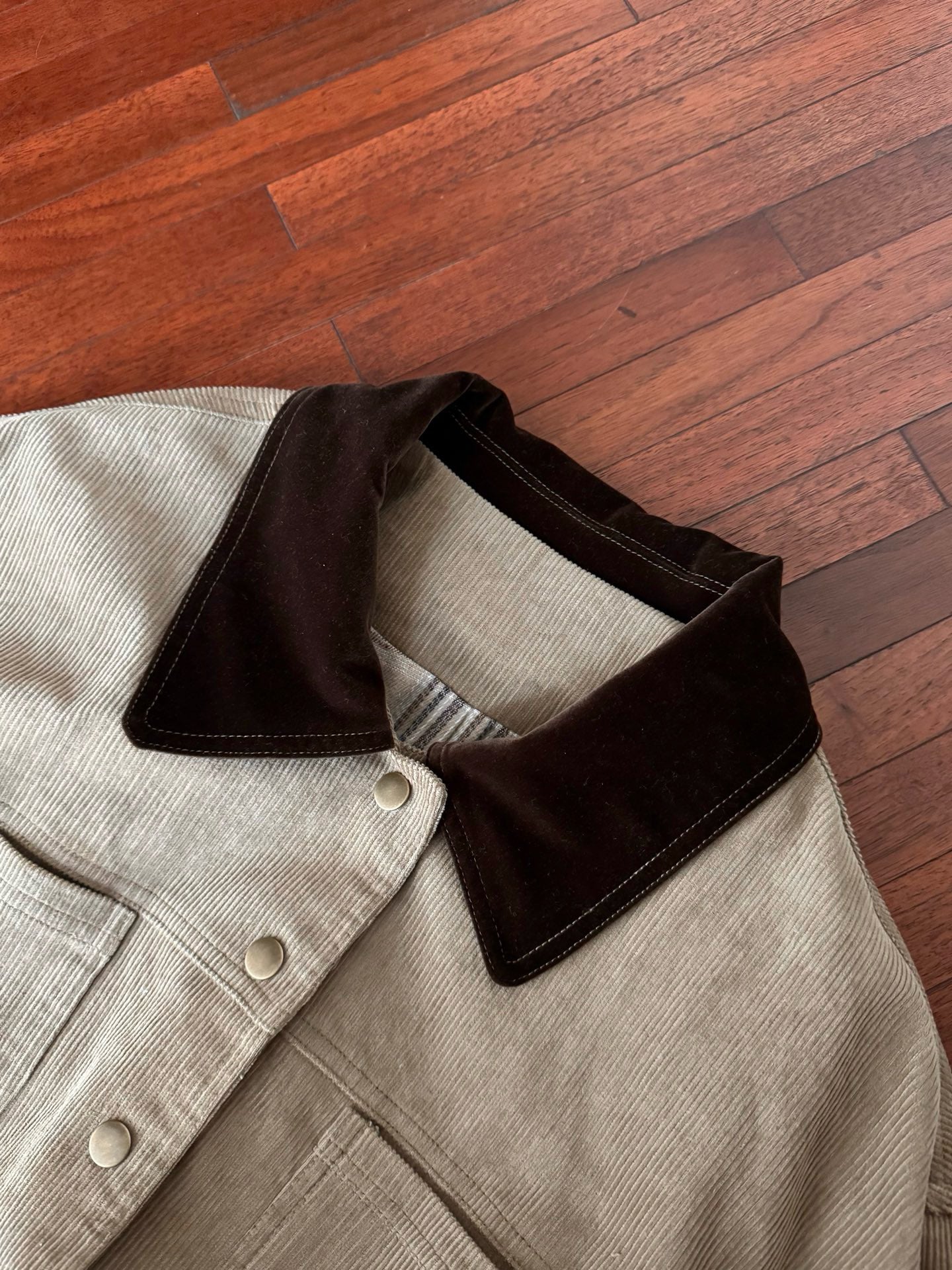 // 絨面領拼燈芯絨格紋拼布中長外套