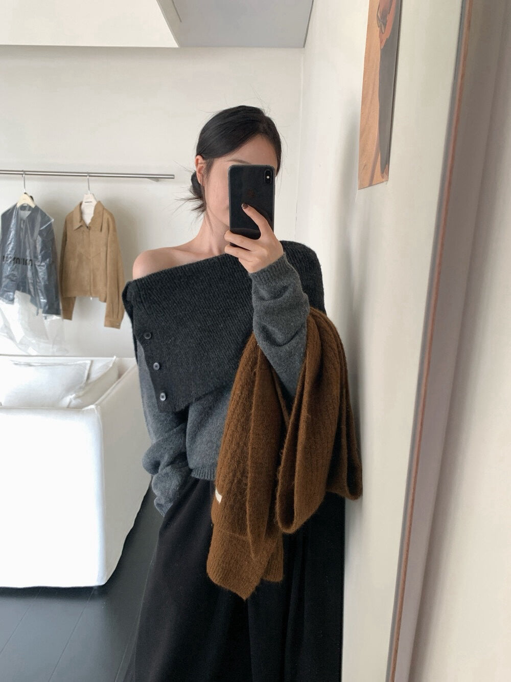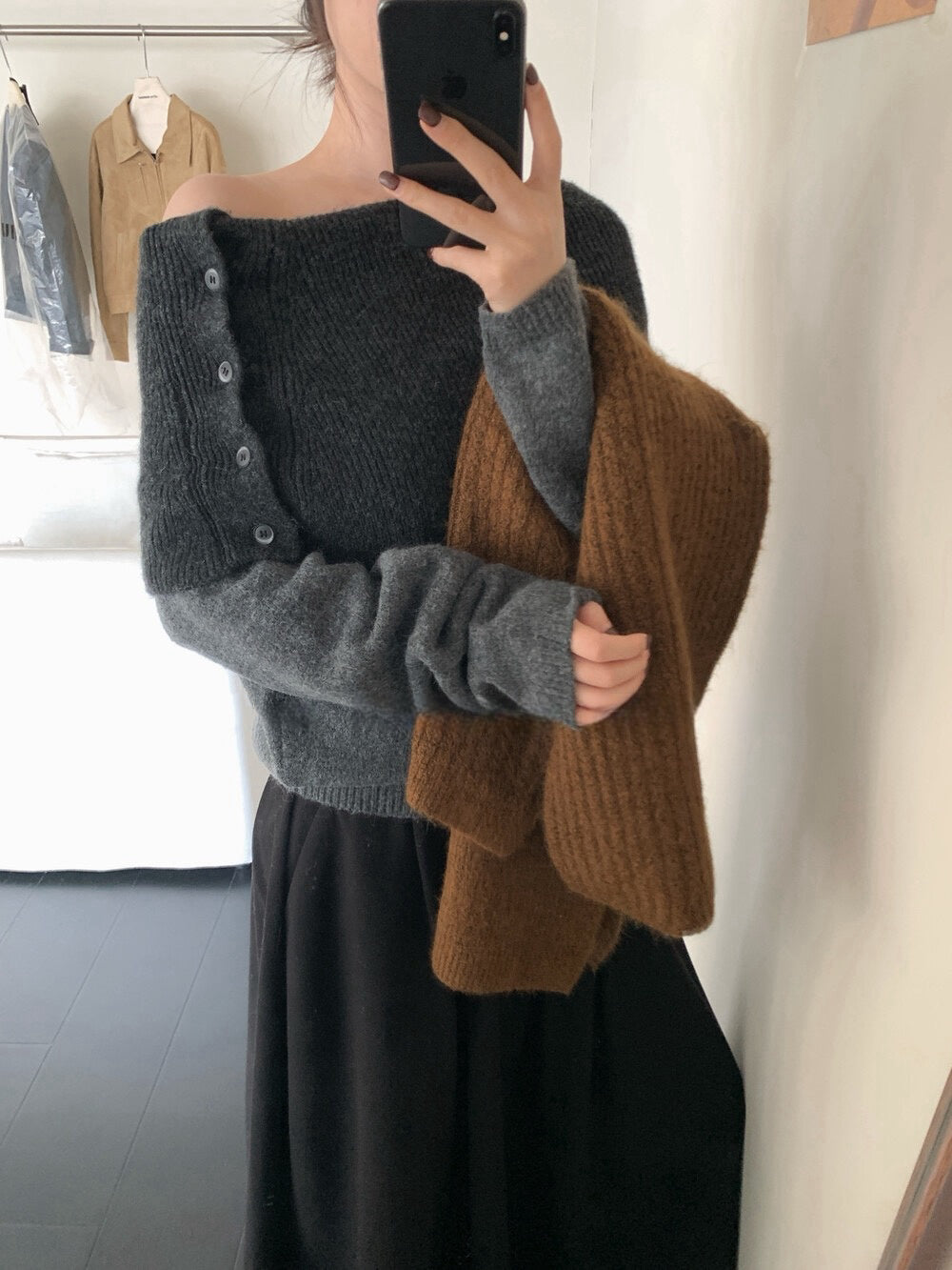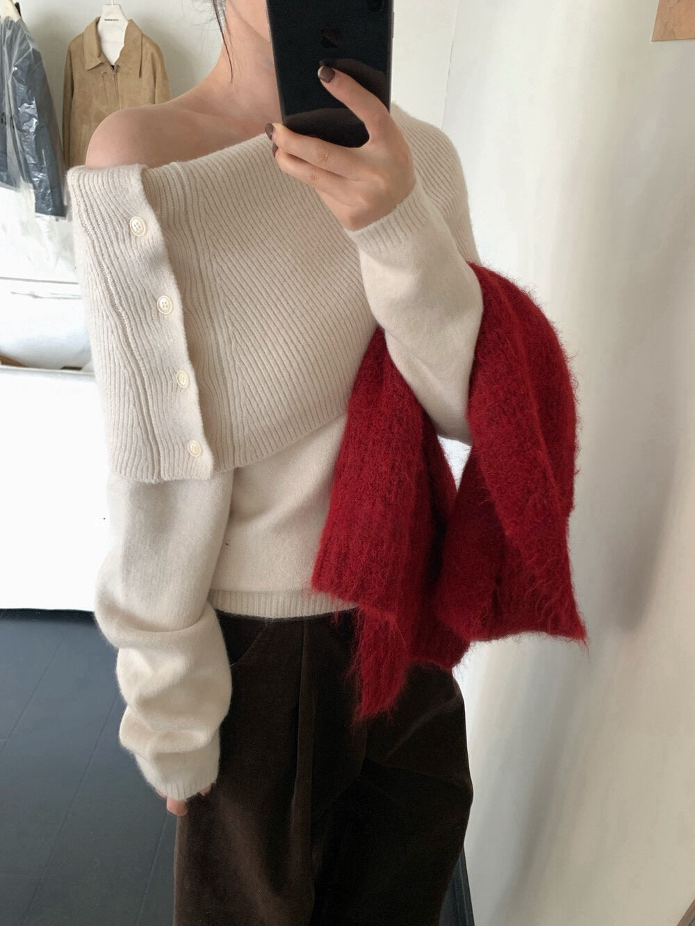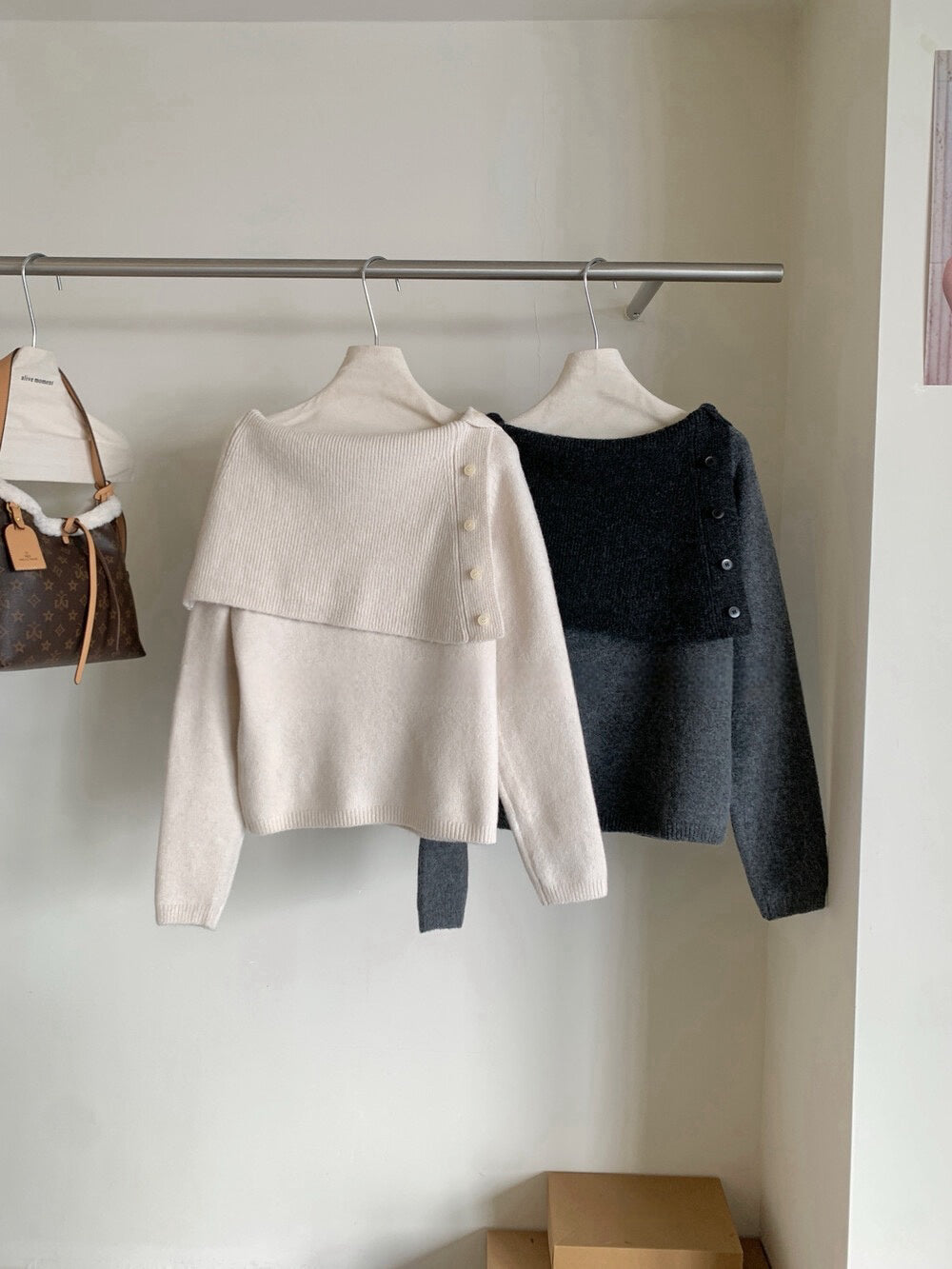// 設計感側鈕扣雙層領一字領NT
