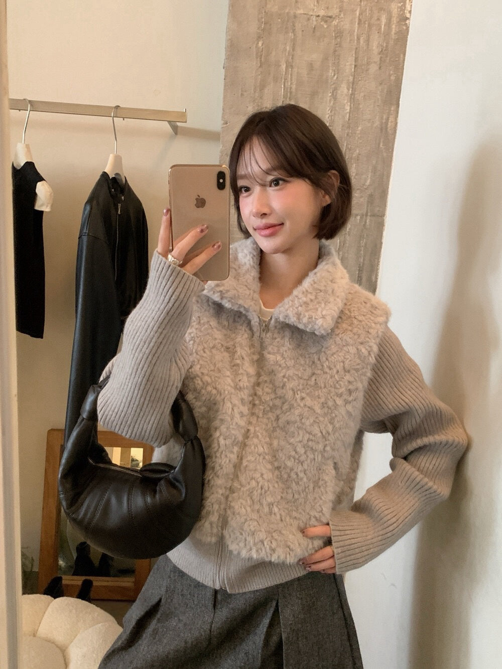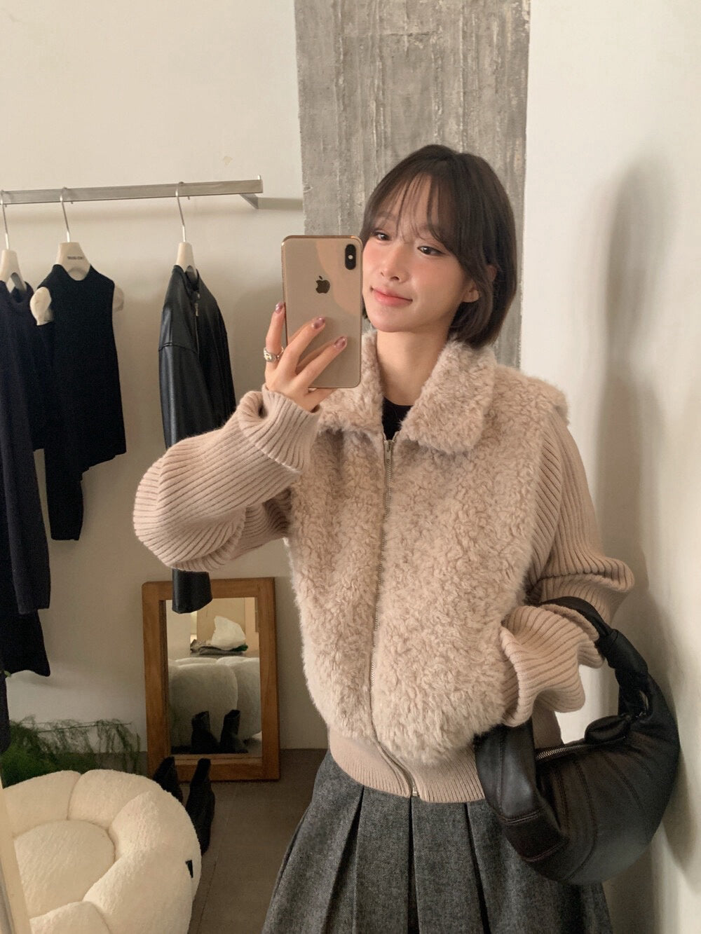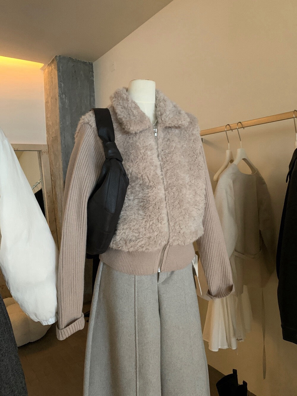 // 設計感毛毛翻領拼接織紋拉鍊外套