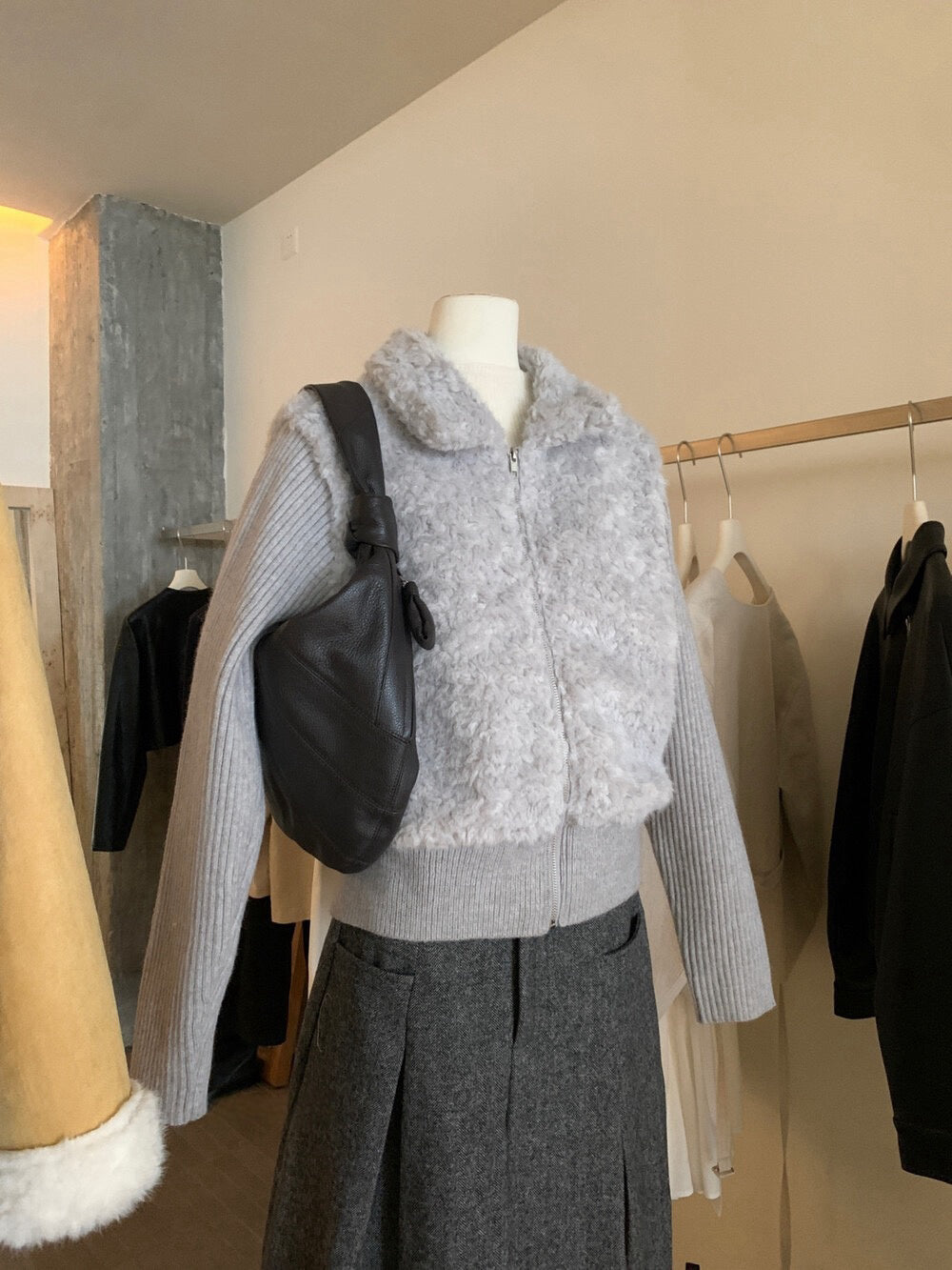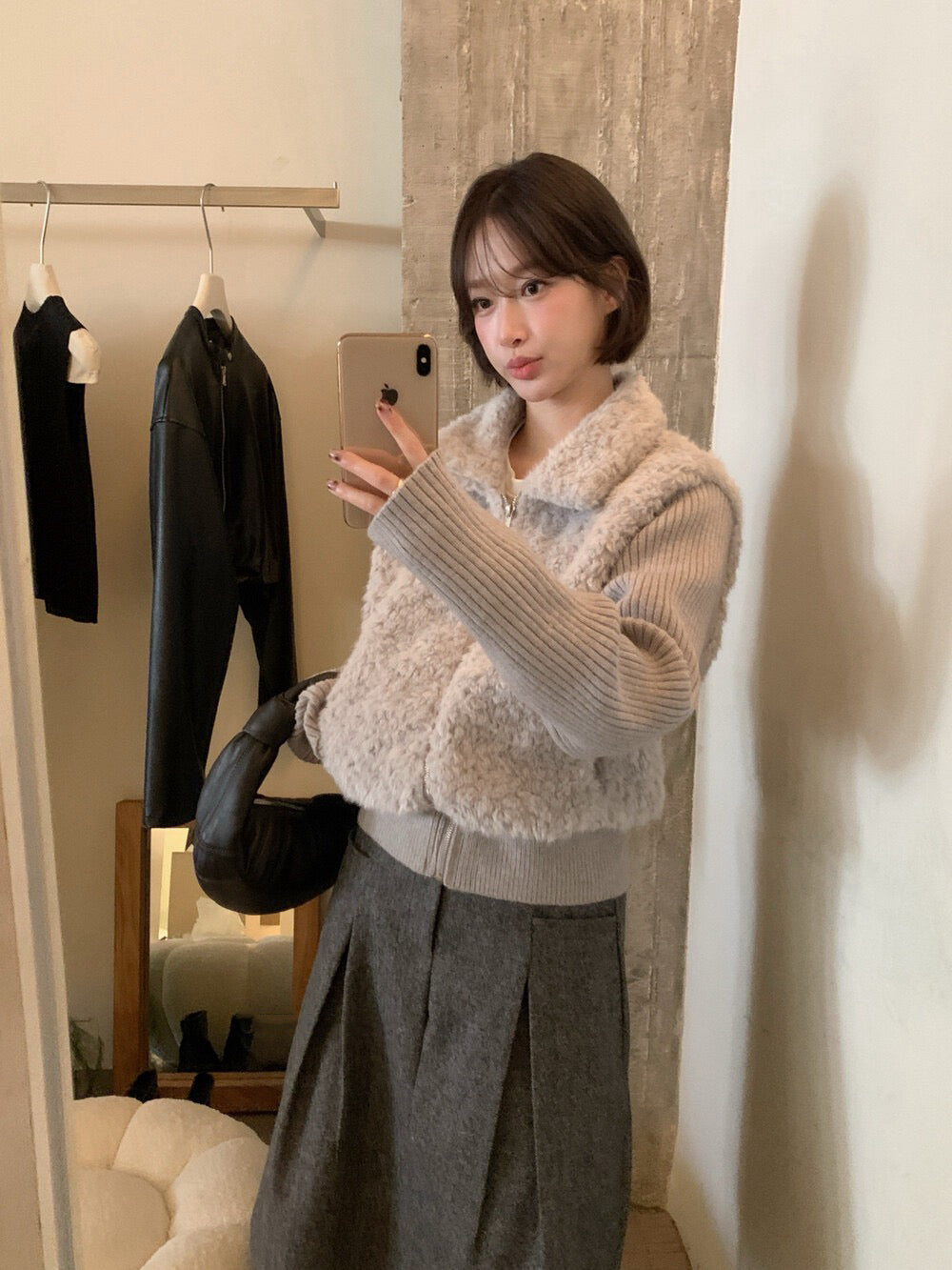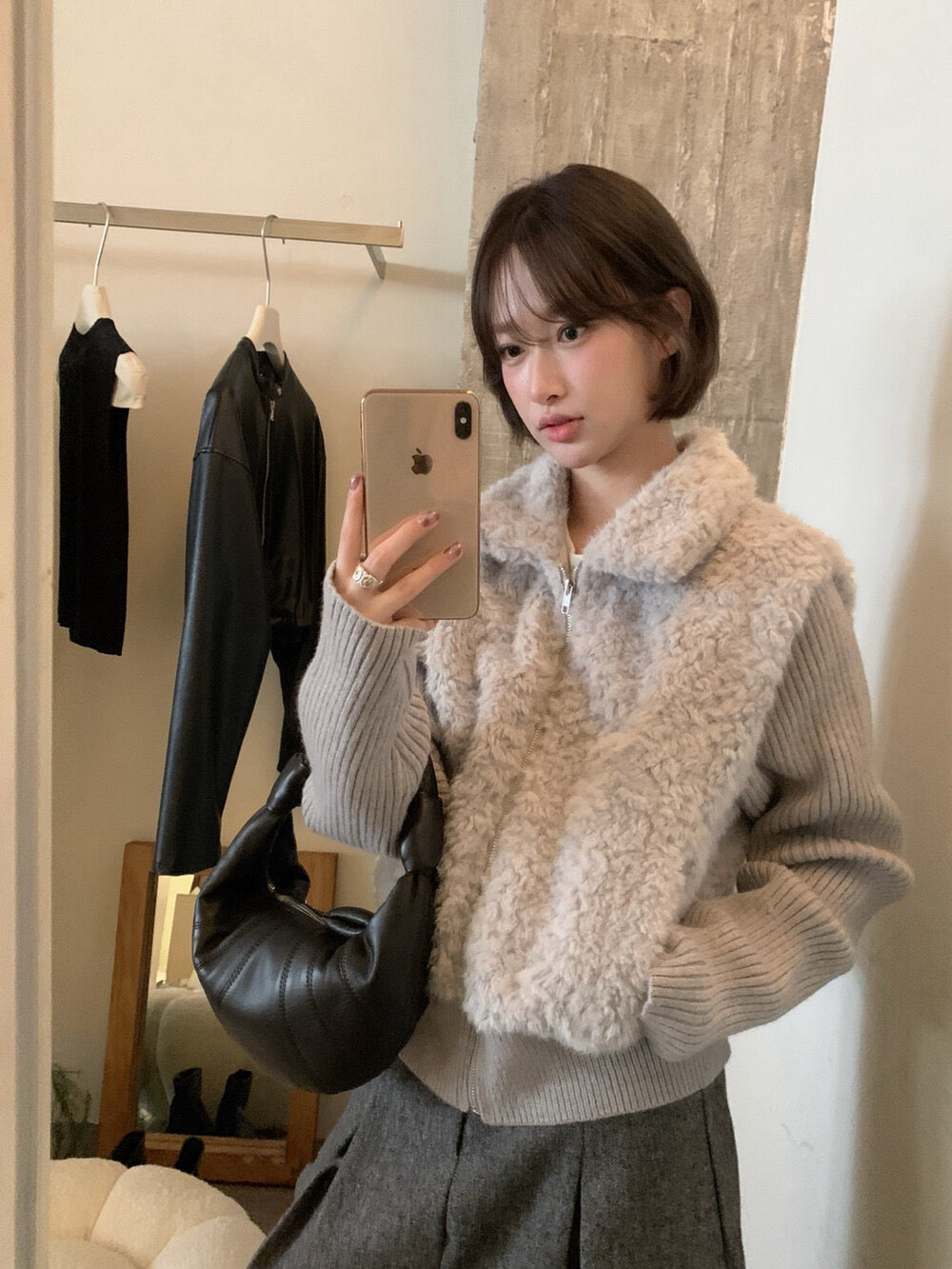 // 設計感毛毛翻領拼接織紋拉鍊外套