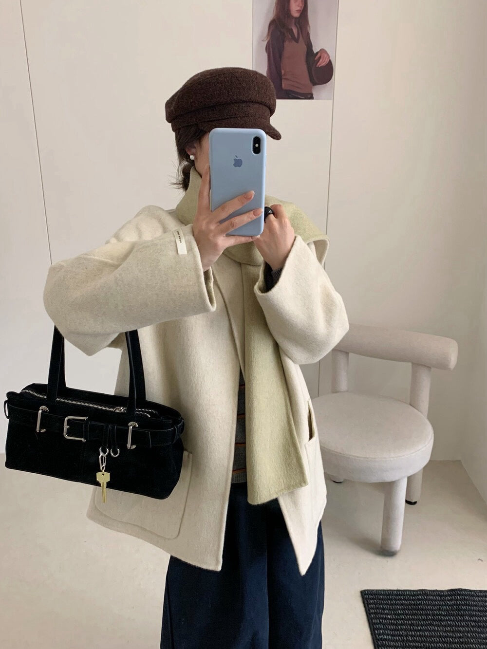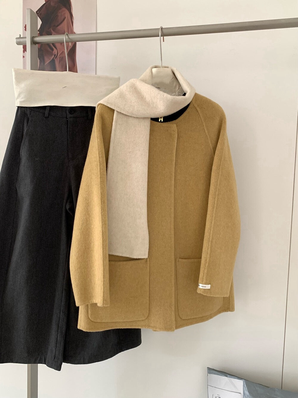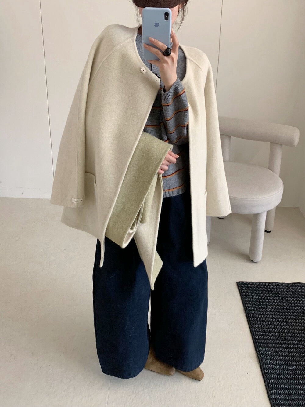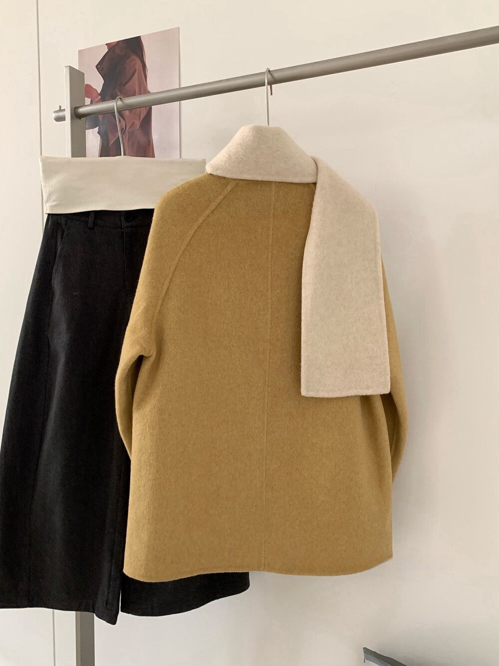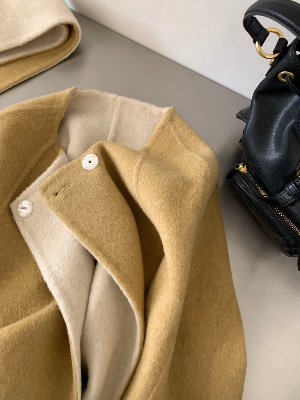 // 超氣質內撞色簡潔圓領100%手工雙面羊毛外套(連頸巾)