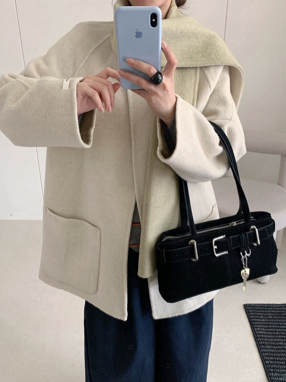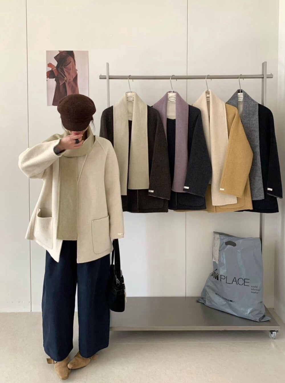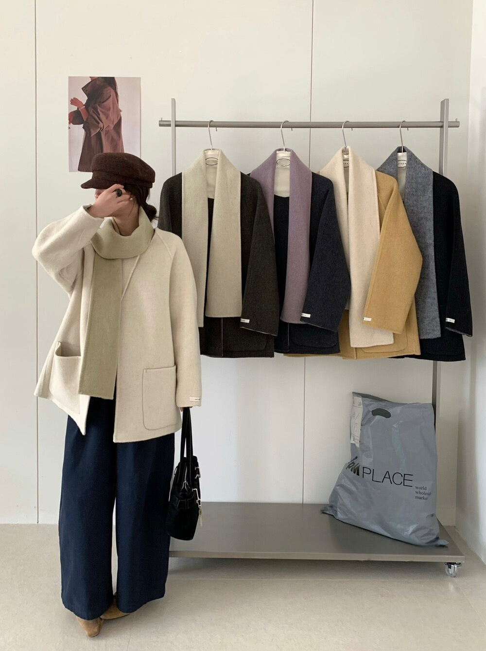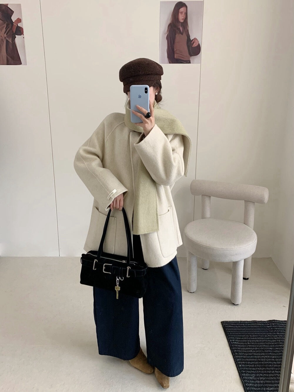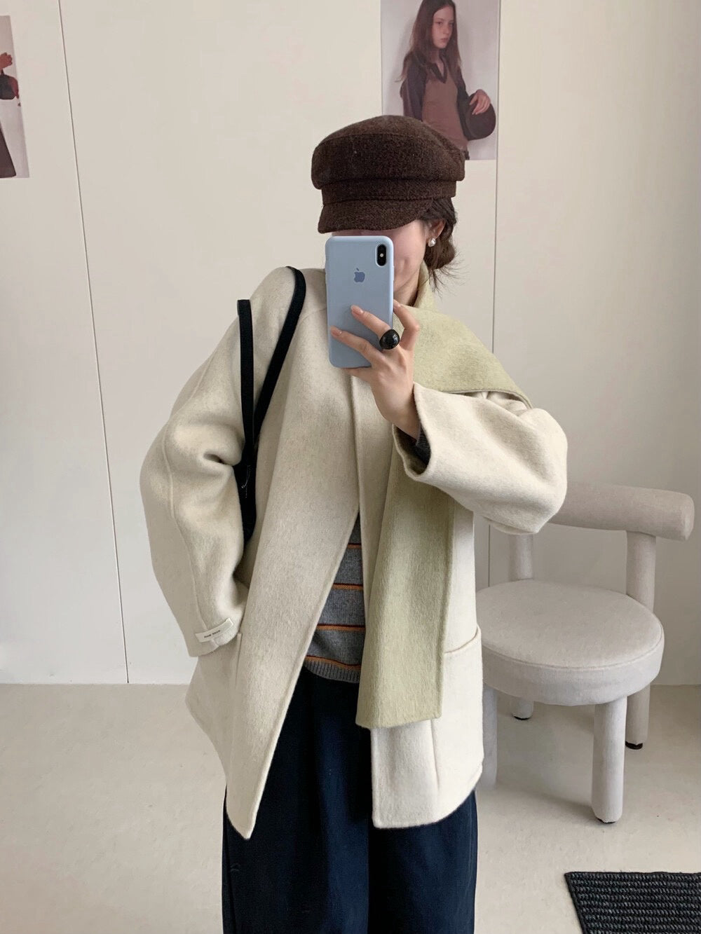 // 超氣質內撞色簡潔圓領100%手工雙面羊毛外套(連頸巾)
