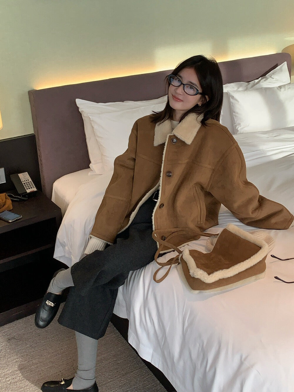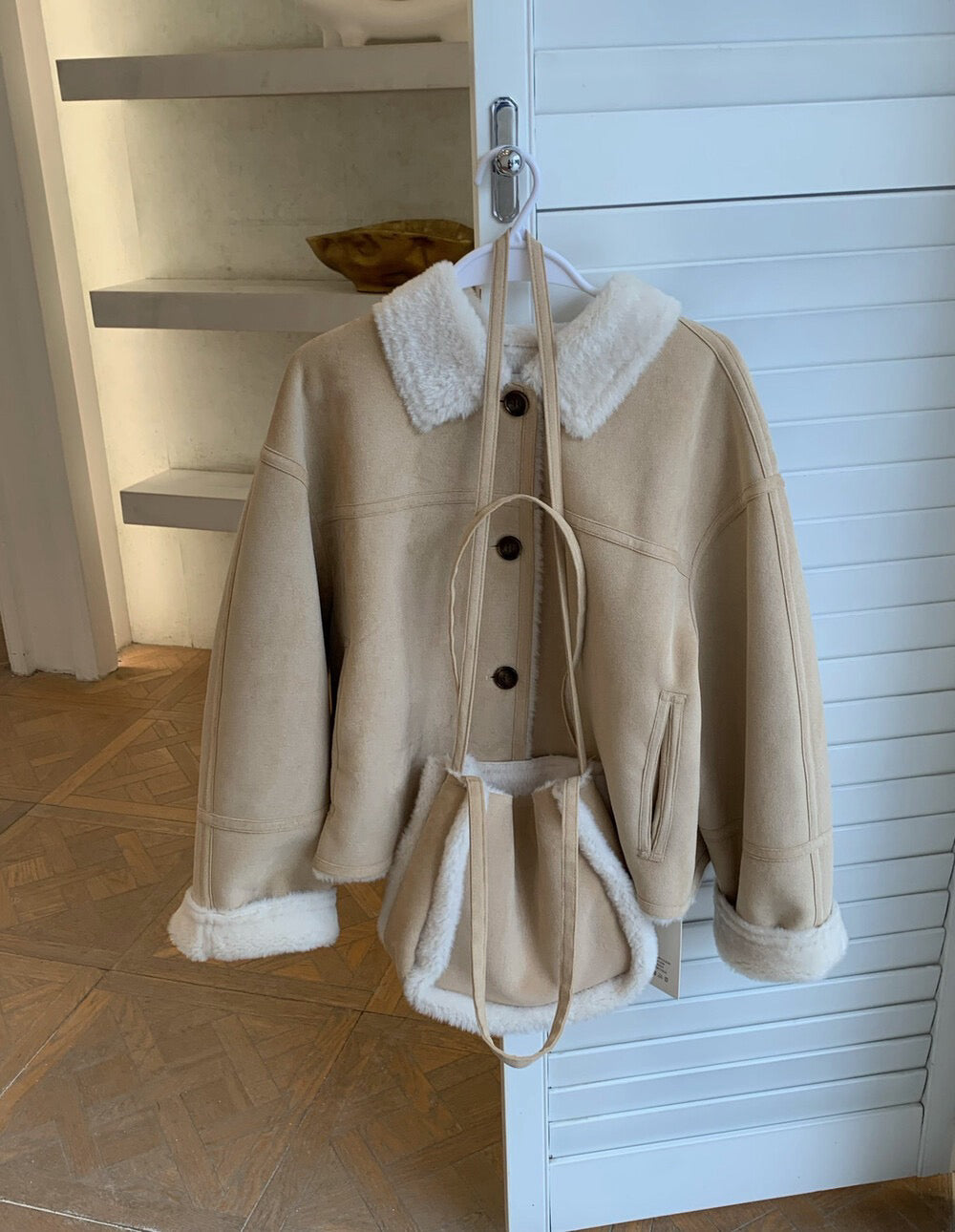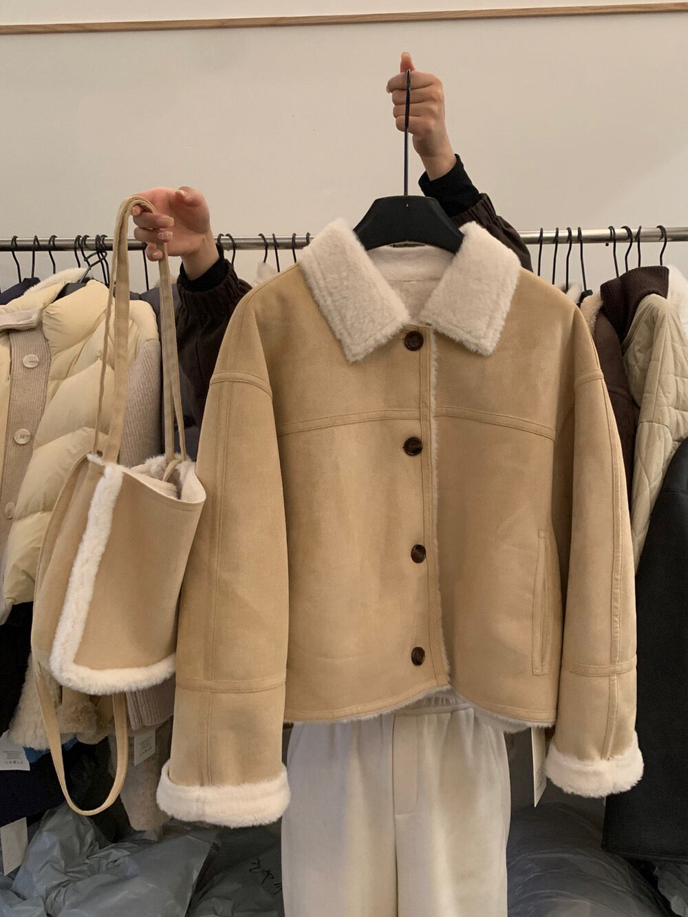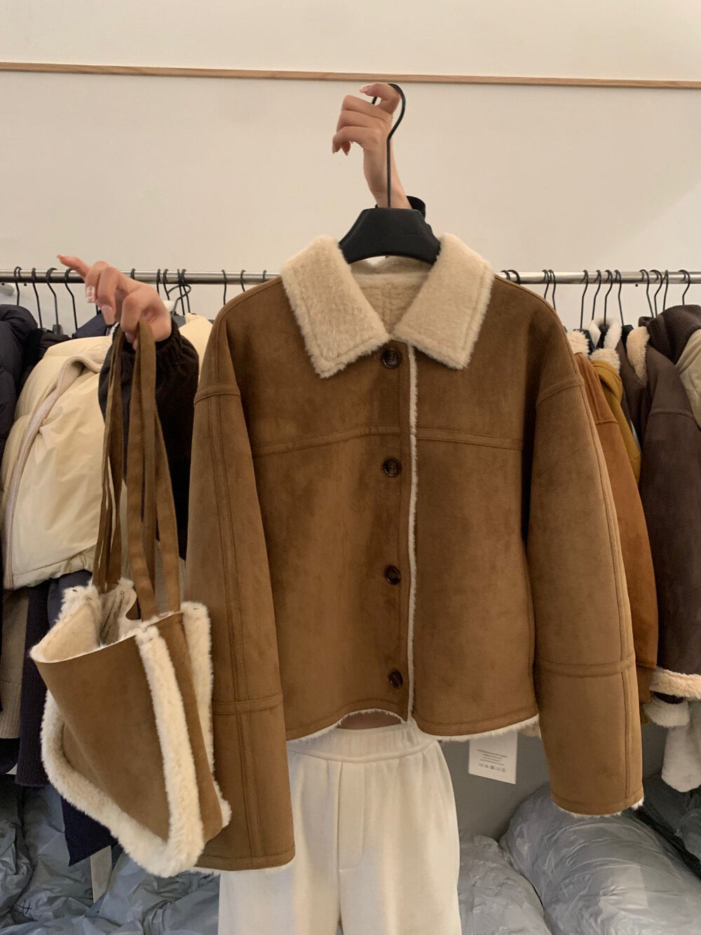// 超軟皮毛一體麂皮翻領外套(連袋仔)
