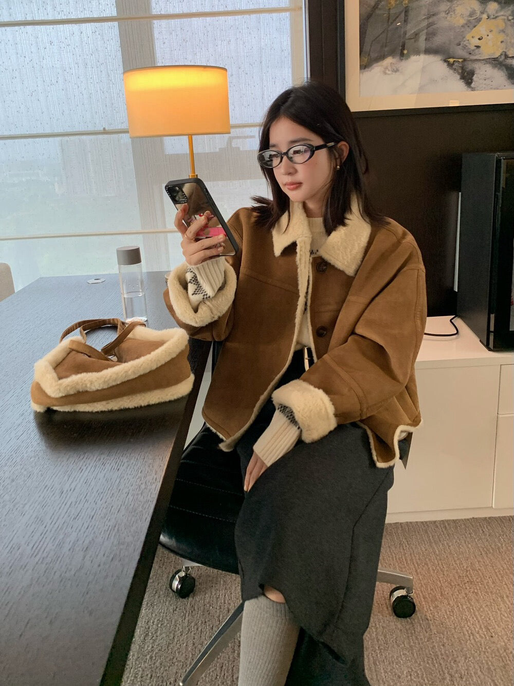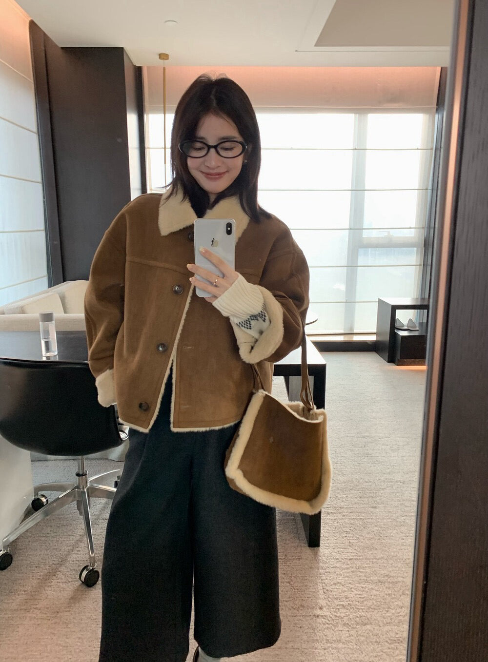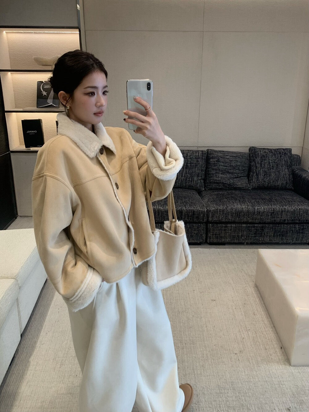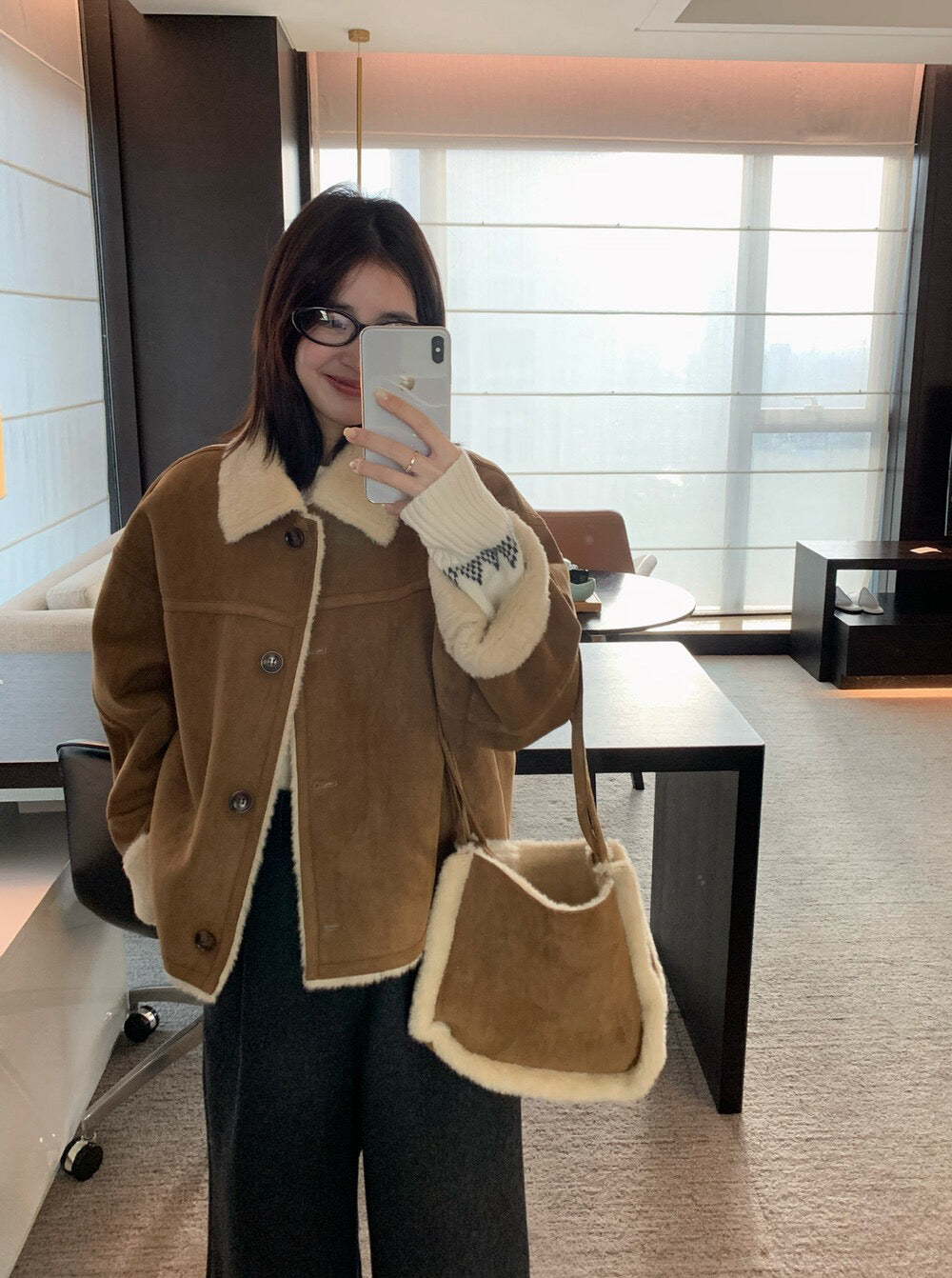 // 超軟皮毛一體麂皮翻領外套(連袋仔)