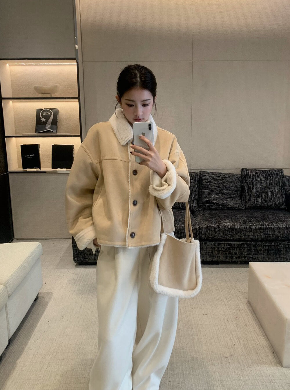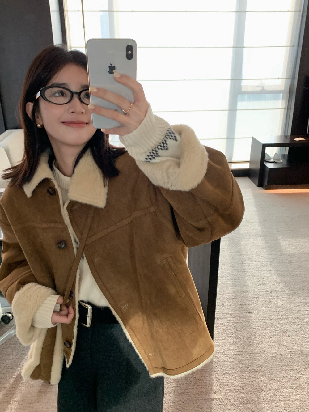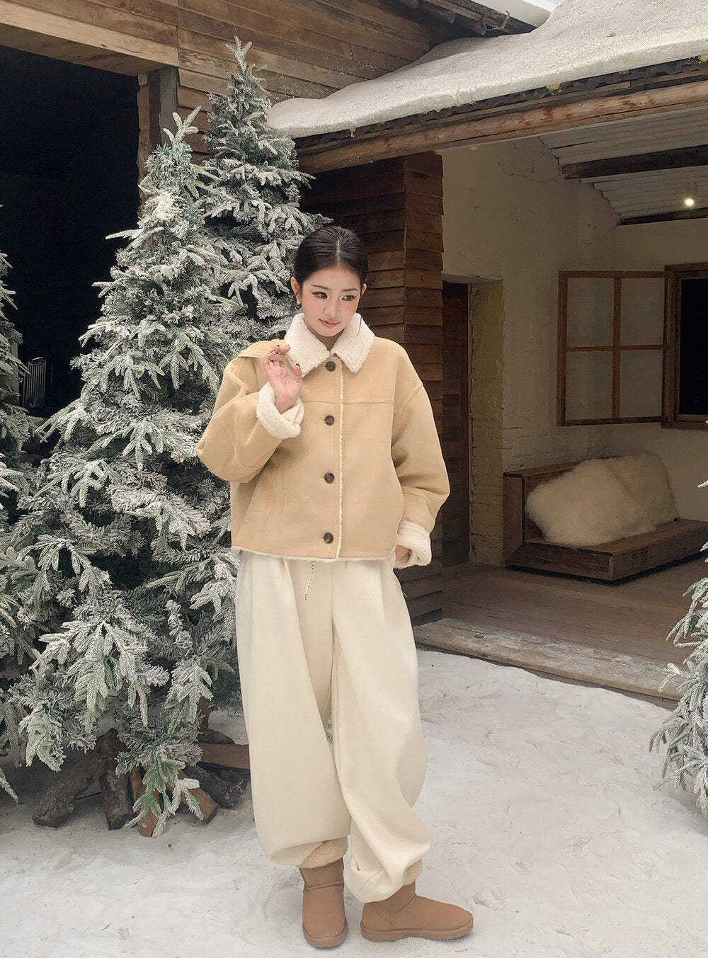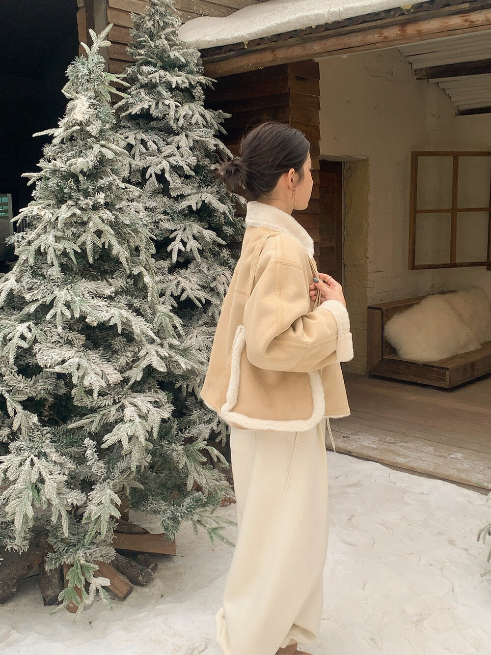 // 超軟皮毛一體麂皮翻領外套(連袋仔)