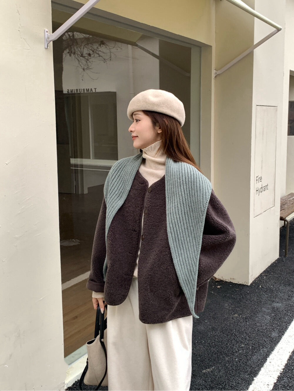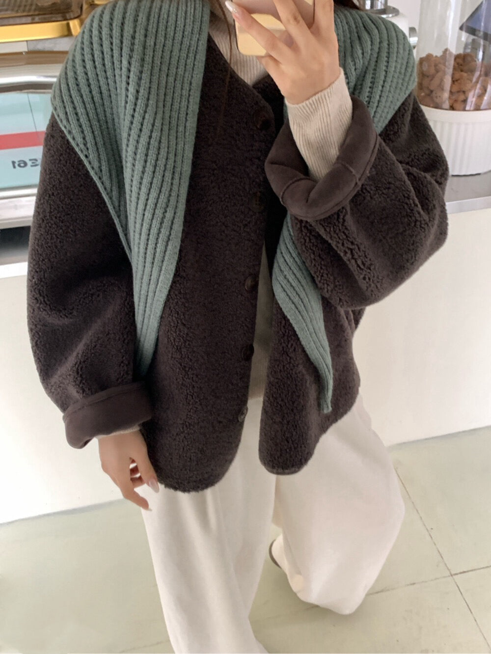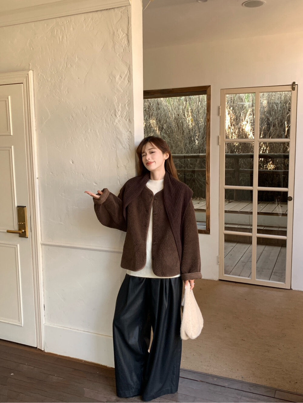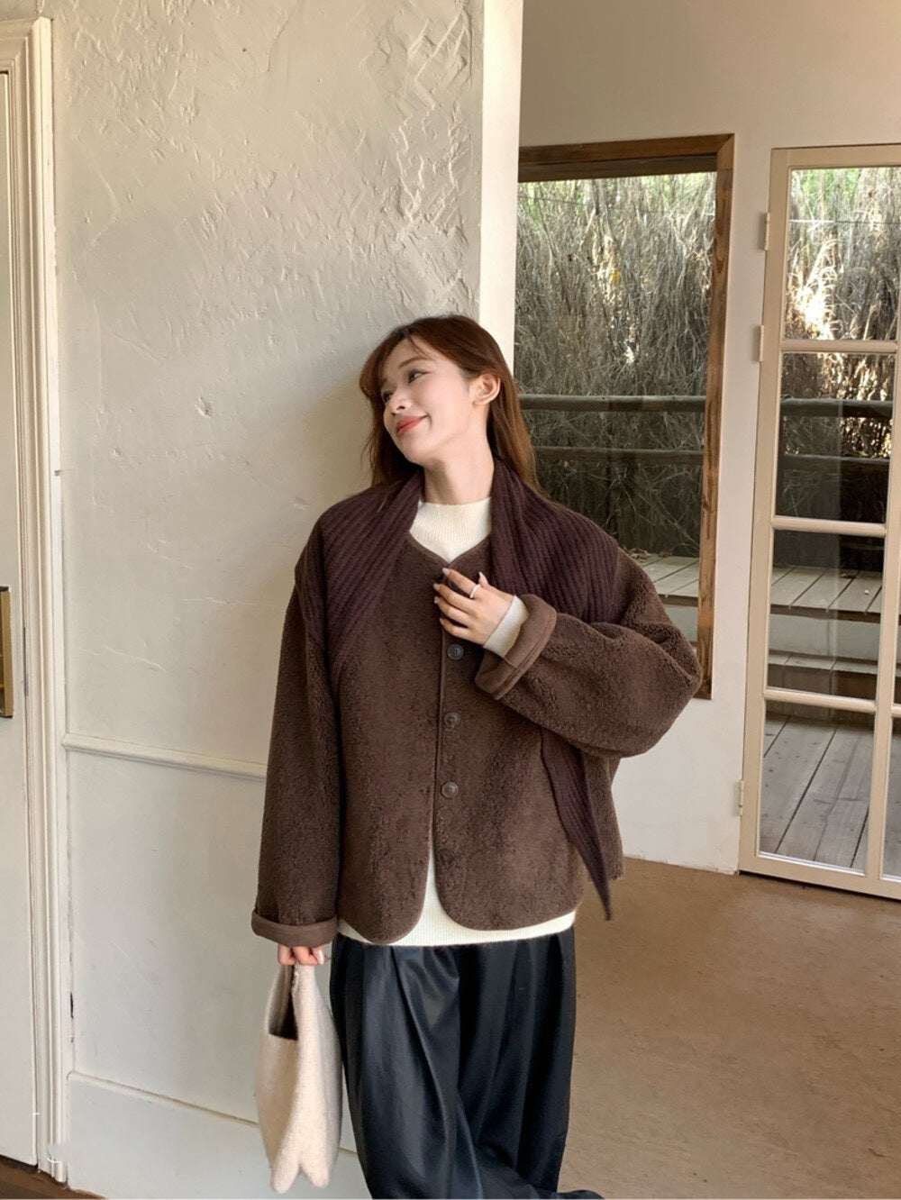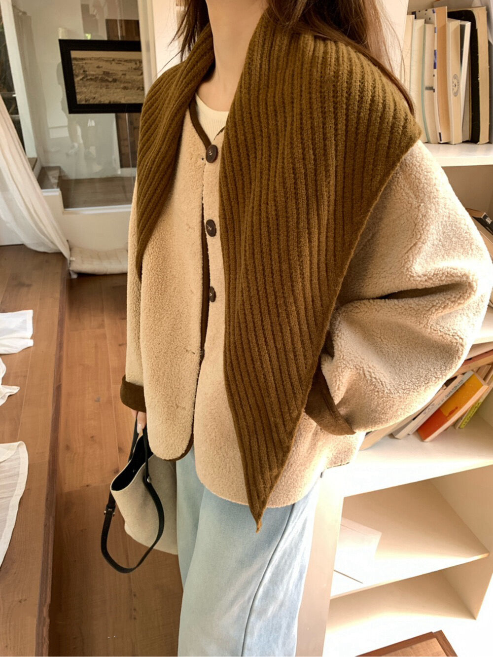 // 連披肩弧邊羊羔毛外套