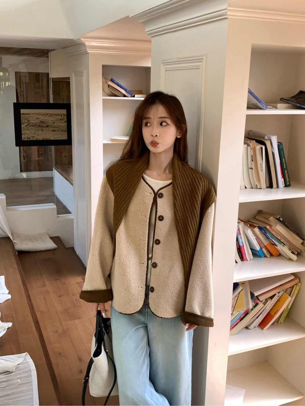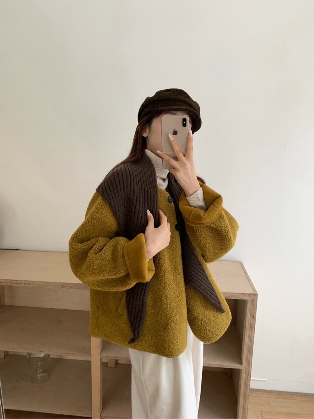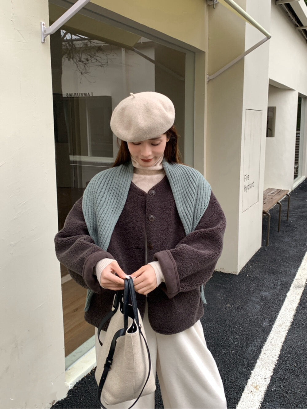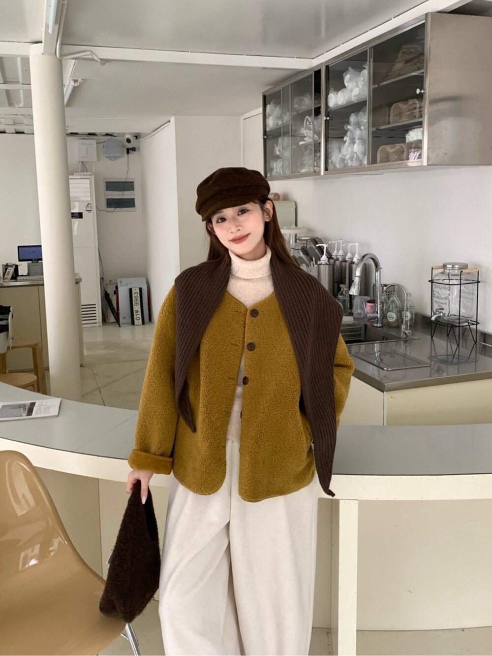 // 連披肩弧邊羊羔毛外套