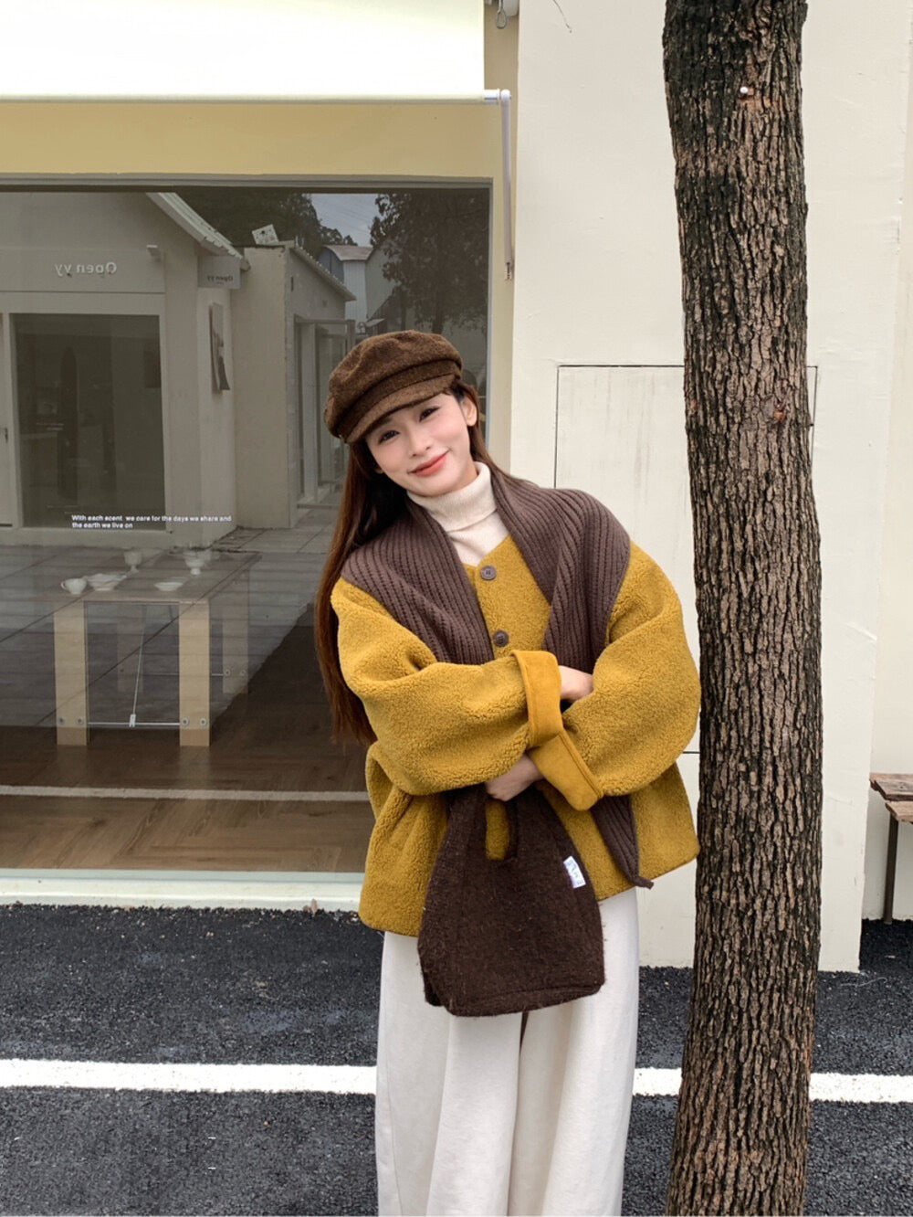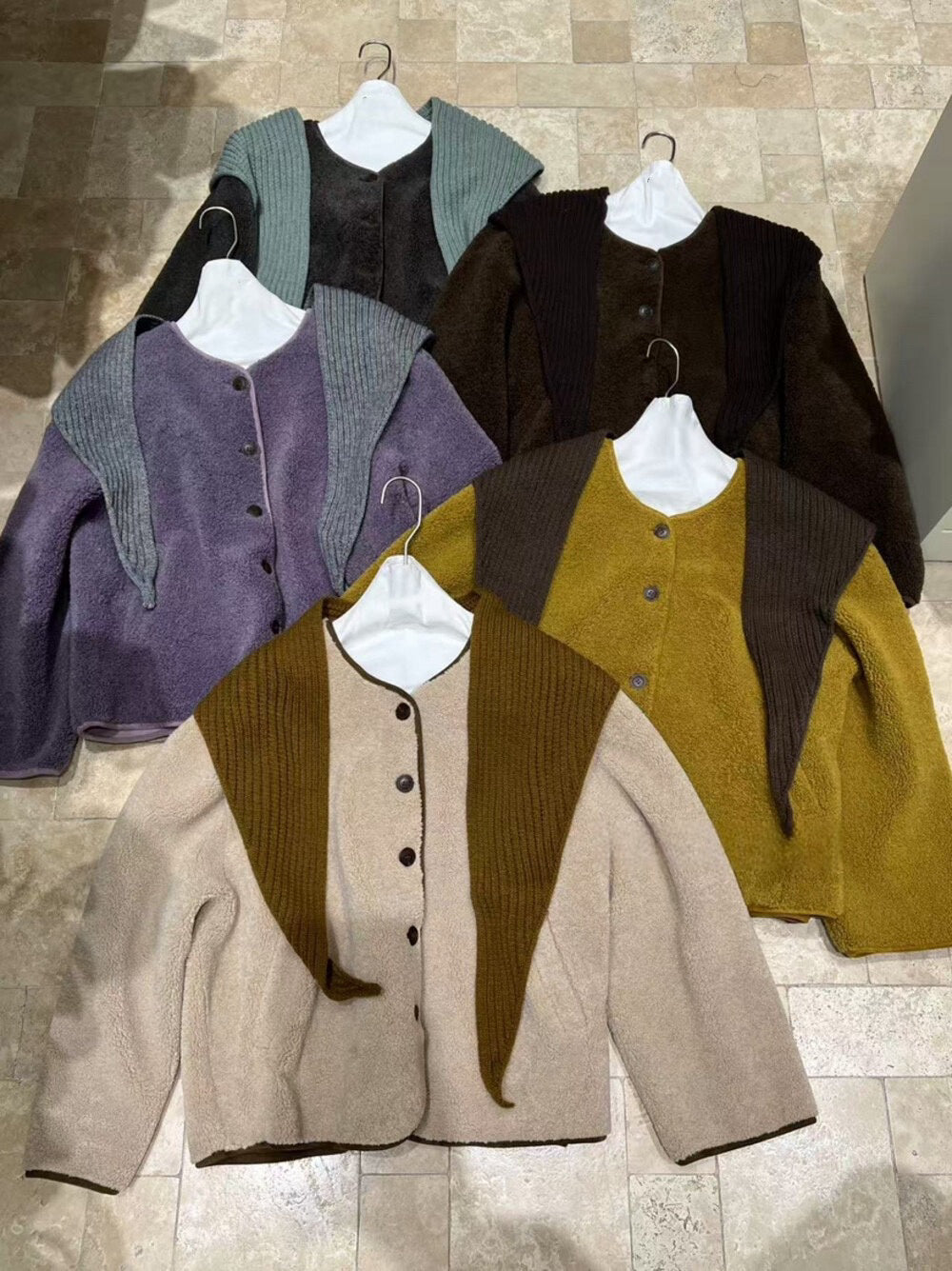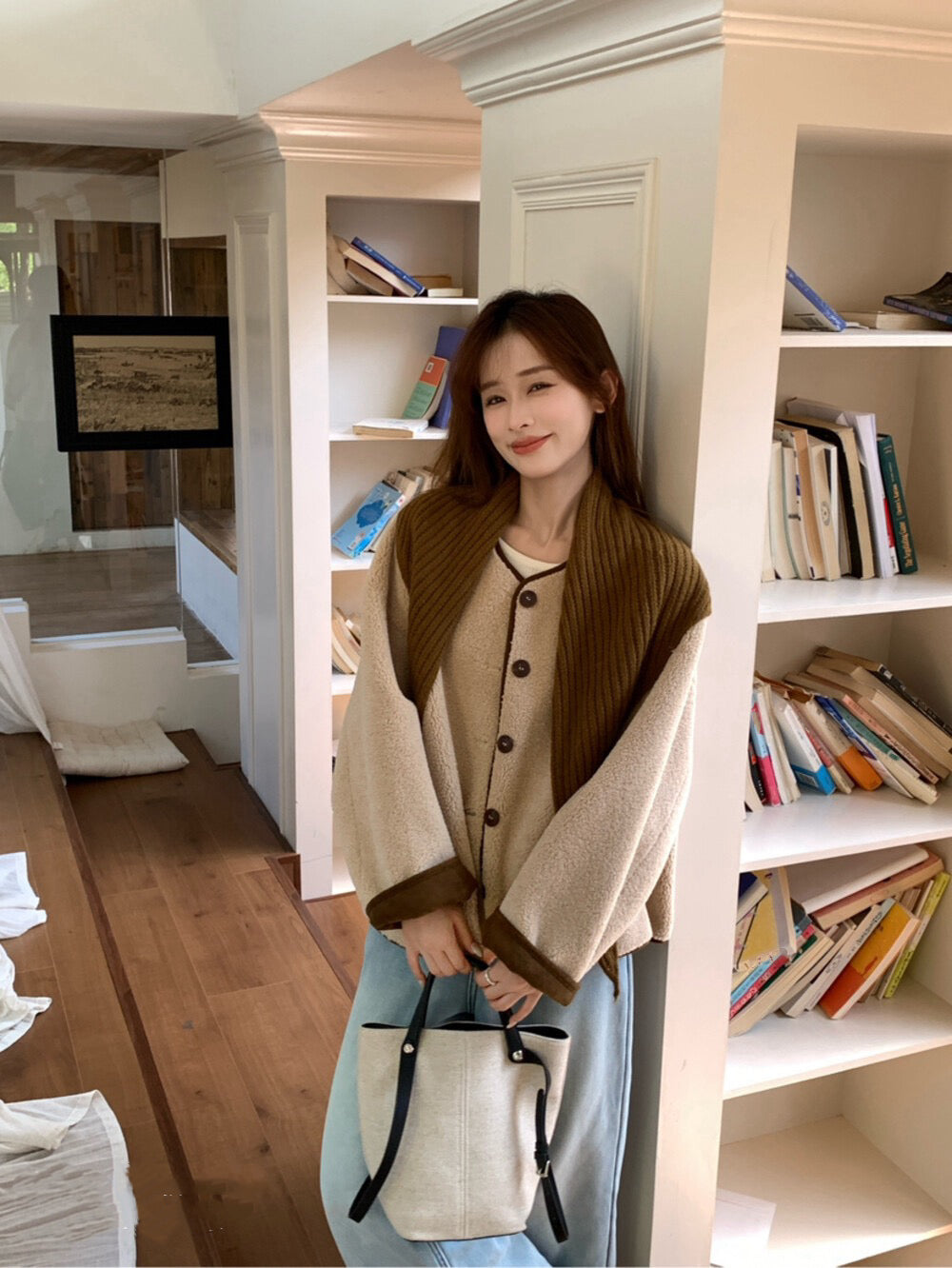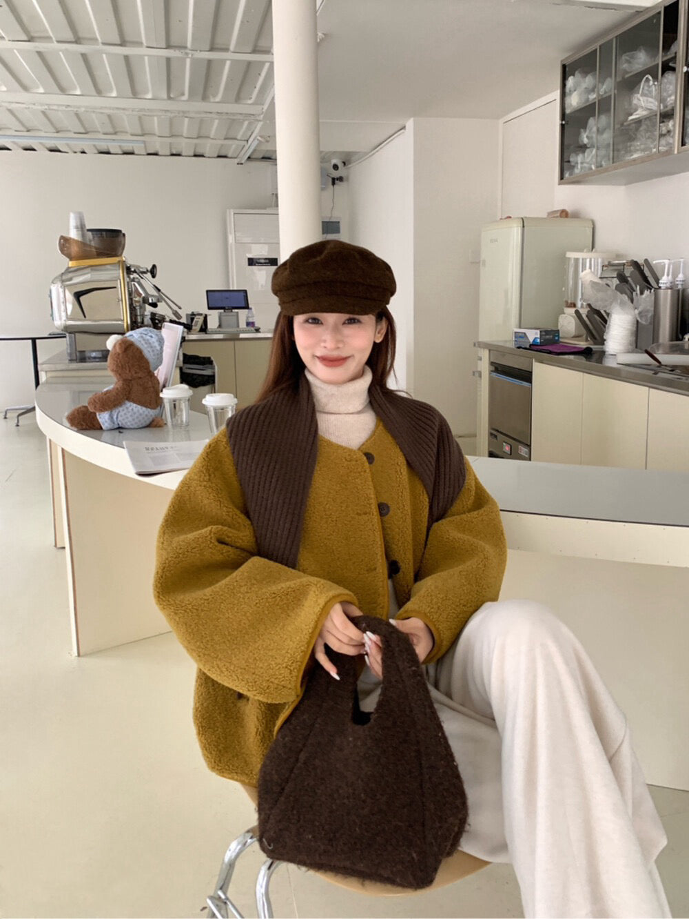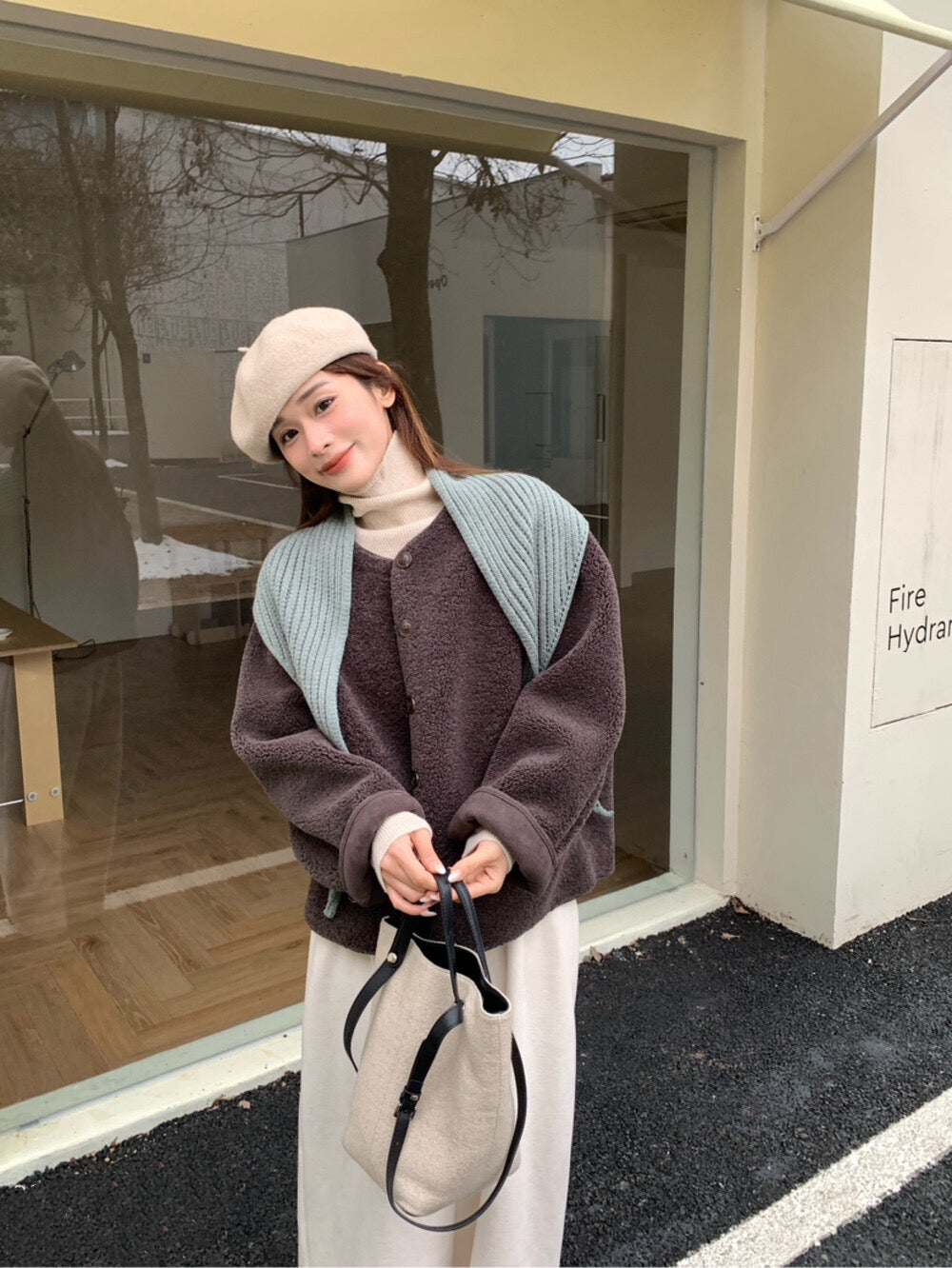 // 連披肩弧邊羊羔毛外套