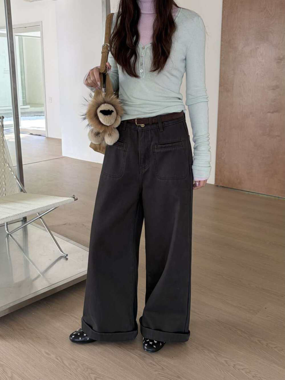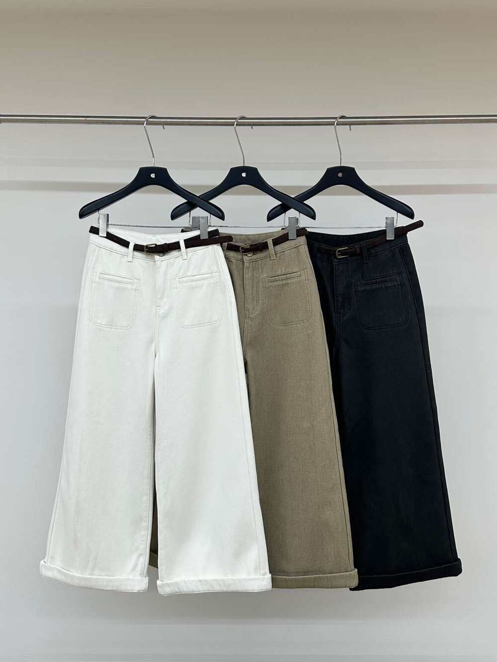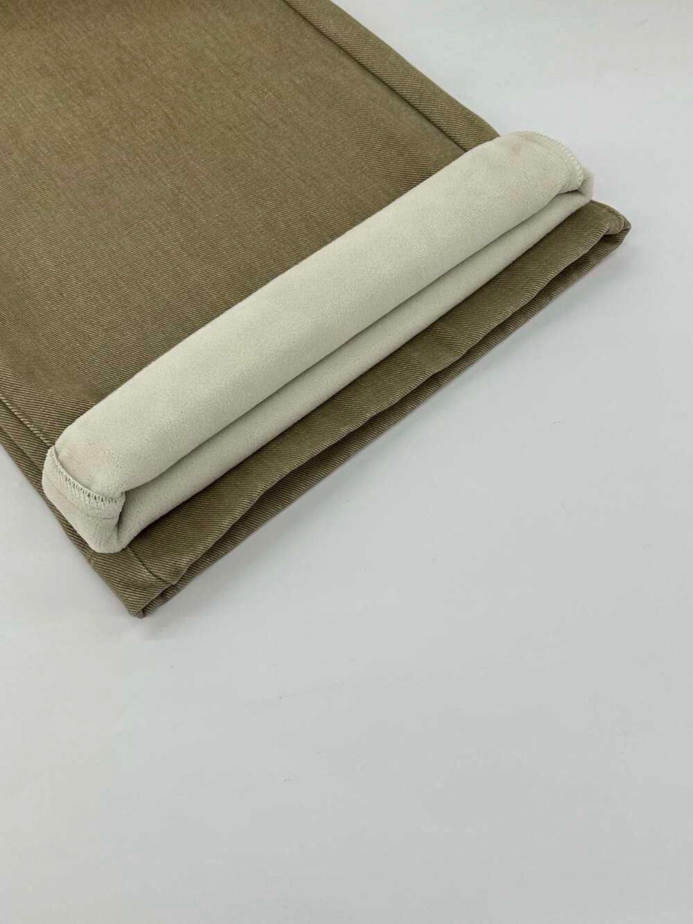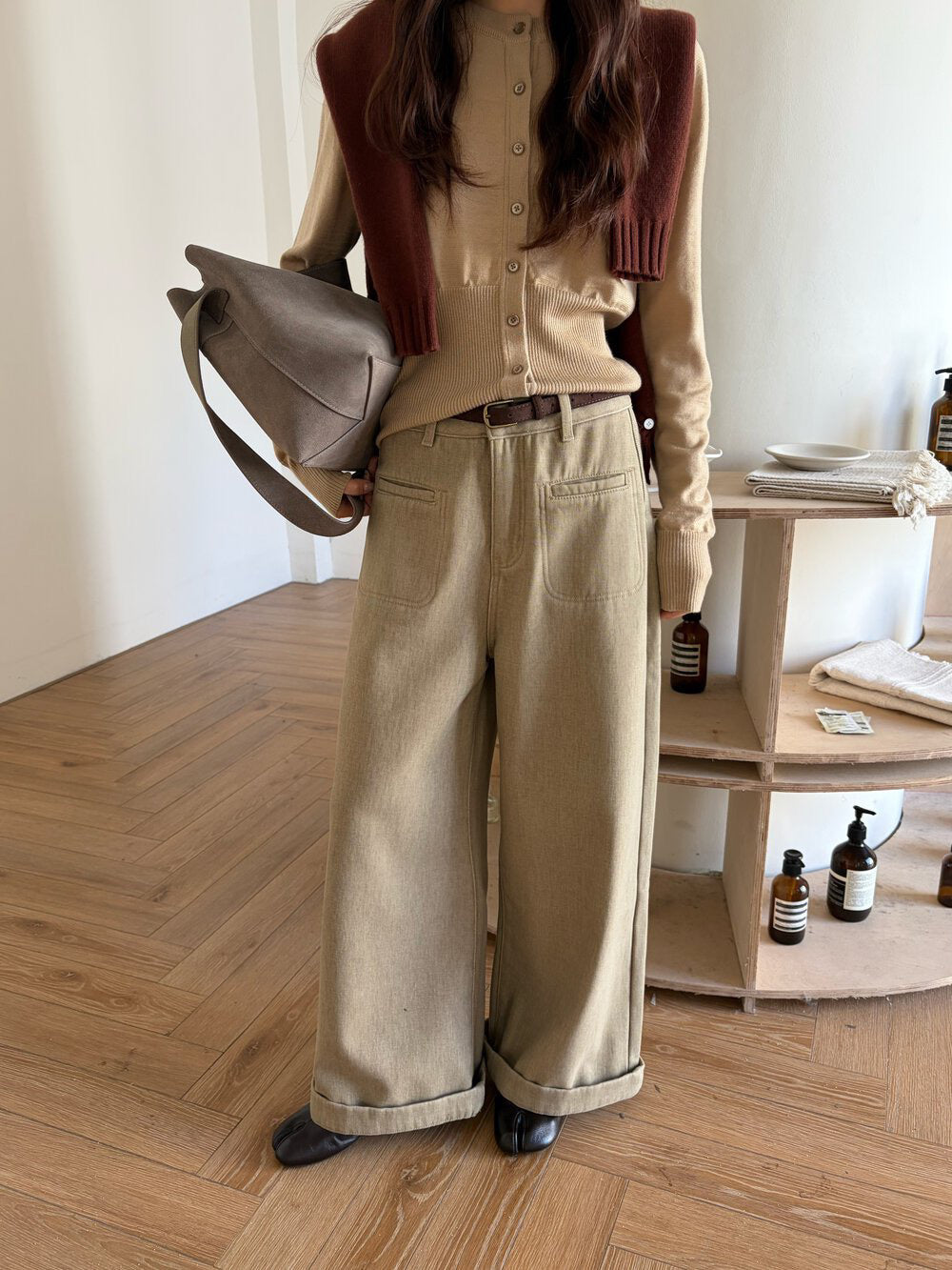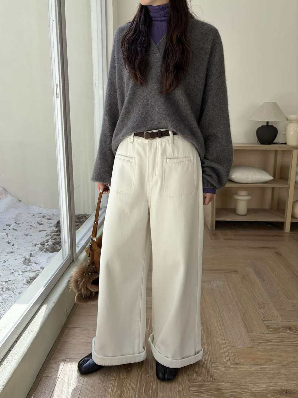 // 雙口袋裝飾加絨卷邊褲(連腰帶)