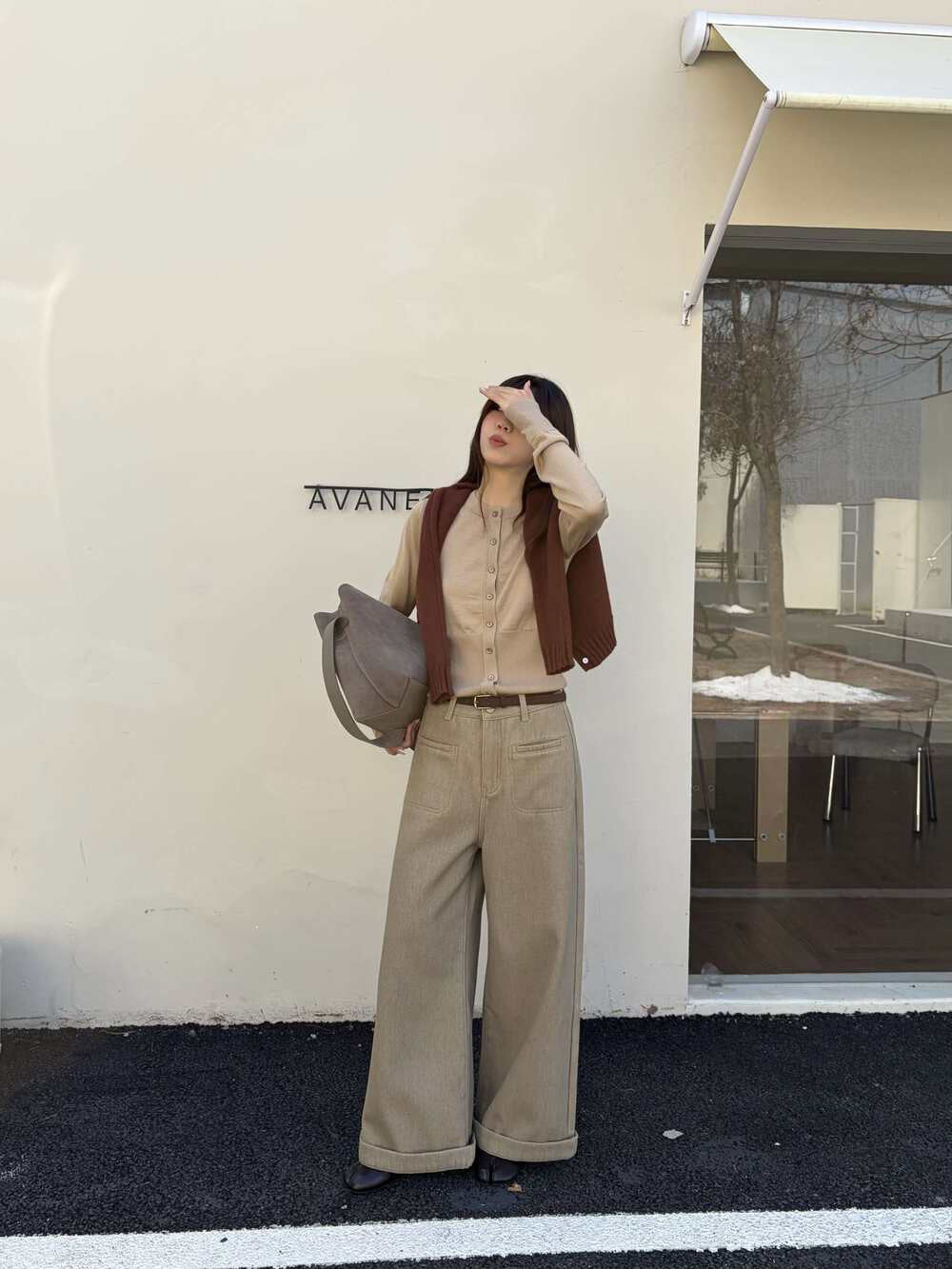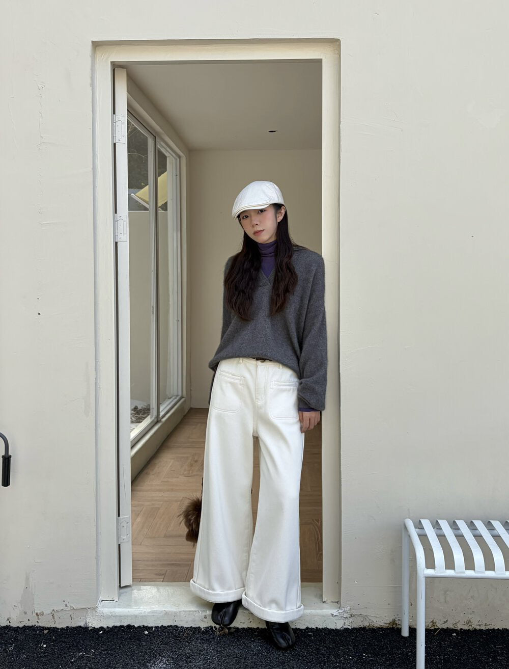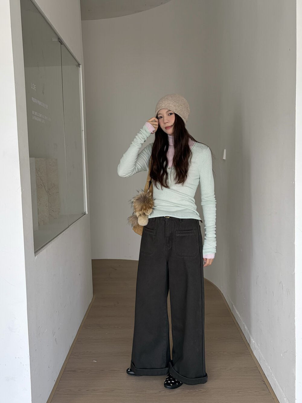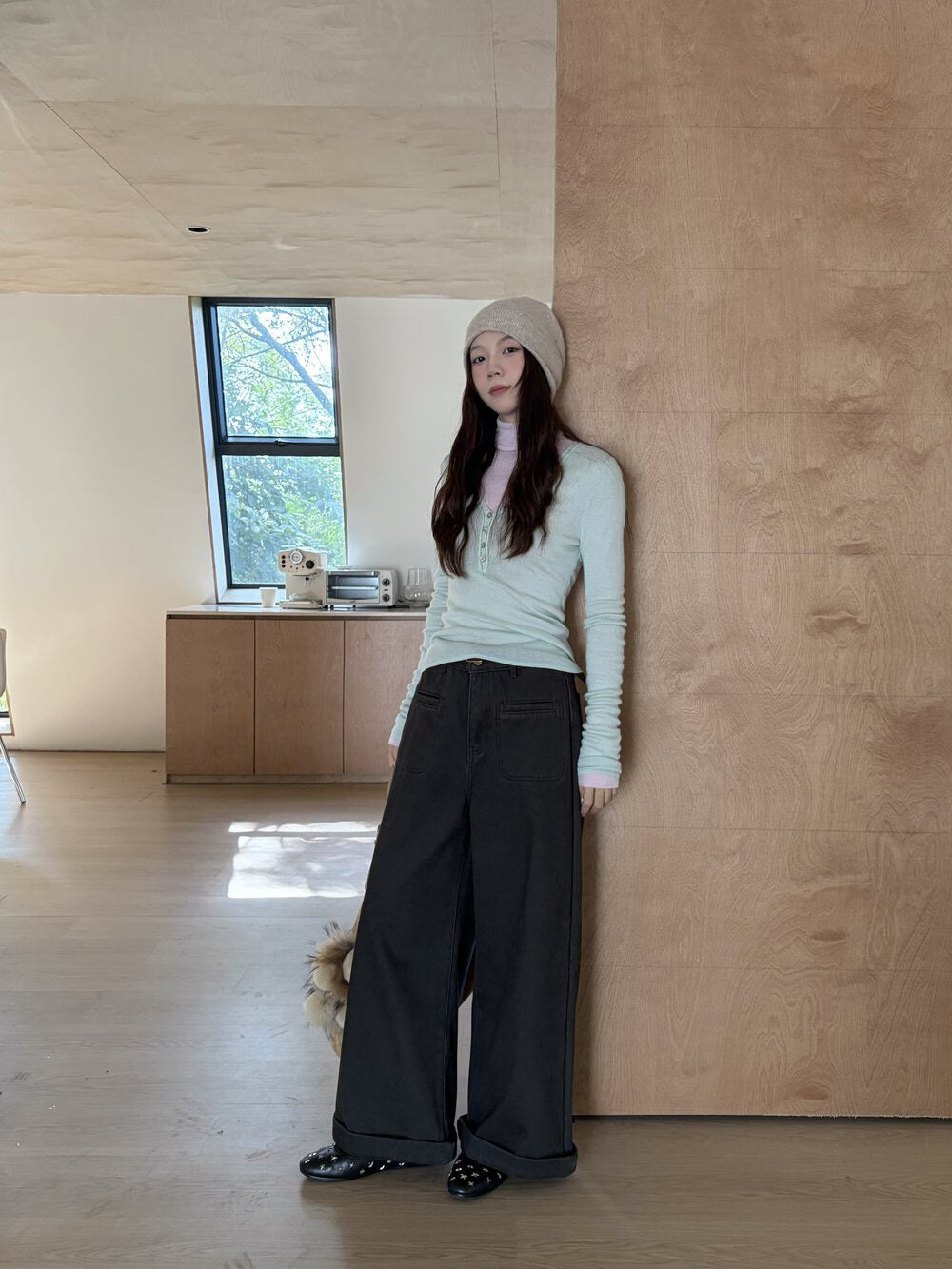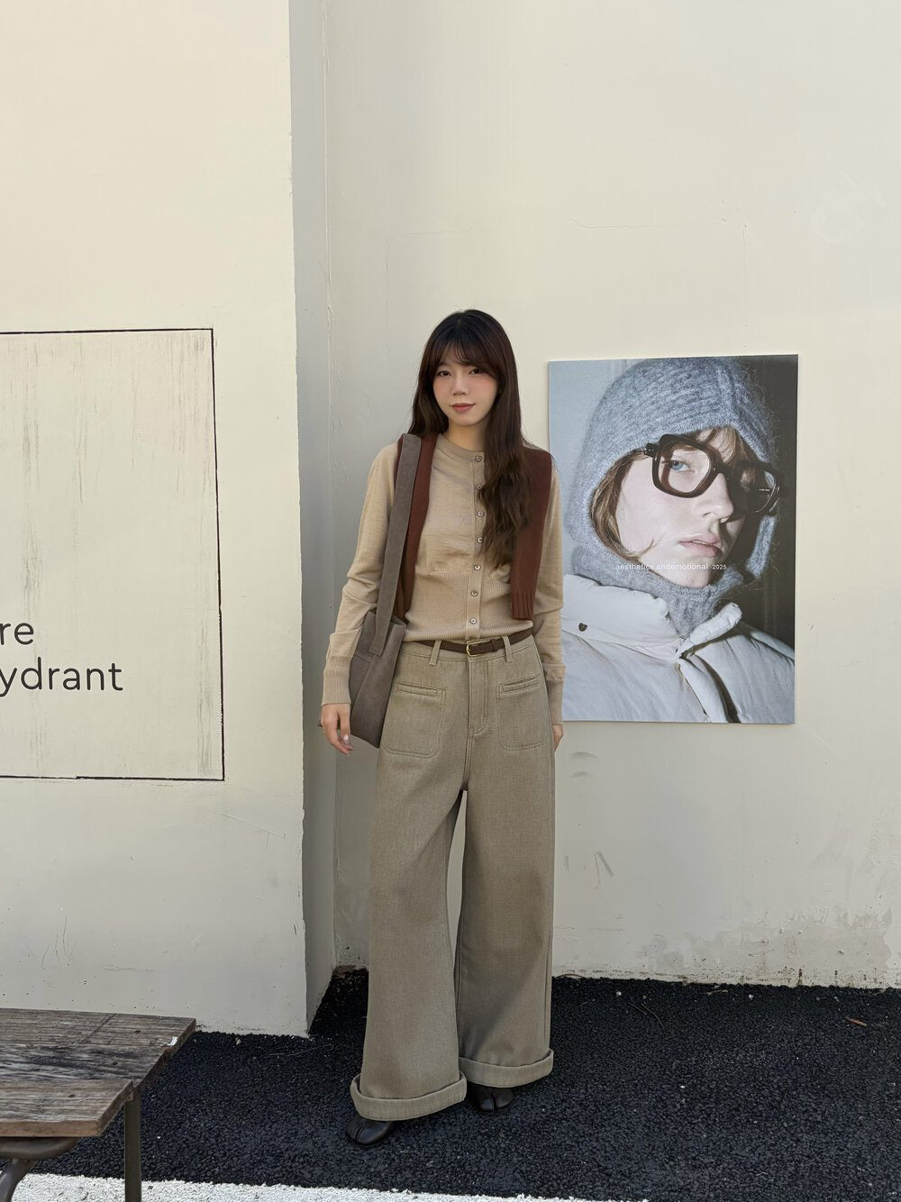 // 雙口袋裝飾加絨卷邊褲(連腰帶)