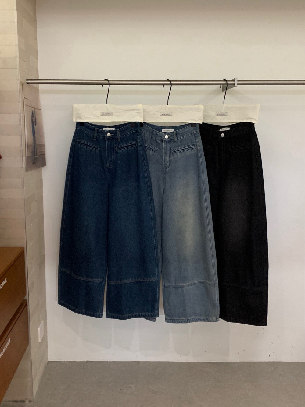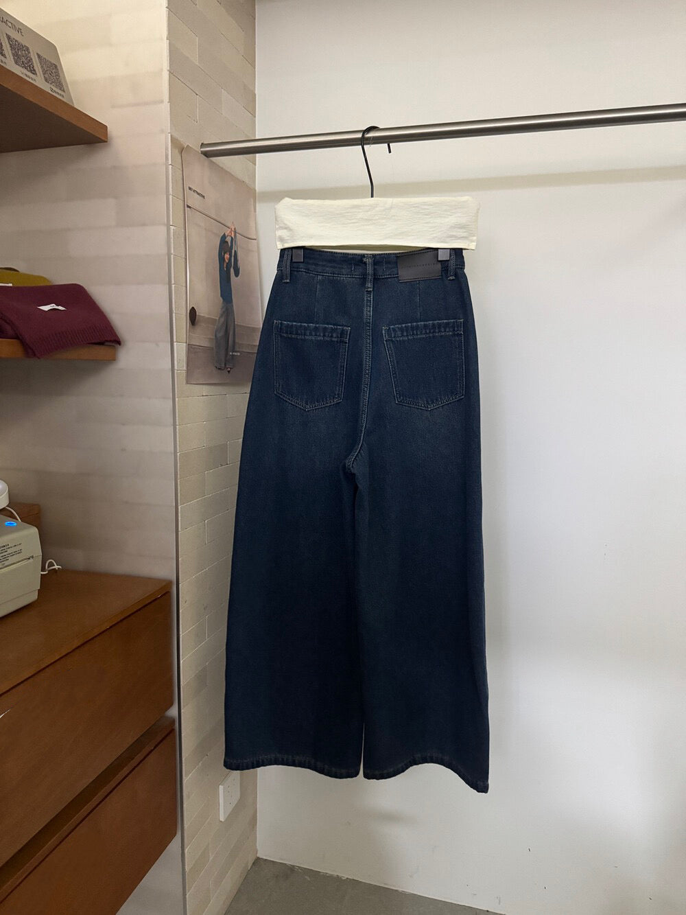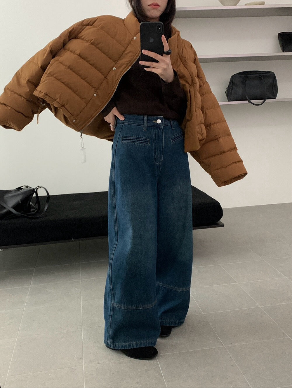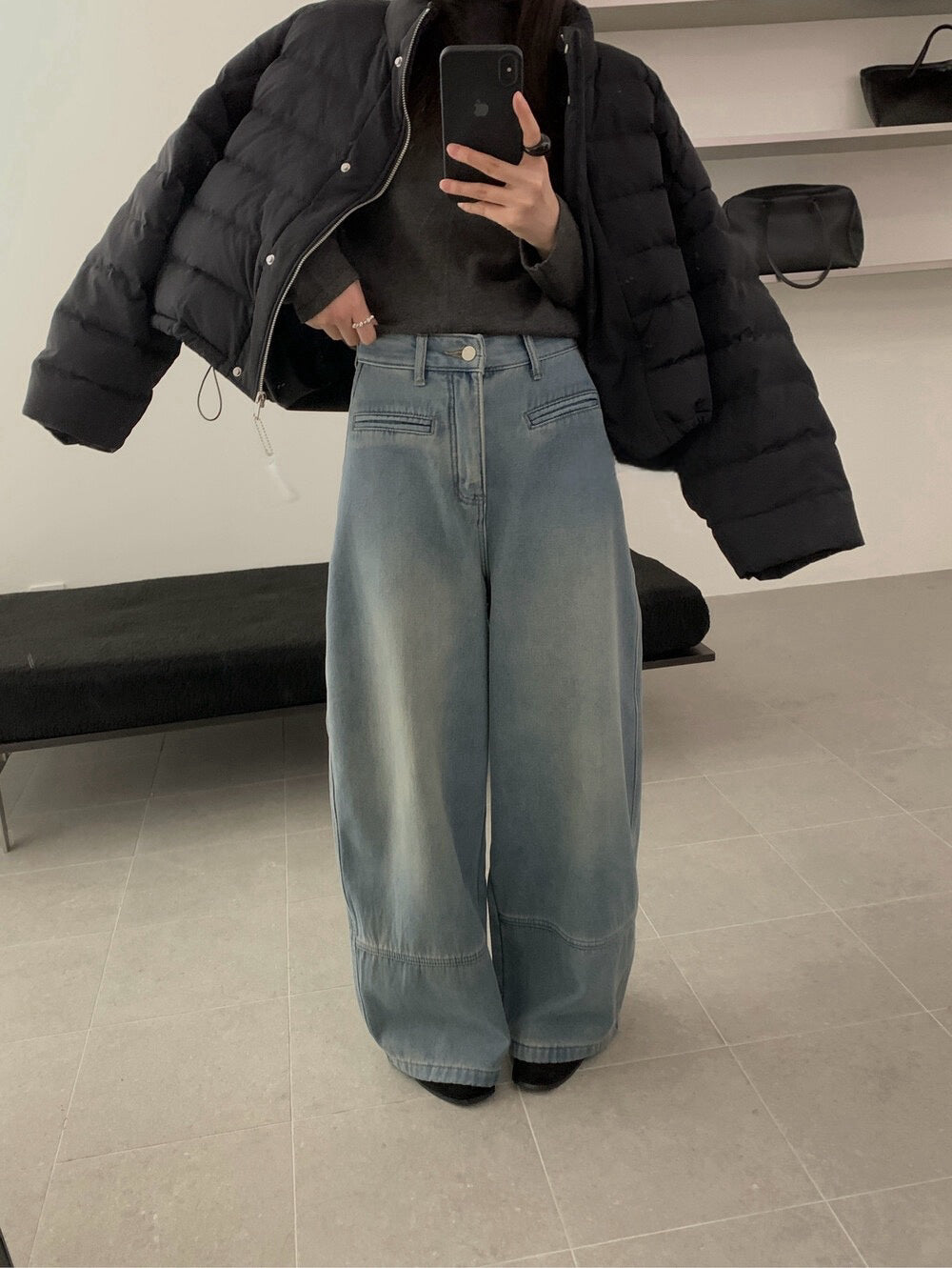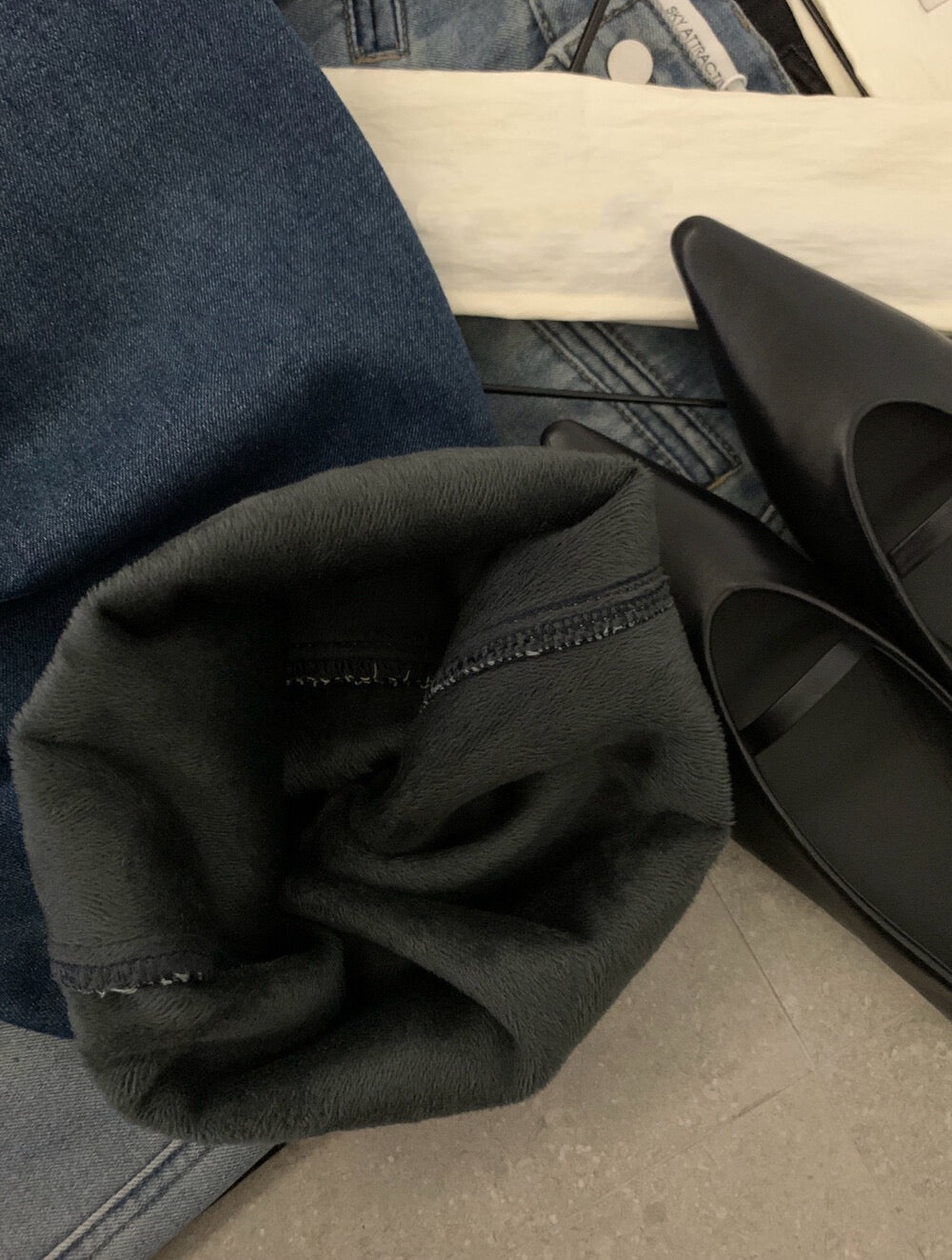 // 雙口袋裝飾拼接褲腳加絨全長牛仔褲