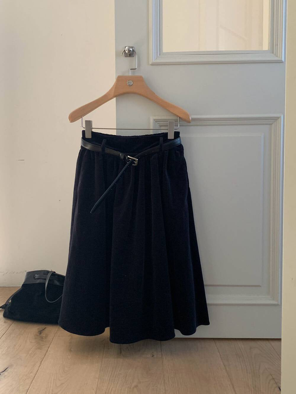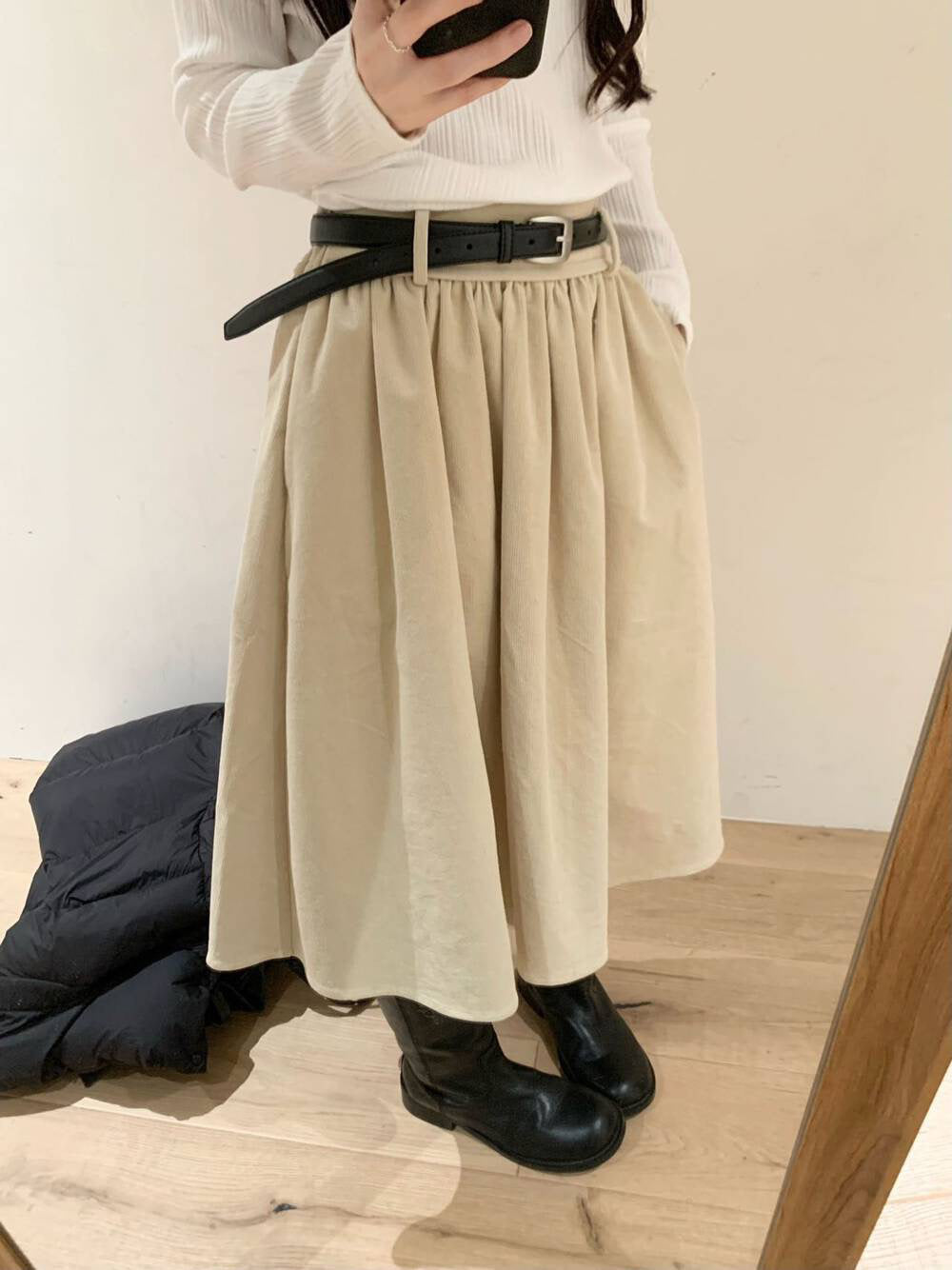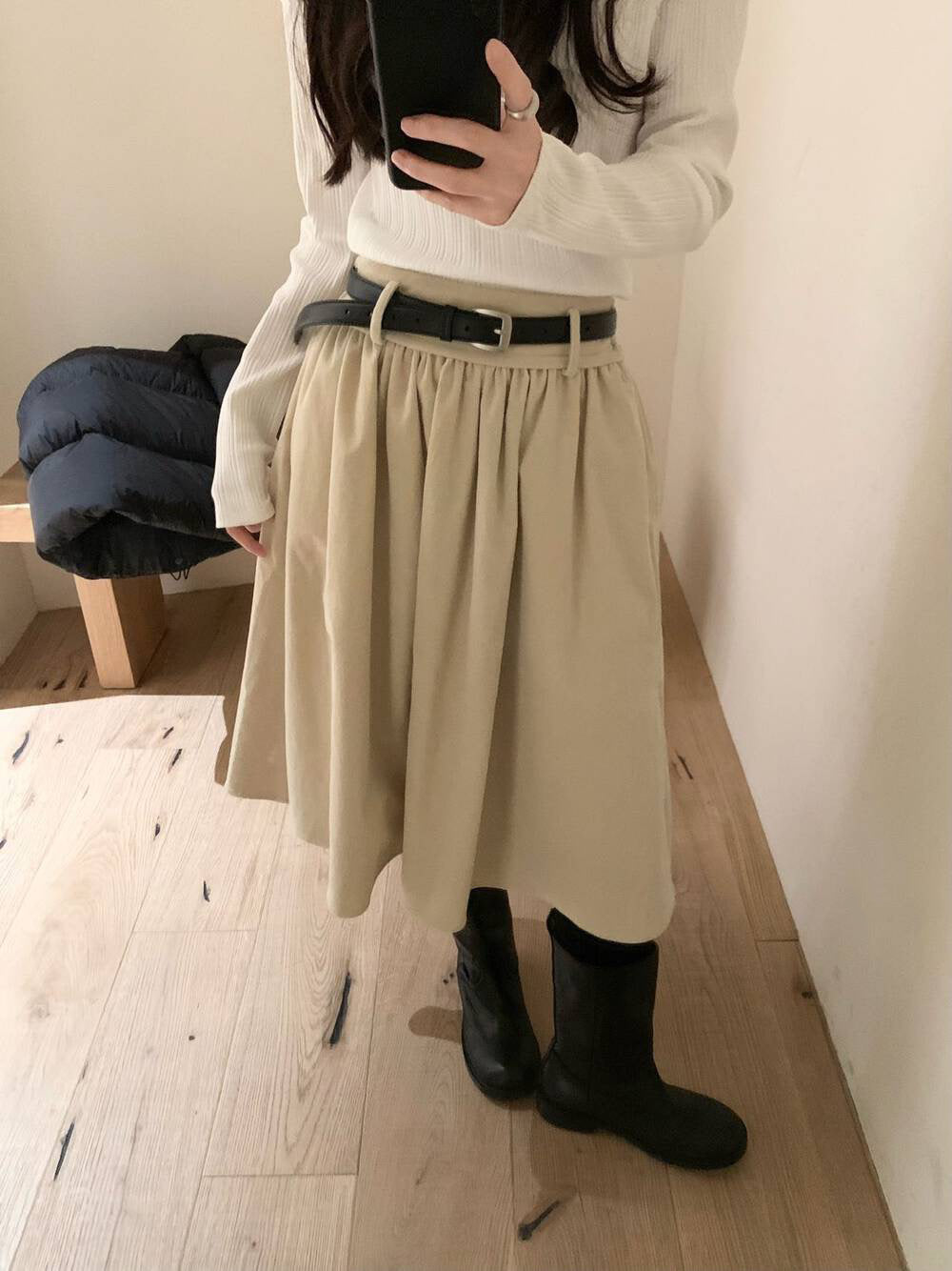 // 高腰壓褶簡約韓風中裙(連腰帶)