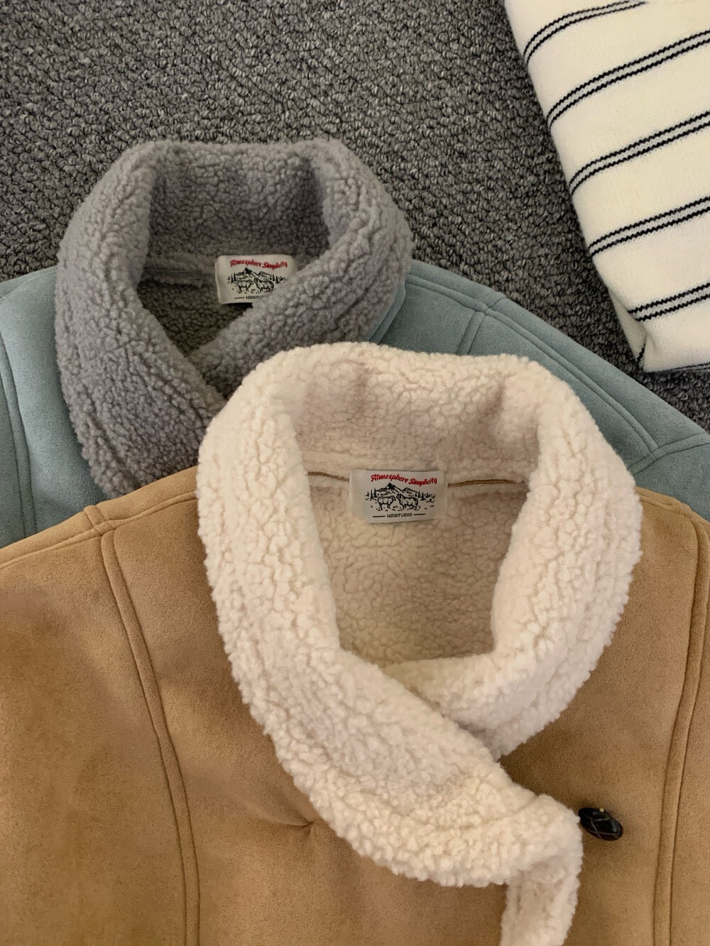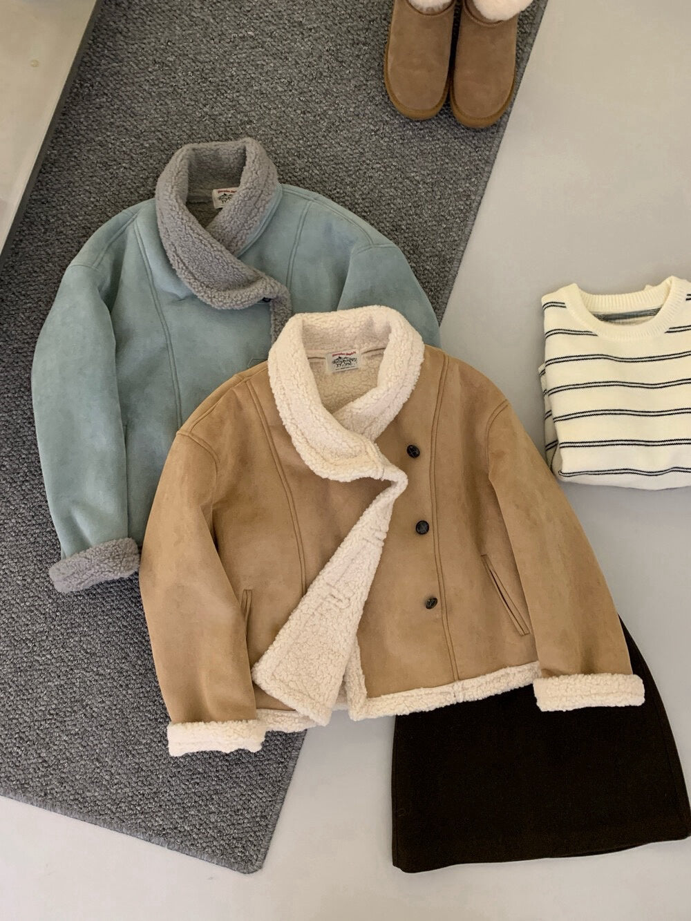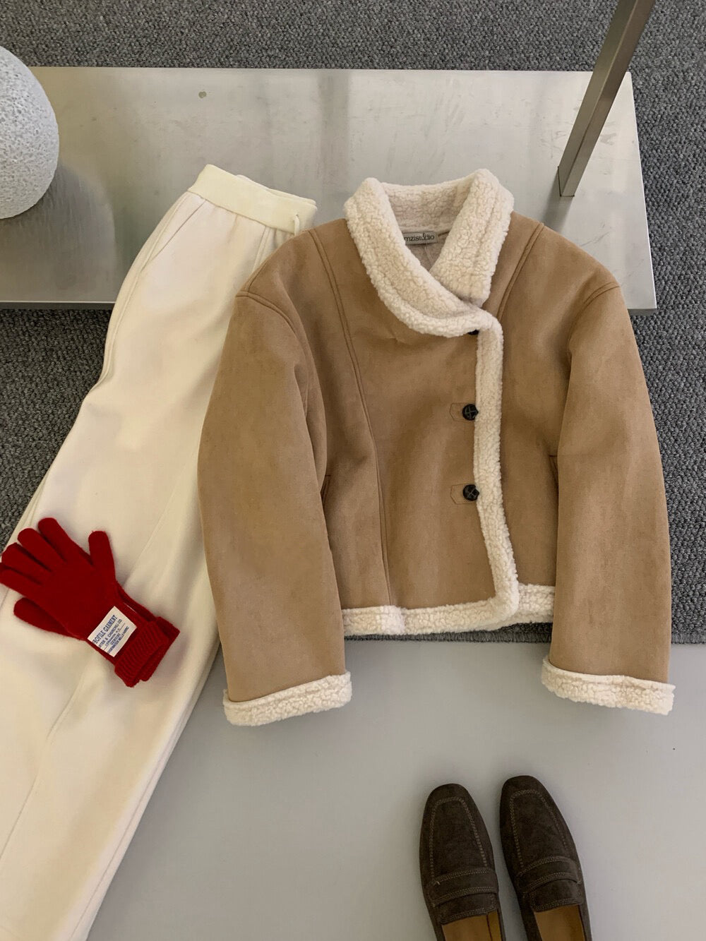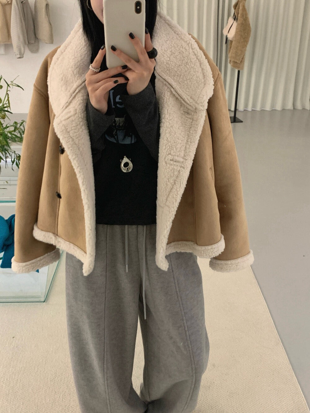 // 麂皮絨加羊羔毛底側排扣帥氣短款外套