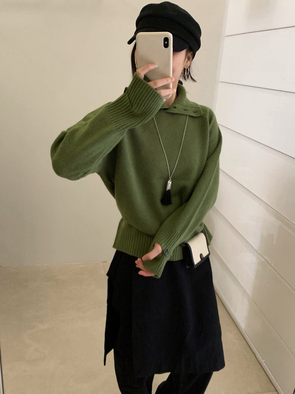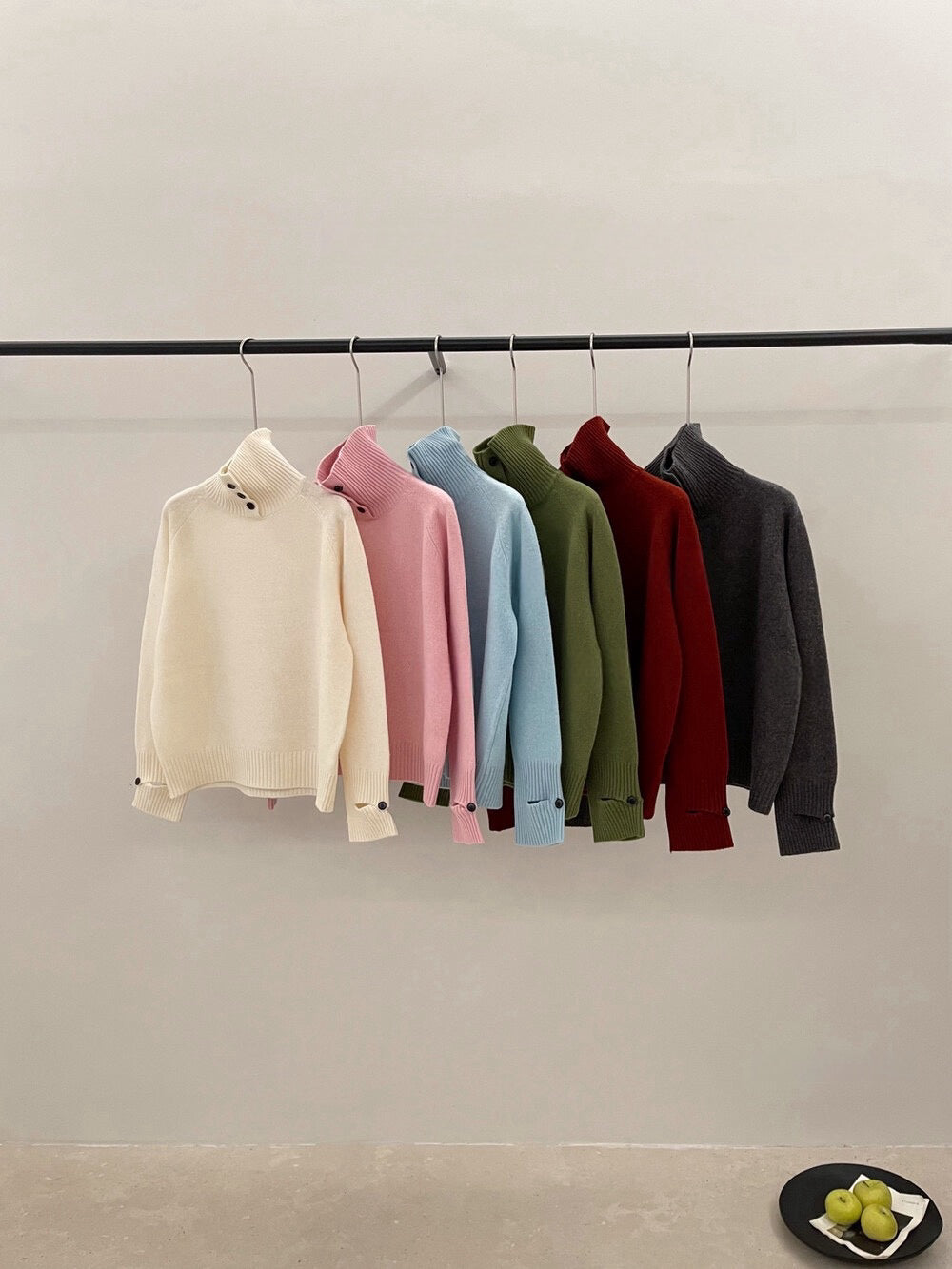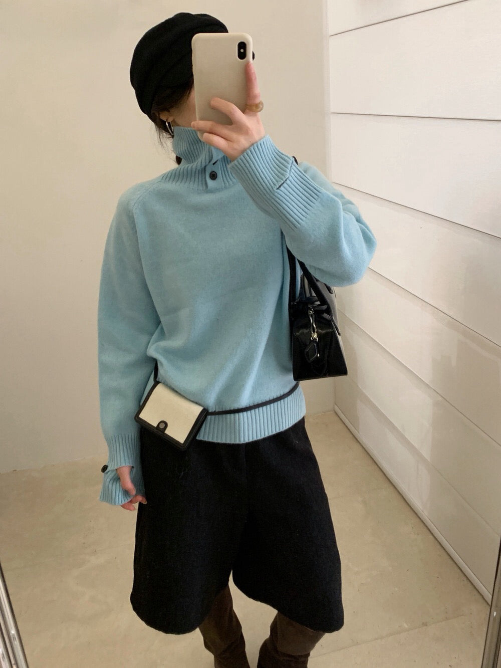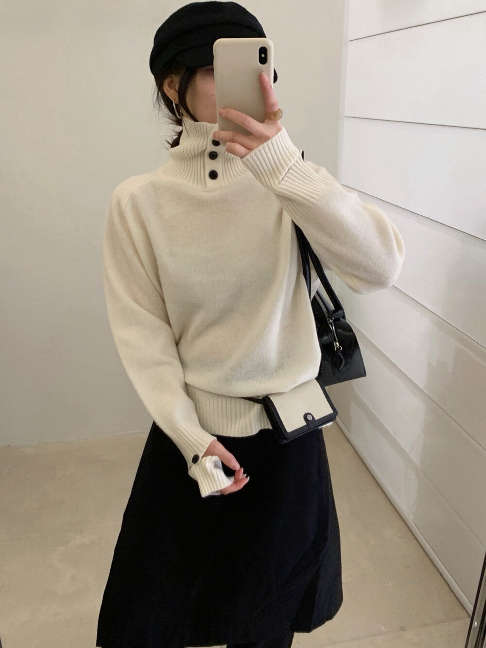 // 100%綿羊毛鈕扣可立領+設計感袖口毛衣
